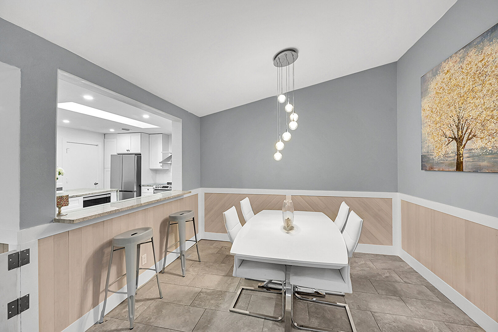 Accent Wall, Drywall, Natural Light, Notable Chandelier, Smoke Carbon Monoxide Detector, Textured Wall, Tile Floor, Wainscot Wall, Wine Cooler, Baseboards Wall, Tile Floor