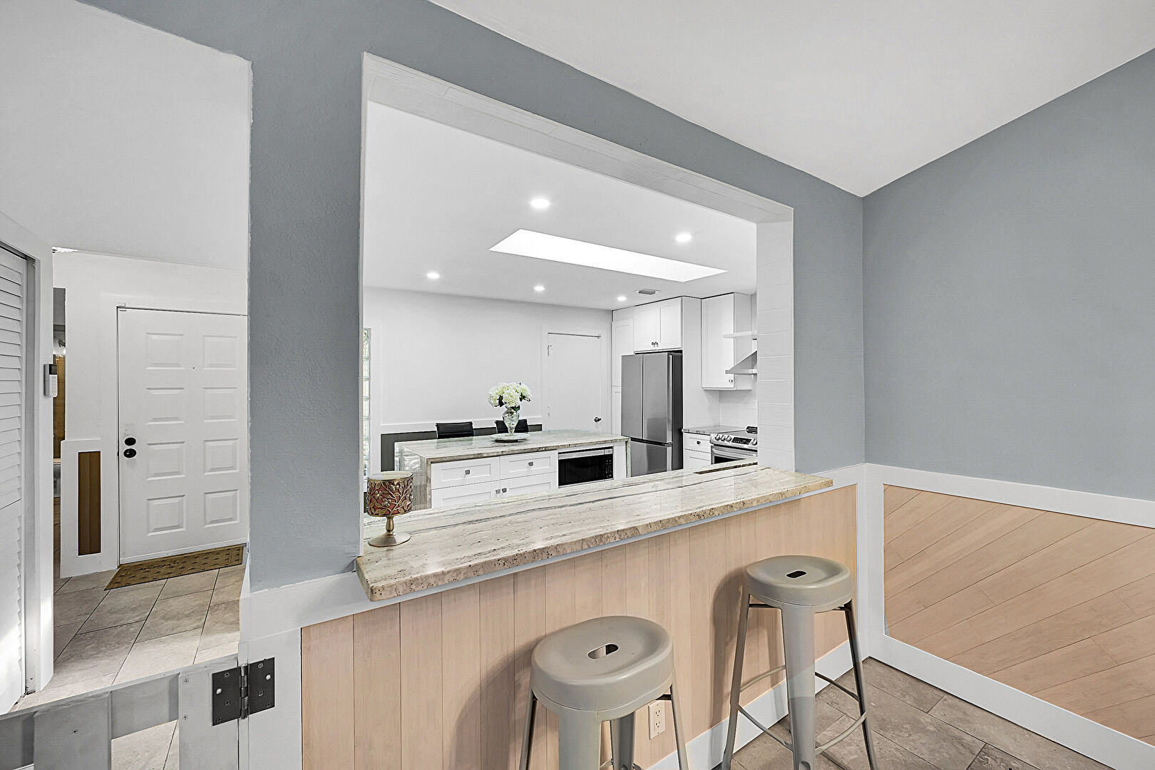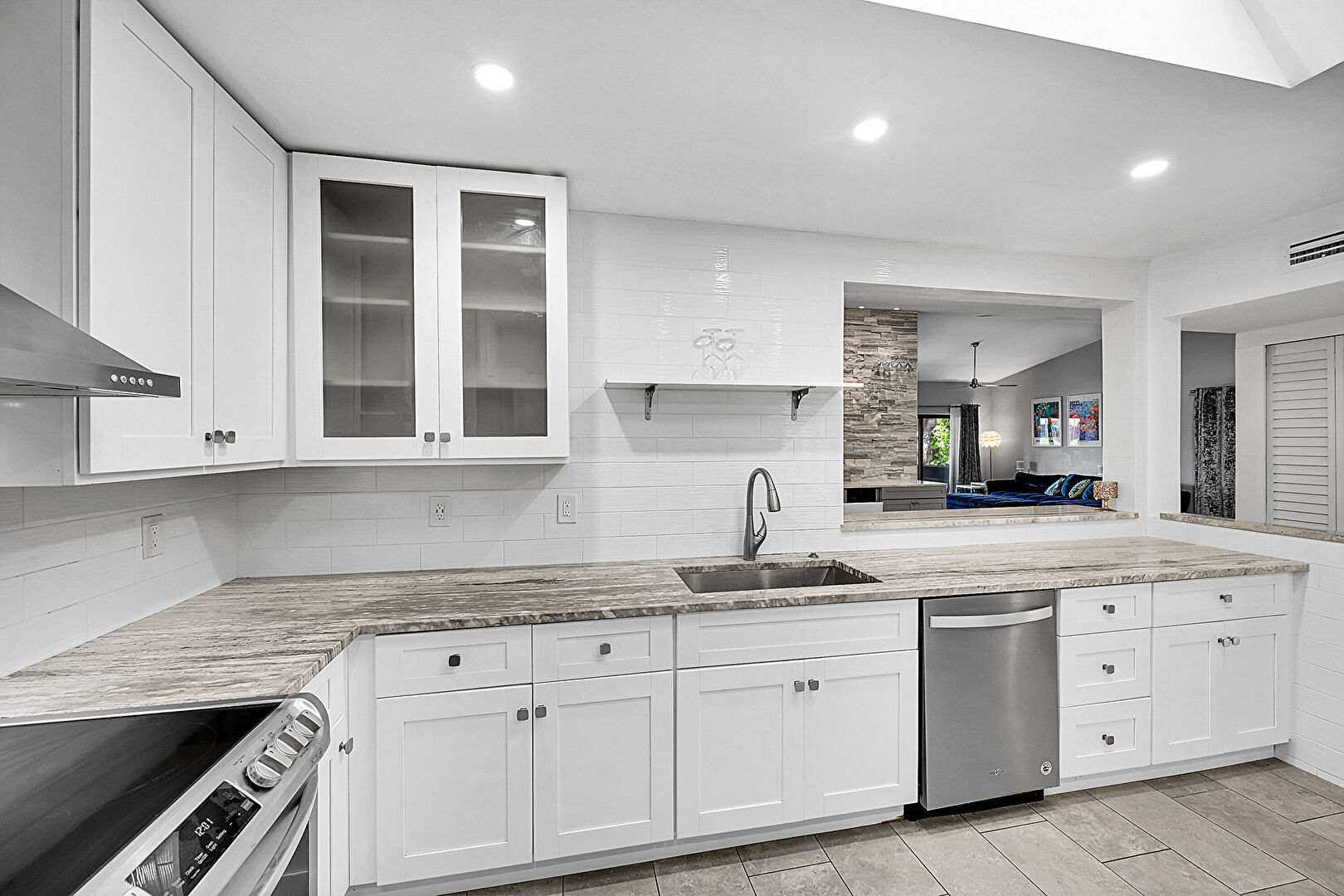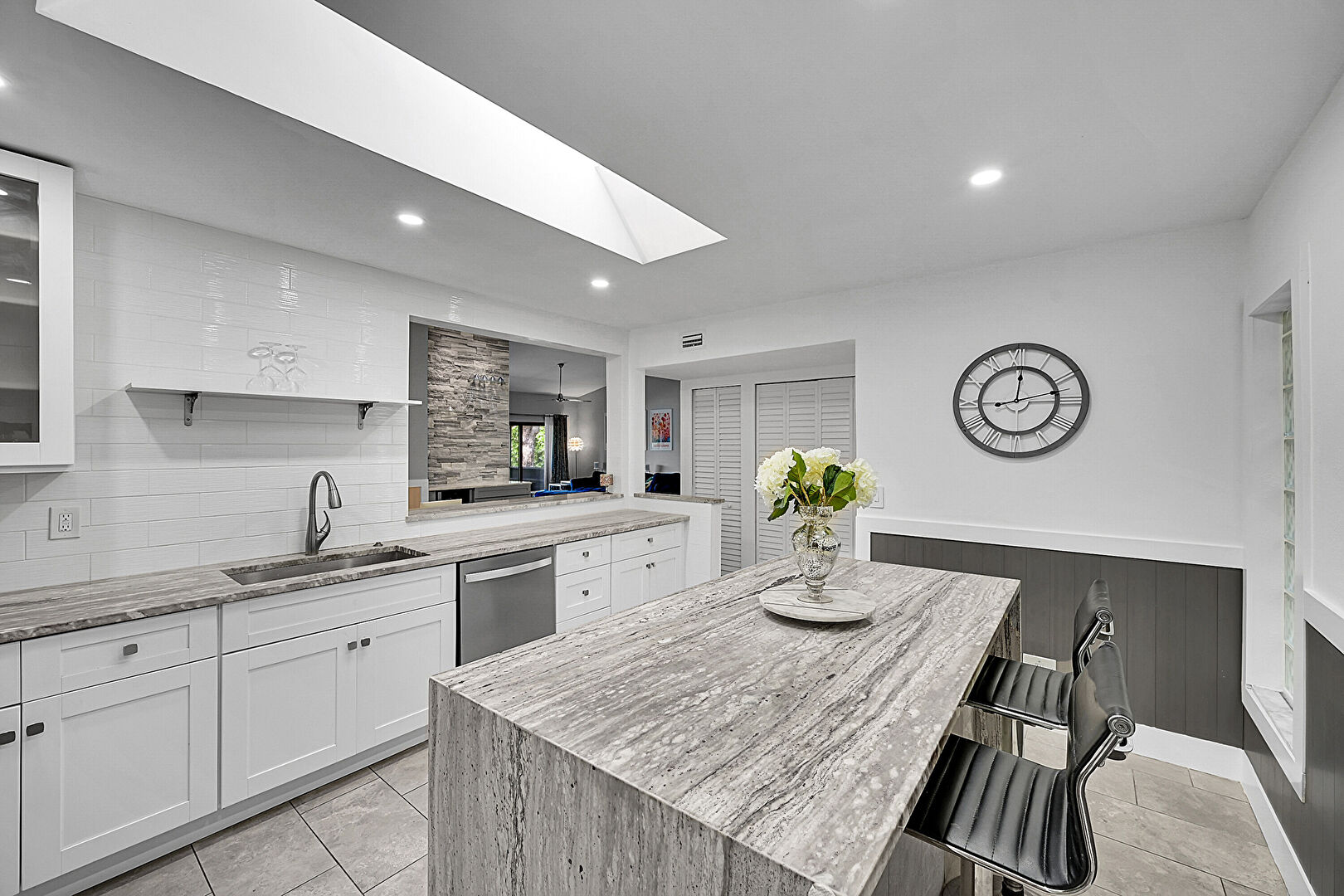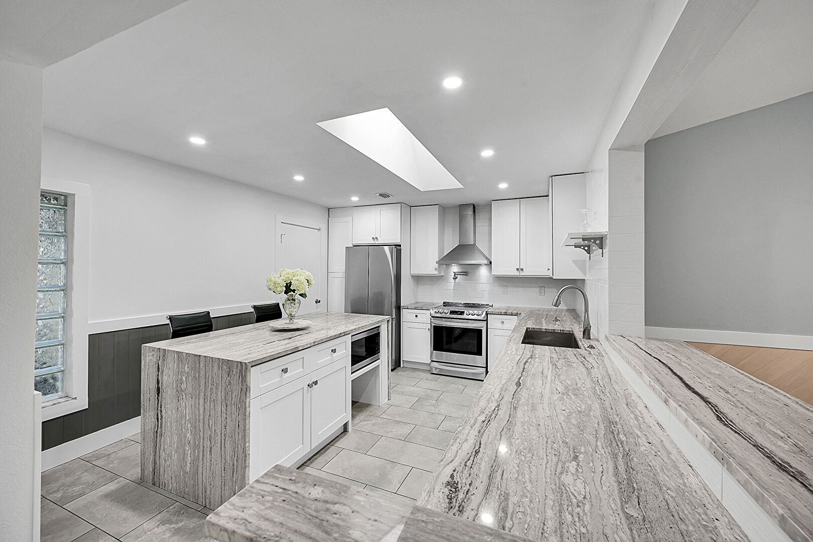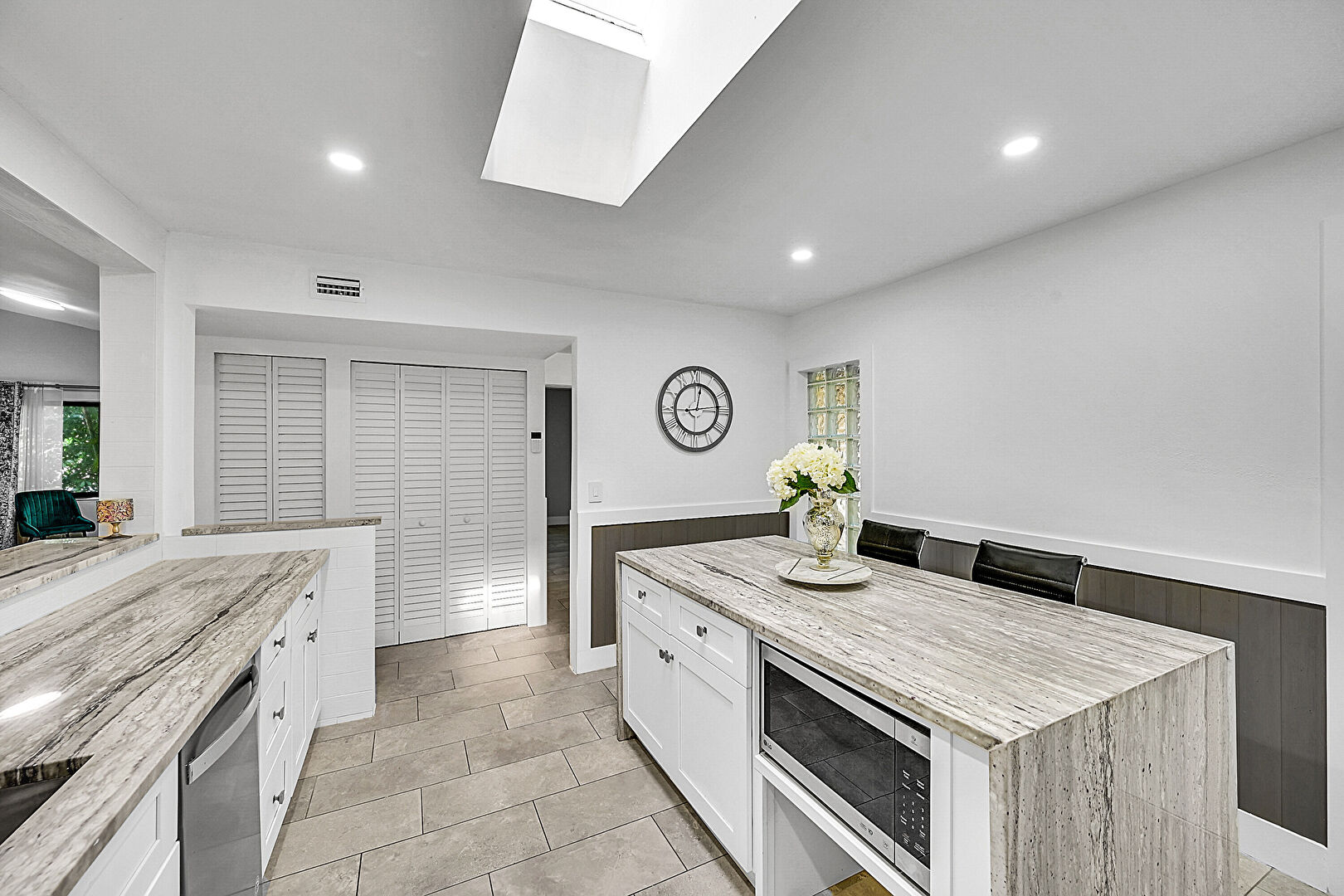 Baseboards Wall, Butcher Block Countertops, Drywall, Glass Insert Cabinets, Kitchen Bar, Kitchen Island, Kitchen Peninsula, L Shaped Kitchen, Natural Light, Open Shelves, Pass Through Window, Pot Filler, Recessed Lighting, Shaker Cabinets, Skylight, Stone Countertops, Tile Floor, U Shaped Kitchen, Vent, Wainscot Wall, Wood Finish Floor, Wood Wall, Butcher Block Countertops, Drywall, Kitchen Peninsula, Pass Through Window, Shaker Cabinets, Stone Countertops