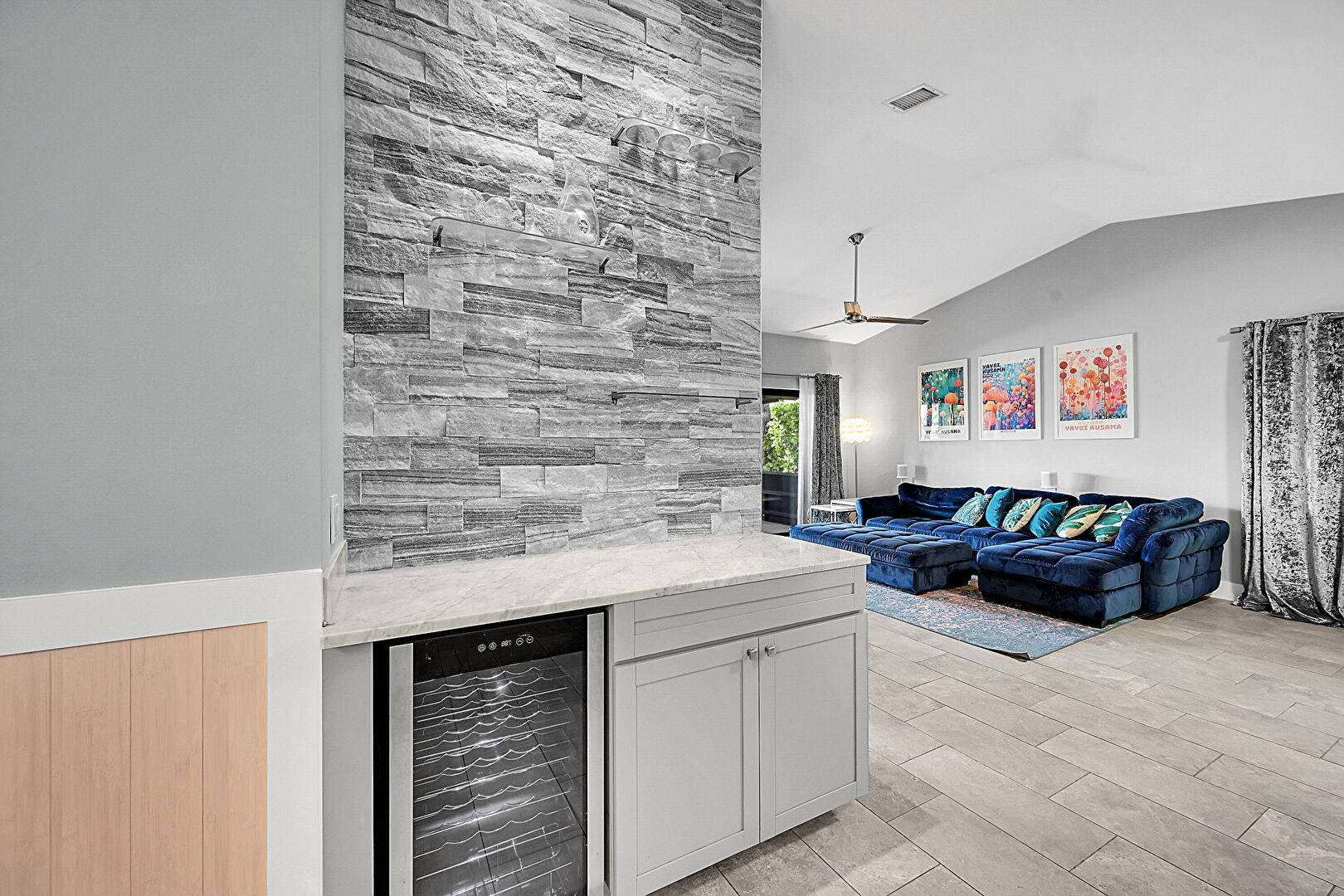 Baseboards Wall, Cathedral Ceiling, Ceiling Fan, Drywall, High Ceiling, Natural Light, Stone Wall, Tile Floor, Vaulted Ceiling, Vent, Wainscot Wall, Wine Cooler, Baseboards Wall, Ceiling Fan, French Doors, Natural Light, Vaulted Ceiling, Vent
