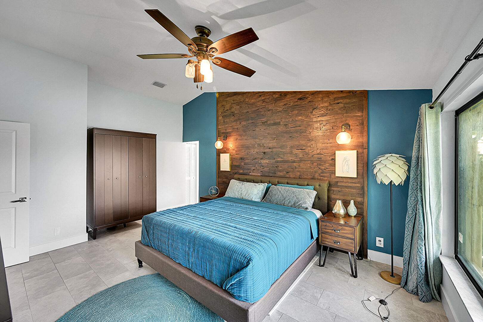 Accent Wall, Baseboards Wall, Ceiling Fan, Drywall, High Ceiling, Natural Light, Tile Floor, Vaulted Ceiling, Vent, Water View, Waterfront, Wood Wall, Ceiling Fan, Natural Light, Tile Floor, Water View