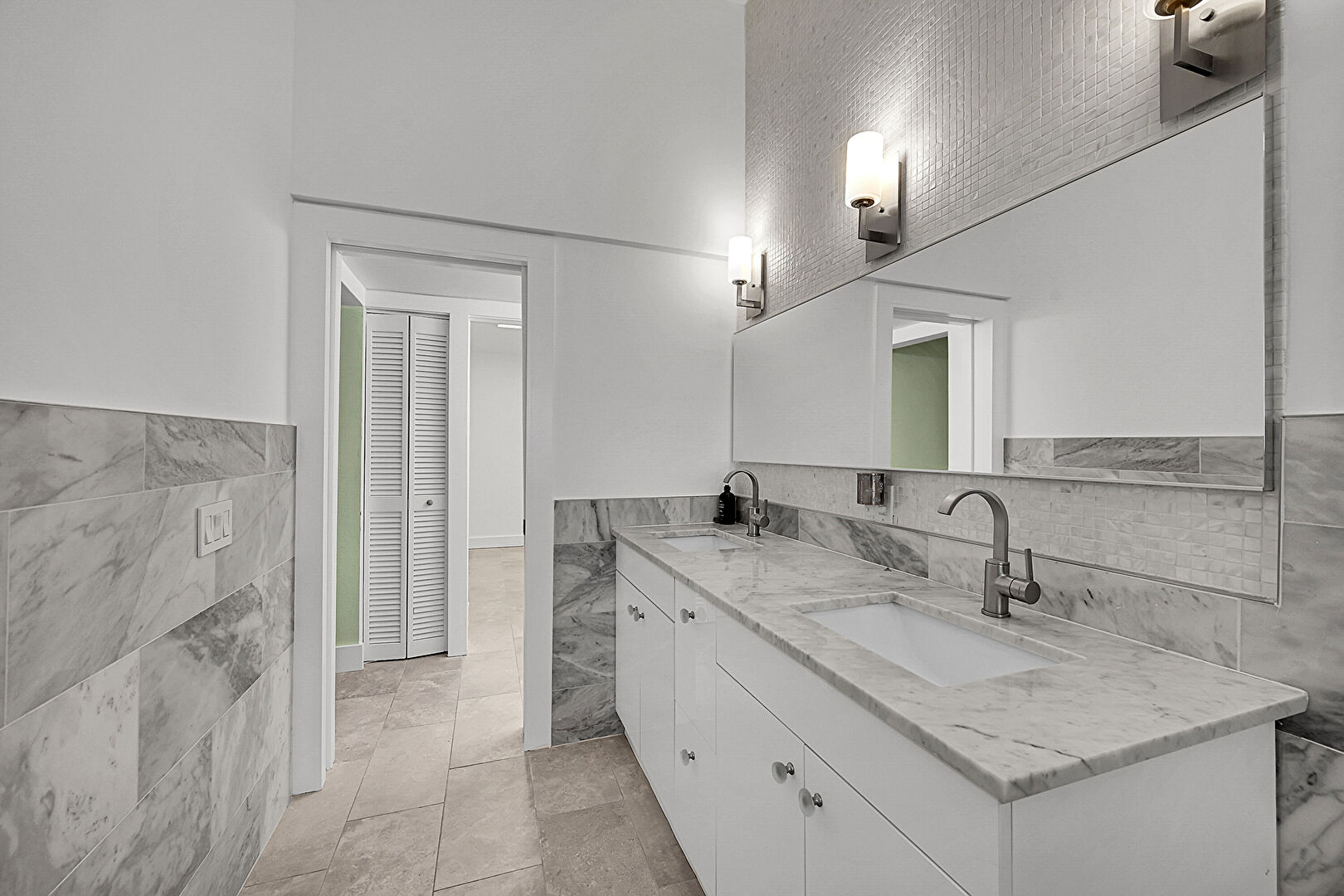 Closet, Double Vanity, Drywall, Full Bathroom, Natural Light, Recessed Lighting, Tile Floor, Tile Wall, Wainscot Wall, Drywall, Full Bathroom, Vent