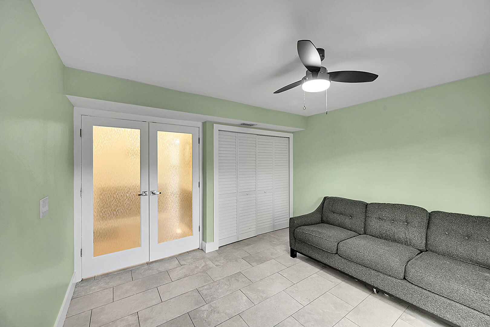 Baseboards Wall, Drywall, Office Area, Two Closets, Vaulted Ceiling, Vent, Vinyl Floor, Ceiling Fan