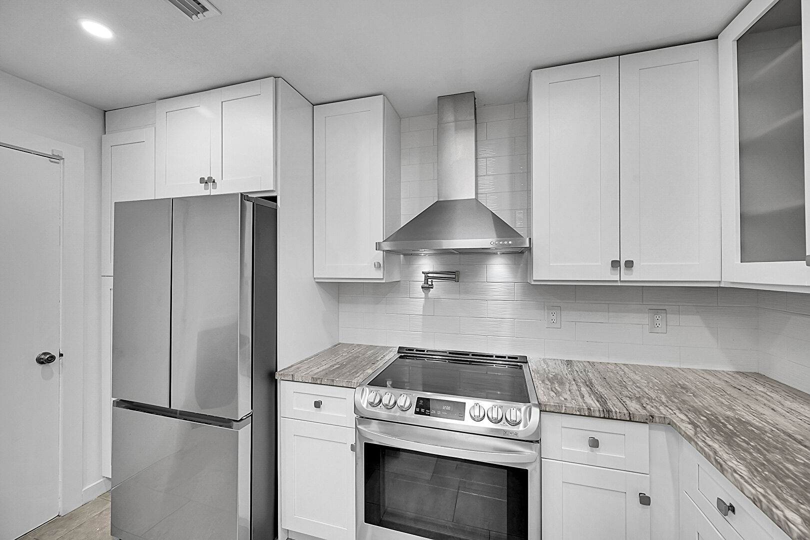 Ceiling Fan, Drywall, High Ceiling, Natural Light, Shaker Cabinets, Stone Countertops, Stone Wall, Vaulted Ceiling, Vent, Wine Cooler, Wood Finish Floor, Gray Cabinets