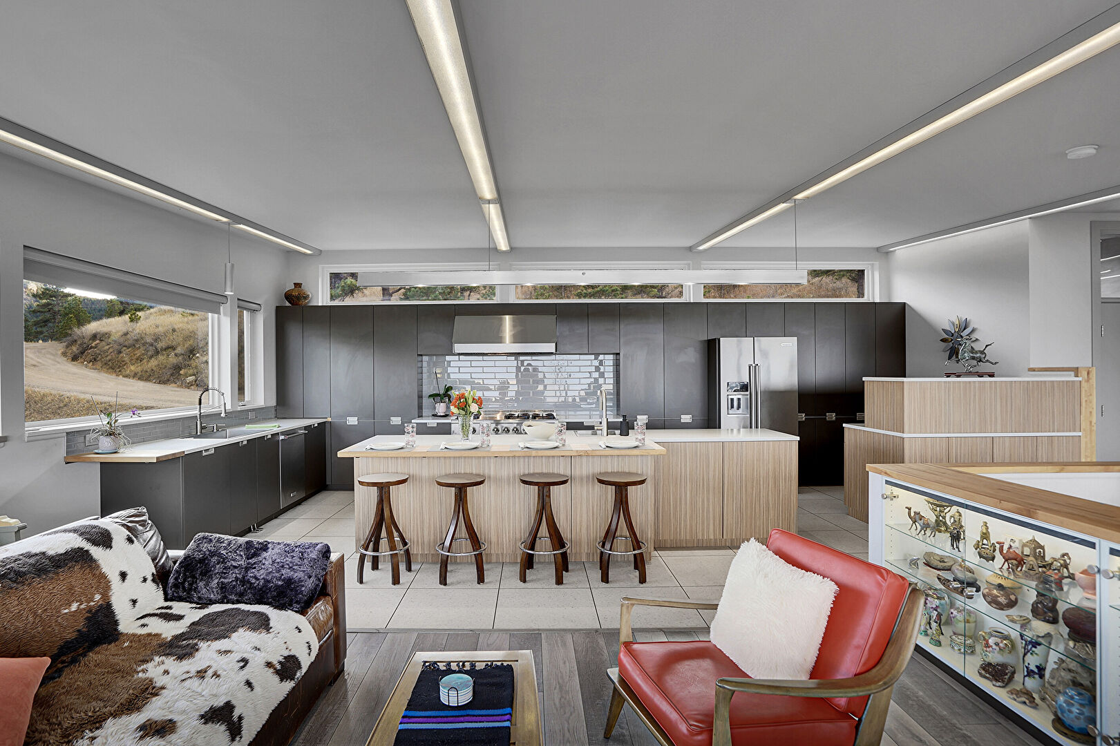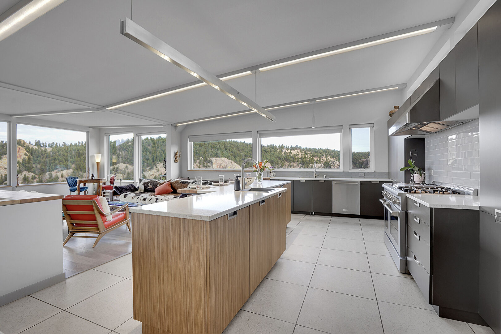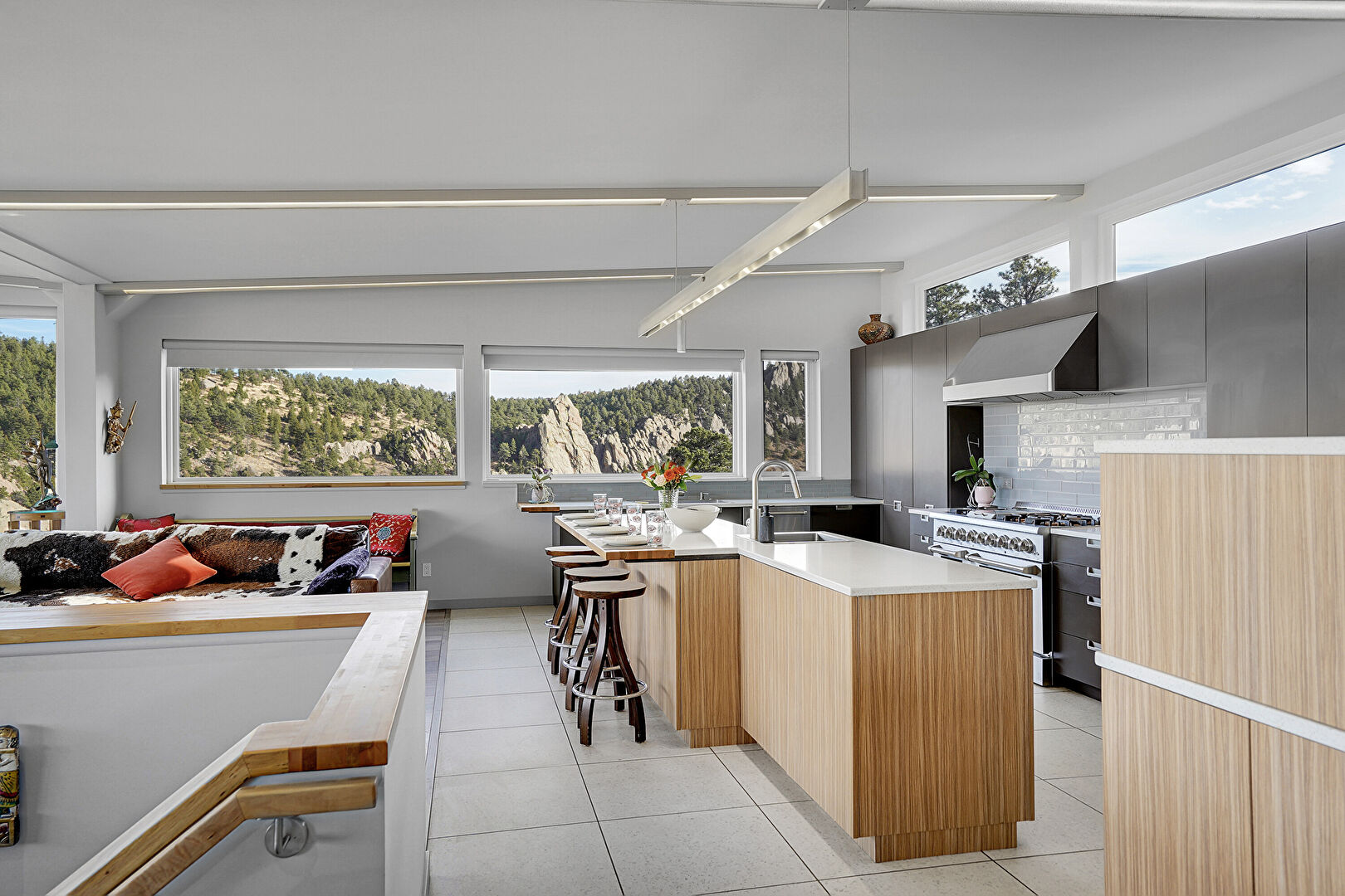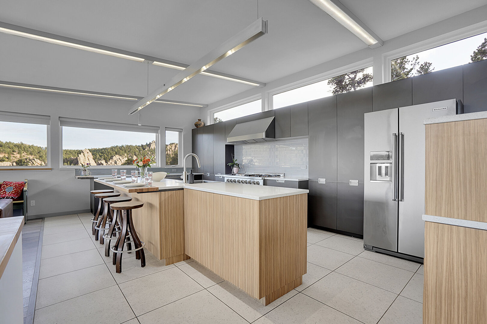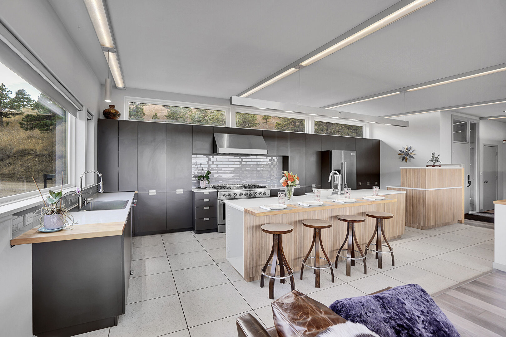 Baseboards Wall, Black Cabinets, Drywall, Flat Panel Cabinets, Floor Ceiling Windows, Gray Cabinets, Kitchen Bar, Kitchen Island, L Shaped Kitchen, Medium Brown Cabinets, Natural Light, Open Shelves, Opens To Living Area, Stone Countertops, Tile Floor, Baseboards Wall, Butcher Block Countertops, Drywall, Flat Panel Cabinets, Kitchen Island, Natural Light, Recessed Lighting, Stone Countertops, Tile Floor