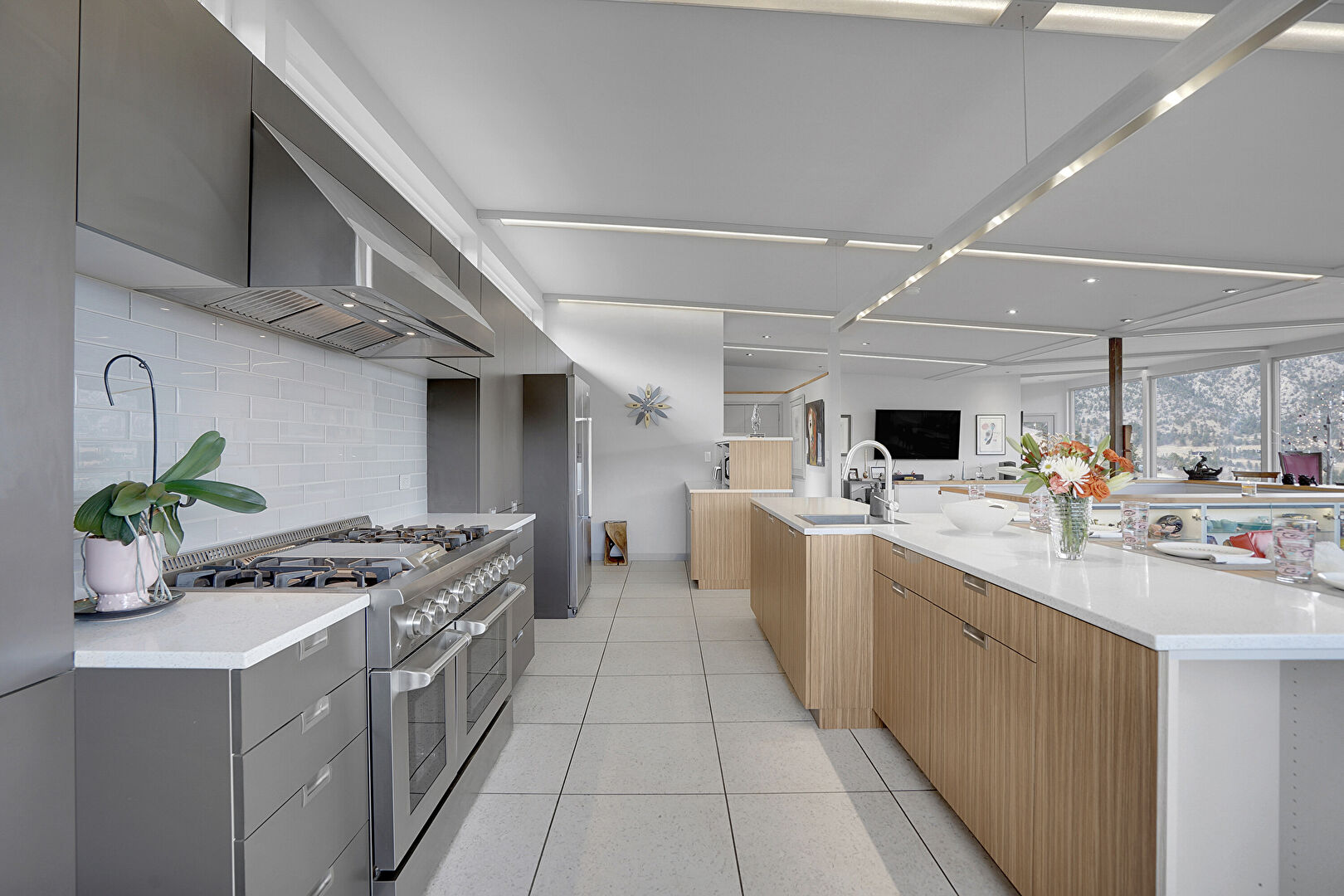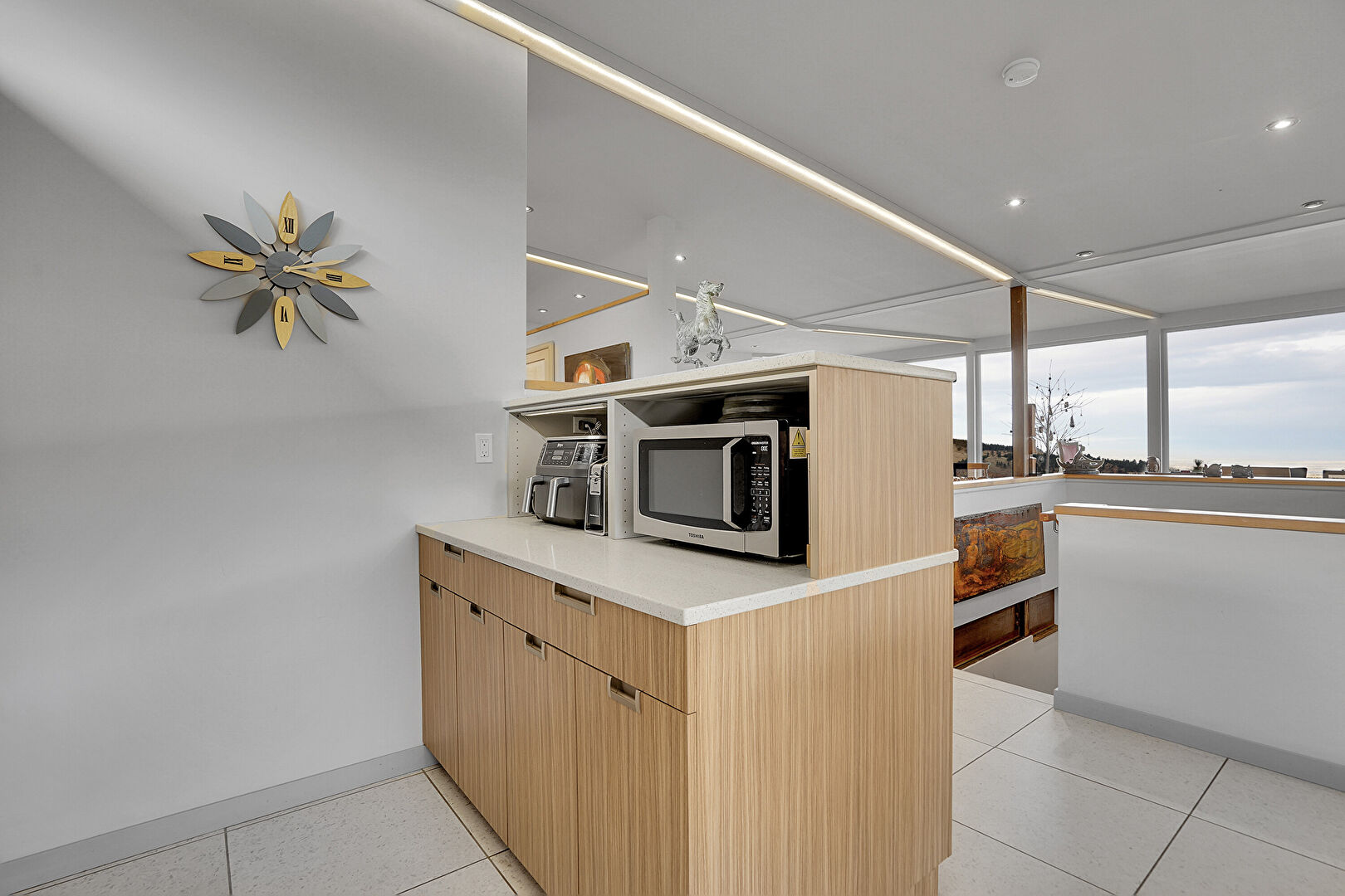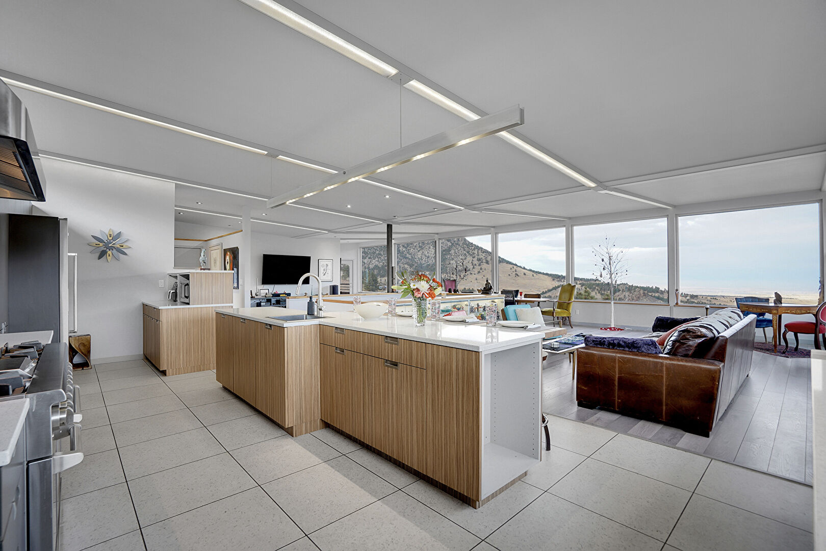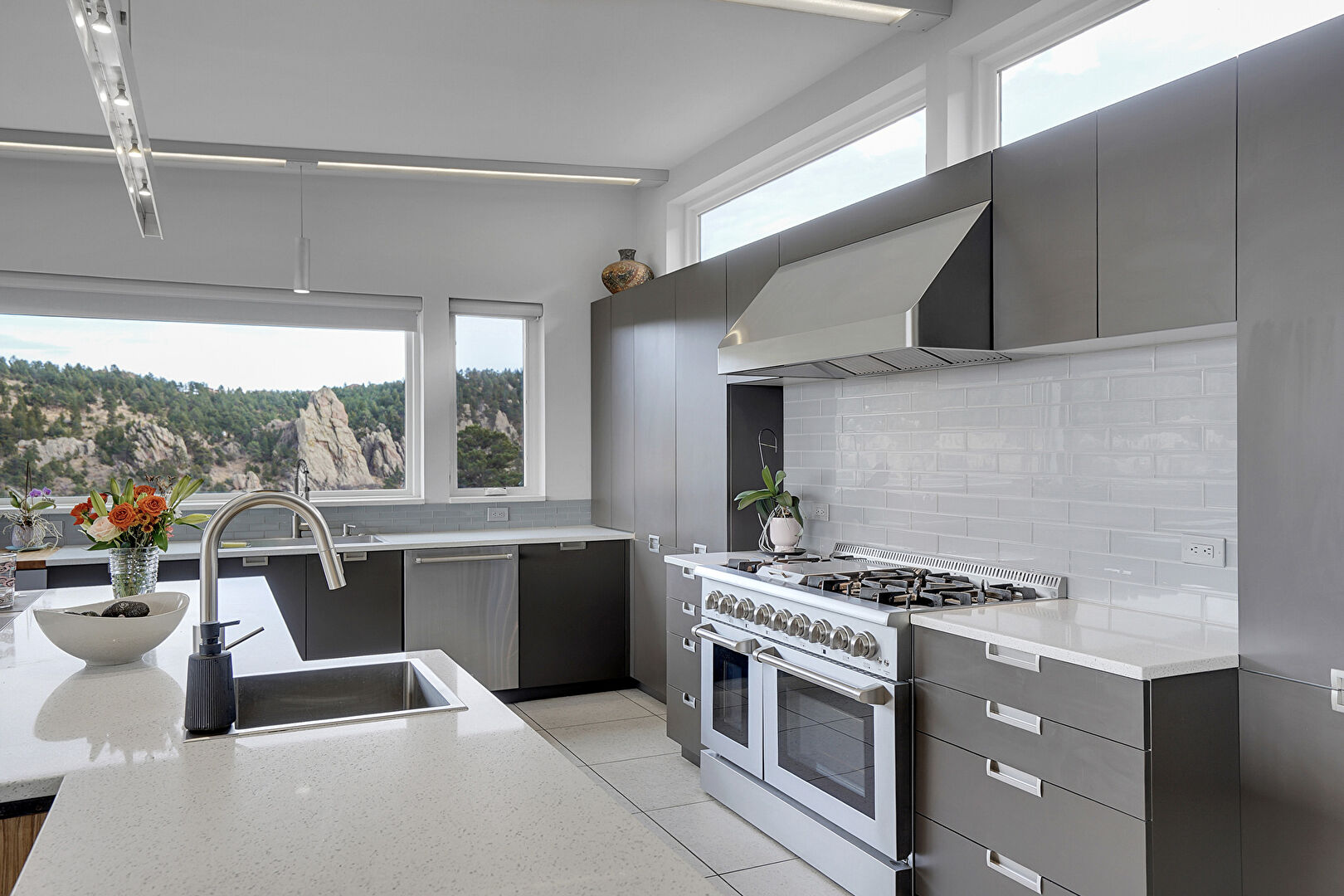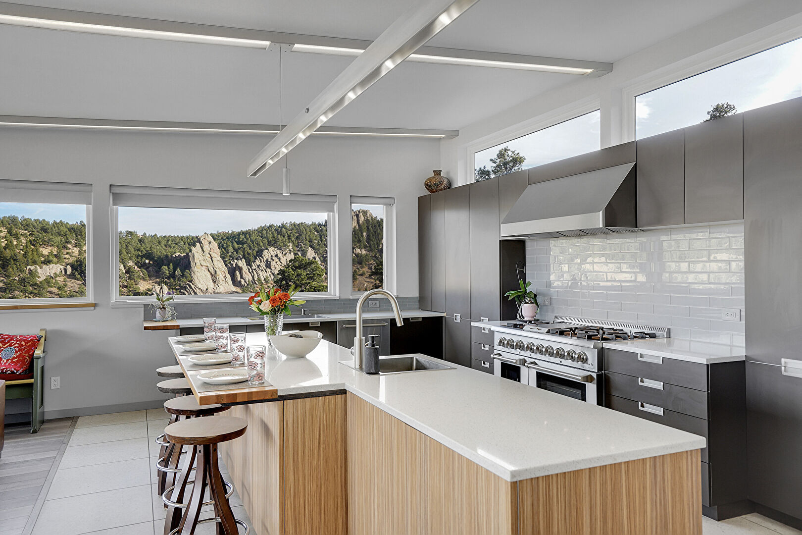Baseboards Wall, Black Cabinets, Drywall, Flat Panel Cabinets, Floor Ceiling Windows, Gray Cabinets, Kitchen Bar, Kitchen Island, L Shaped Kitchen, Medium Brown Cabinets, Natural Light, Open Shelves, Opens To Living Area, Stone Countertops, Tile Floor, Baseboards Wall, Butcher Block Countertops, Drywall, Flat Panel Cabinets, Kitchen Island, Natural Light, Recessed Lighting, Stone Countertops, Tile Floor