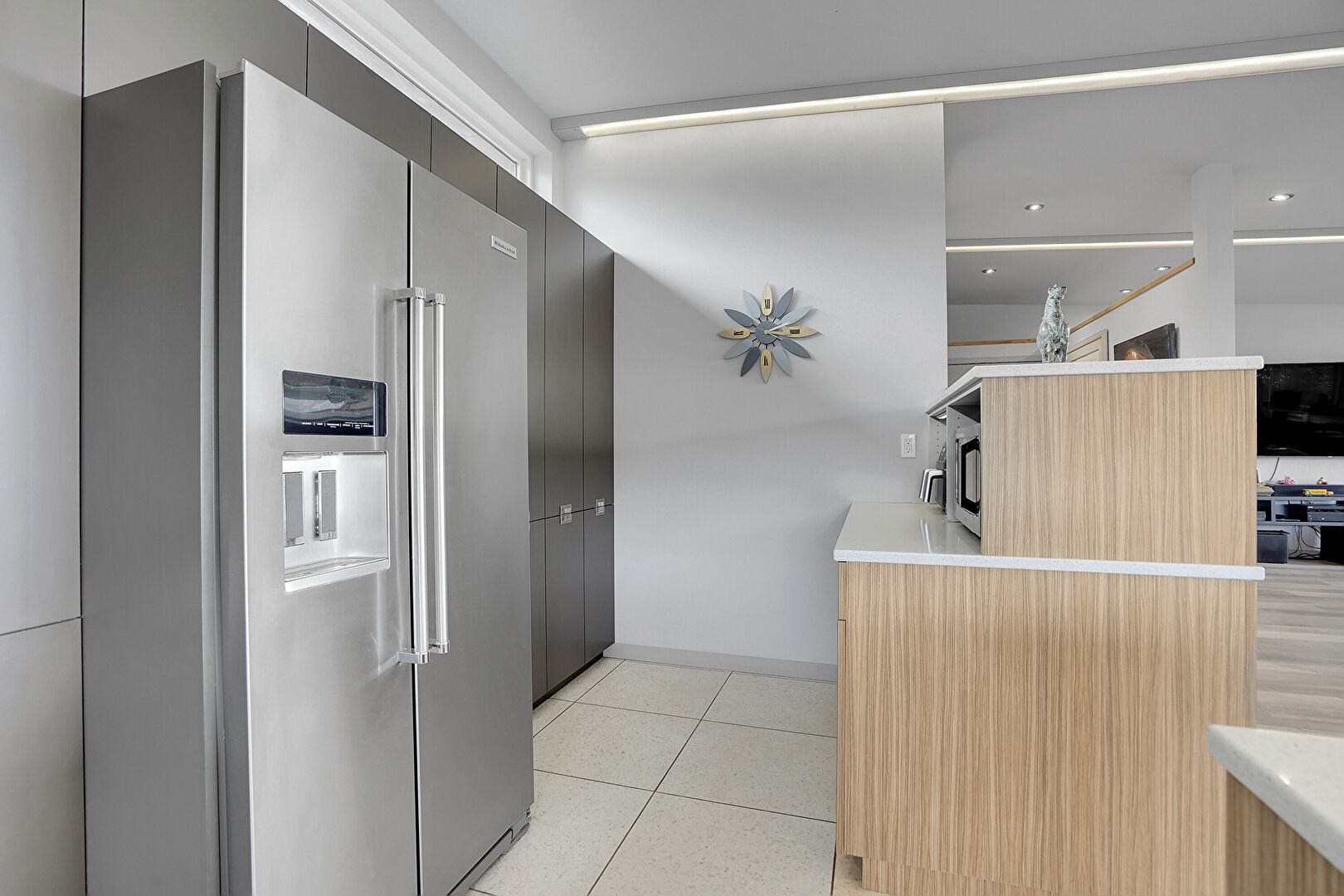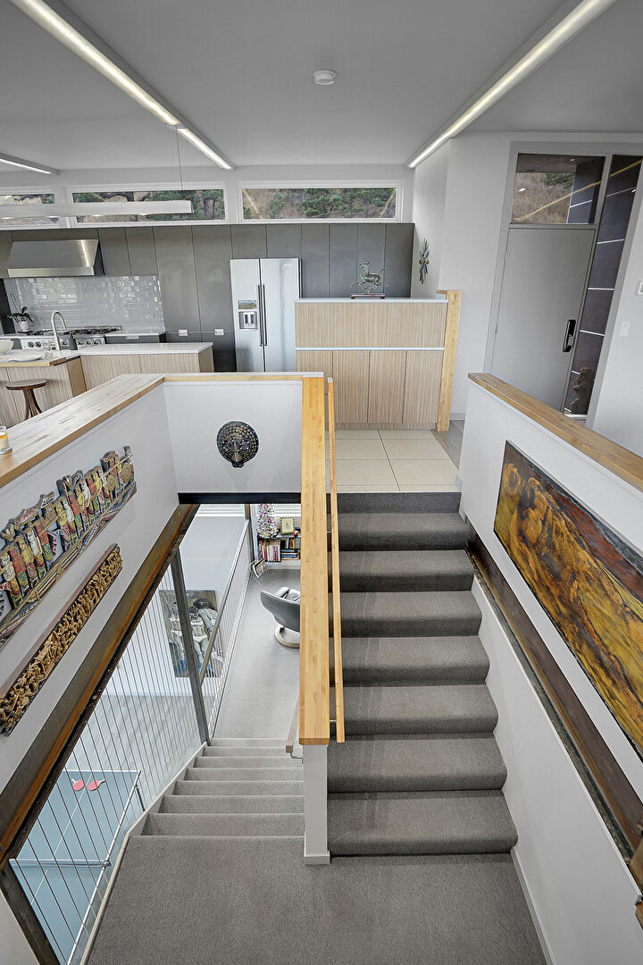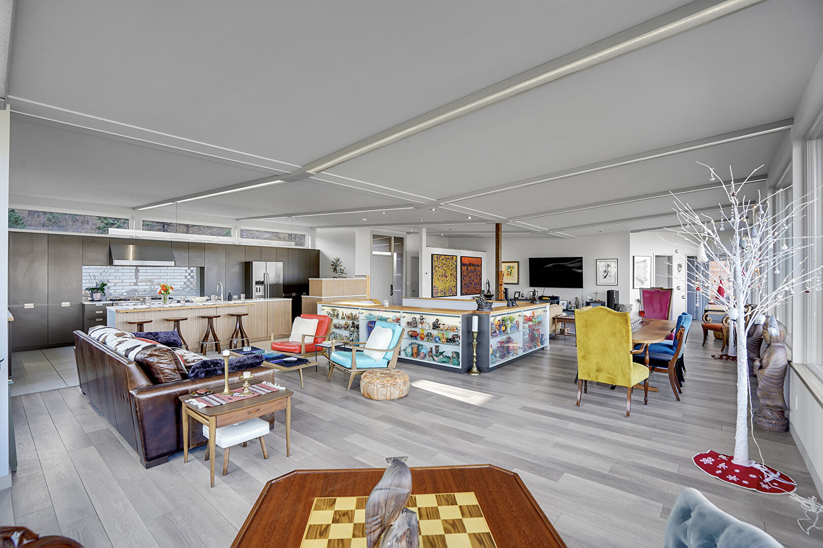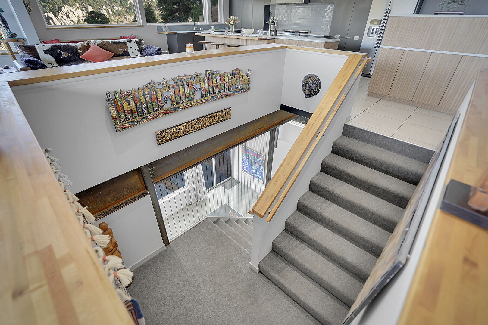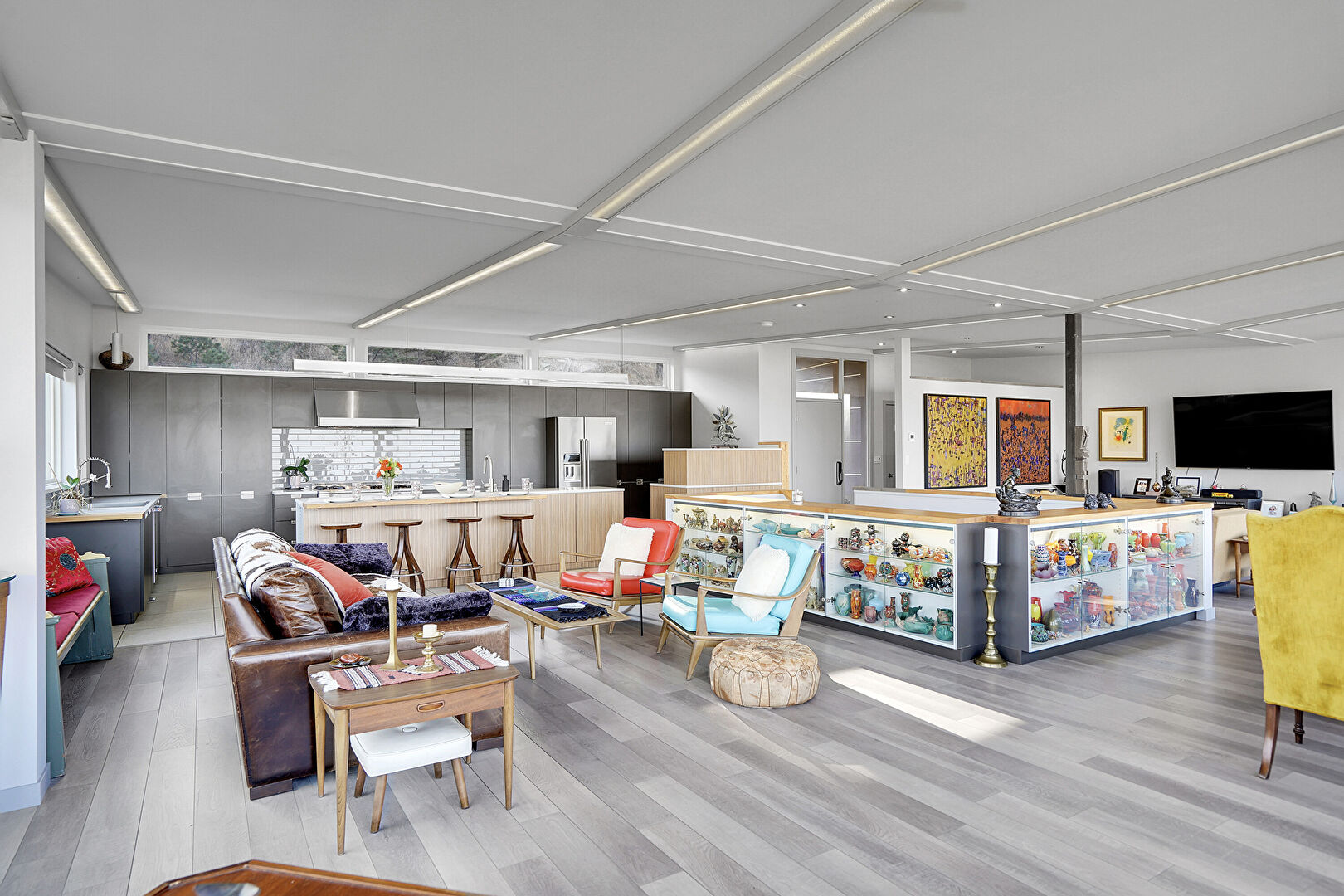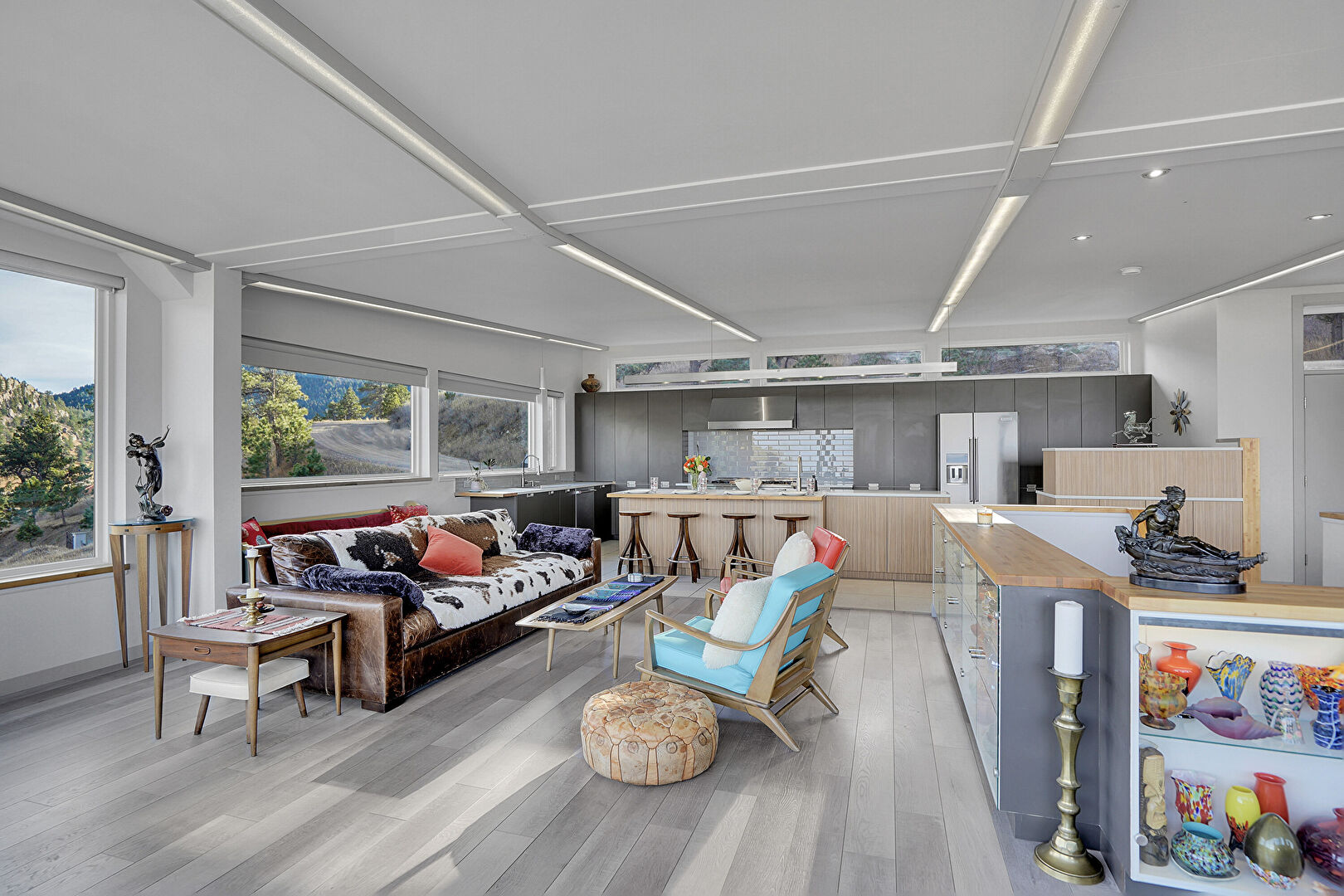 Baseboards Wall, Black Cabinets, Drywall, Flat Panel Cabinets, Floor Ceiling Windows, Gray Cabinets, Kitchen Bar, Kitchen Island, L Shaped Kitchen, Medium Brown Cabinets, Natural Light, Open Shelves, Opens To Living Area, Stone Countertops, Tile Floor, Baseboards Wall, Butcher Block Countertops, Drywall, Flat Panel Cabinets, Kitchen Island, Natural Light, Recessed Lighting, Stone Countertops, Tile Floor