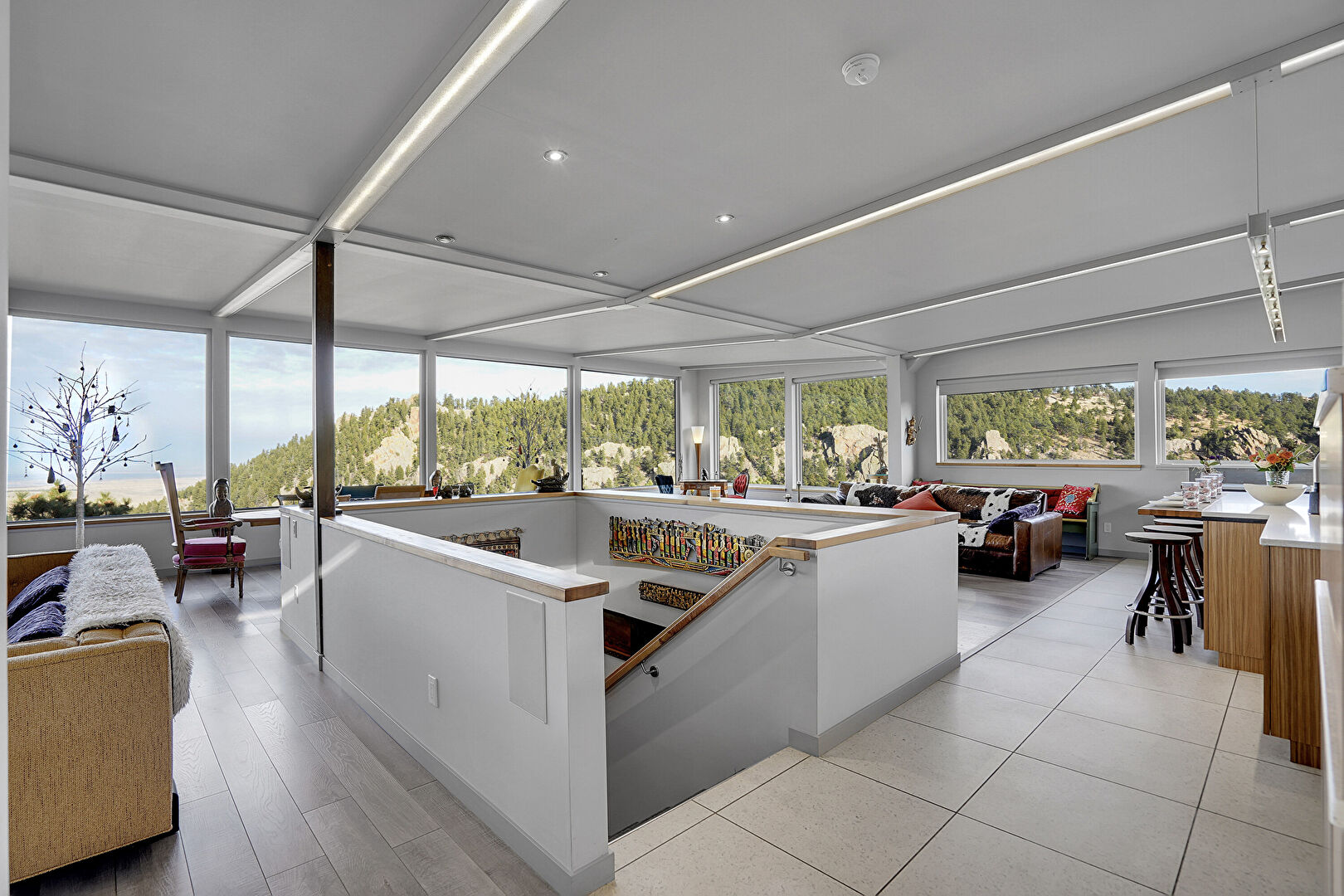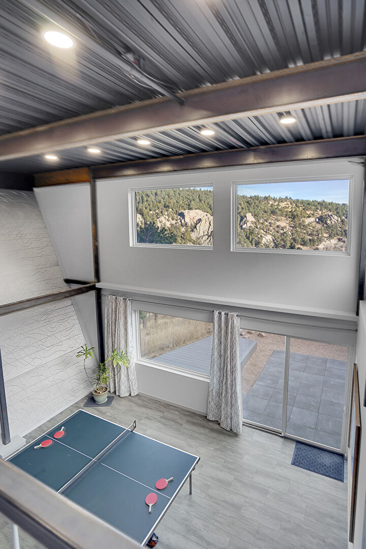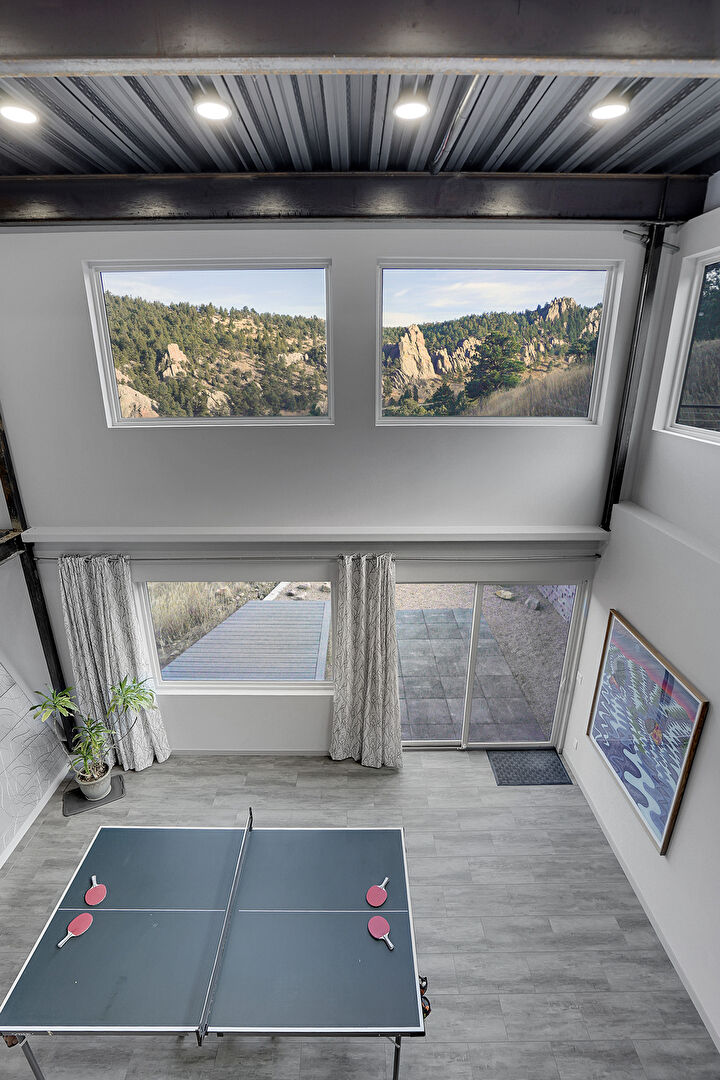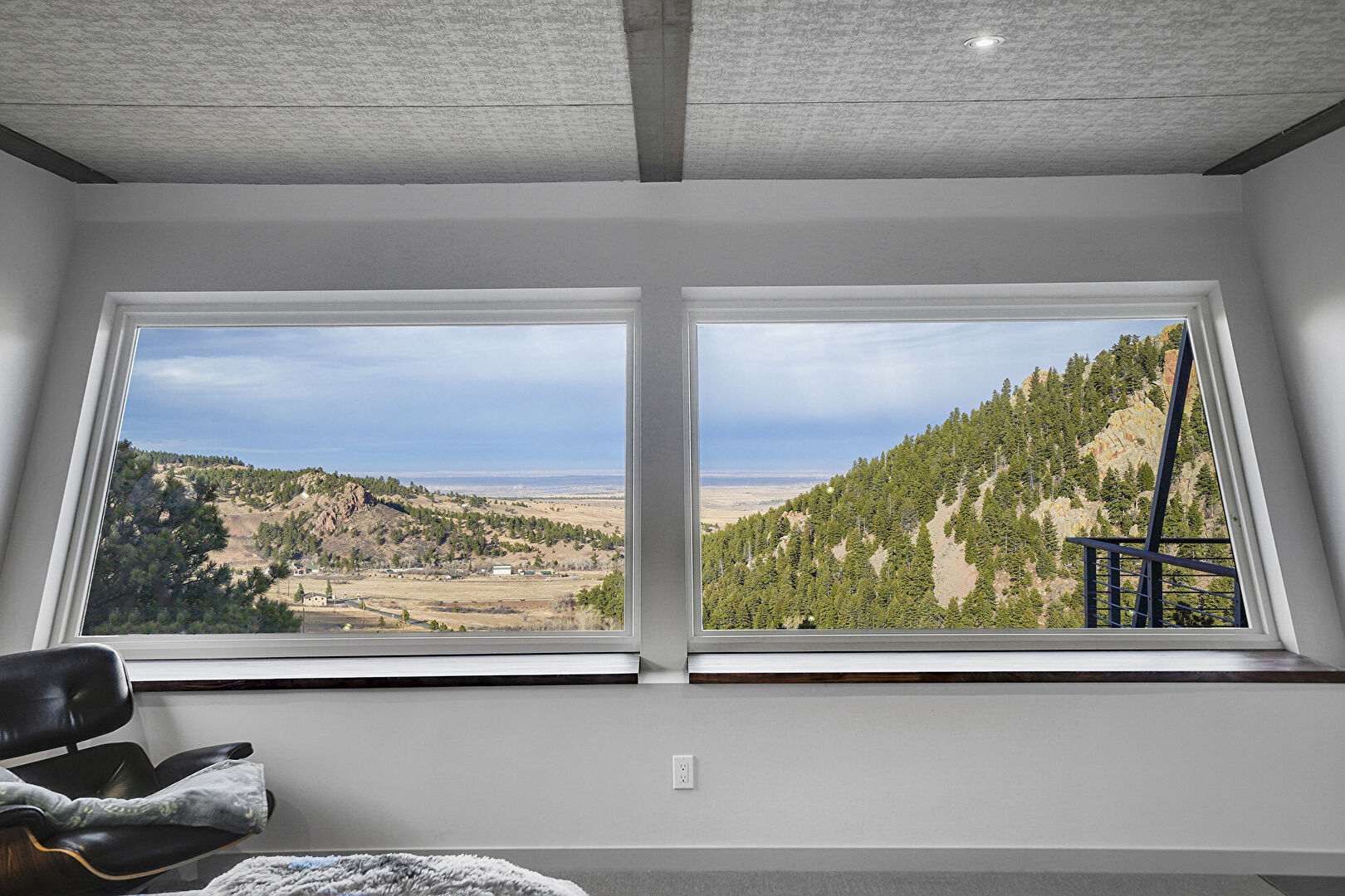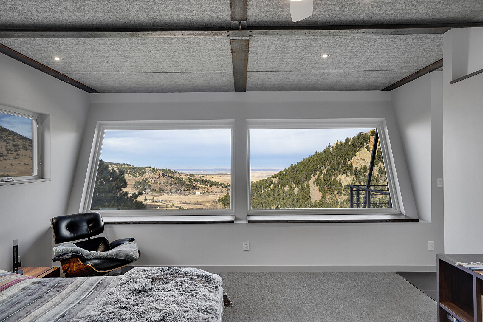 Baseboards Wall, Drywall, Floor Ceiling Windows, Forest View, Mountain View, Natural Light, Recessed Lighting, Vaulted Ceiling, Wood Finish Floor, Drywall, Natural Light, Wood Finish Floor