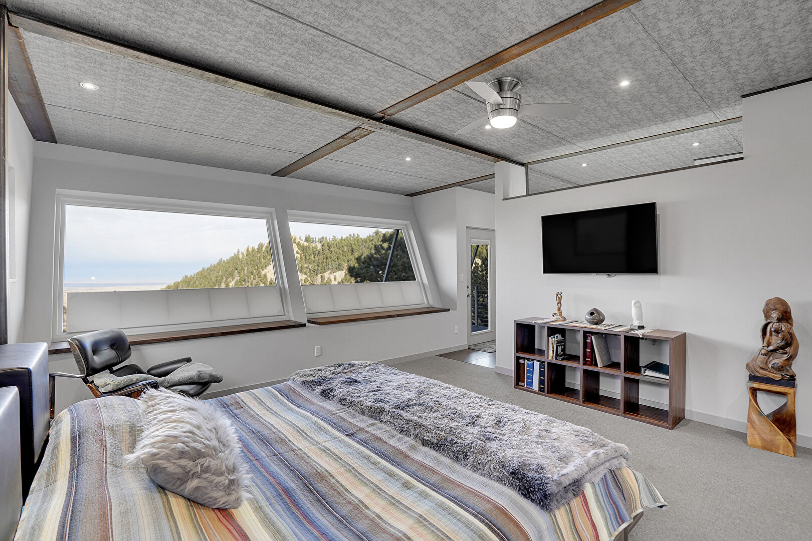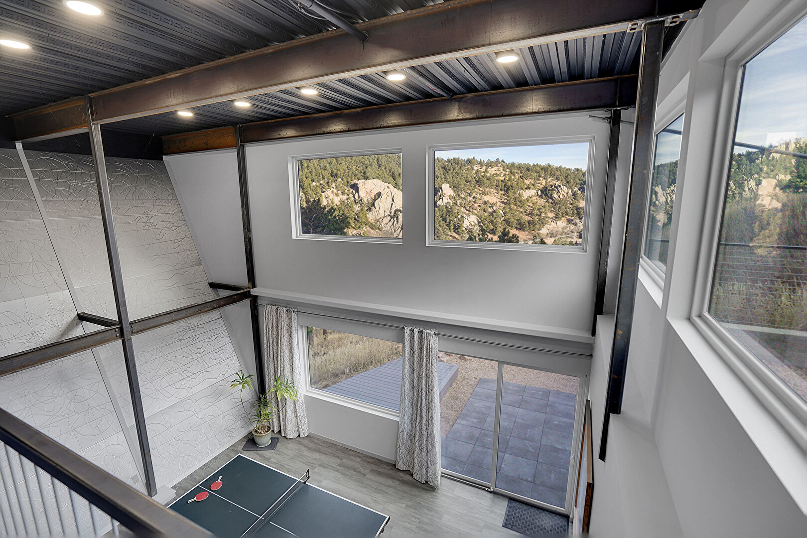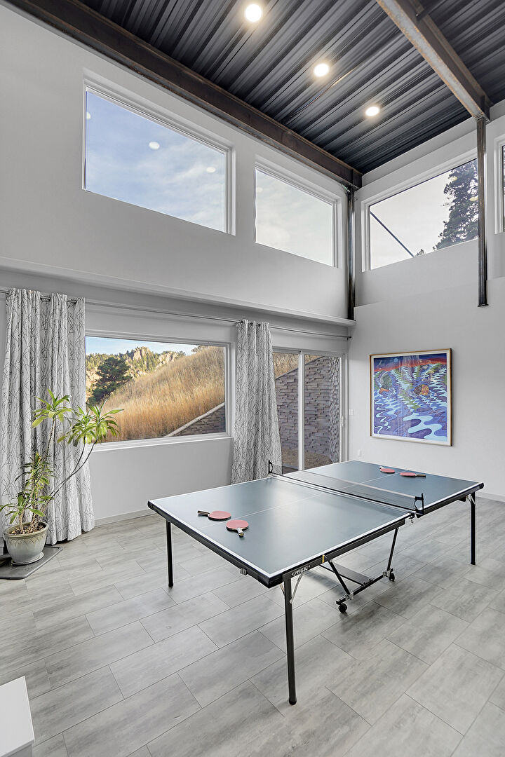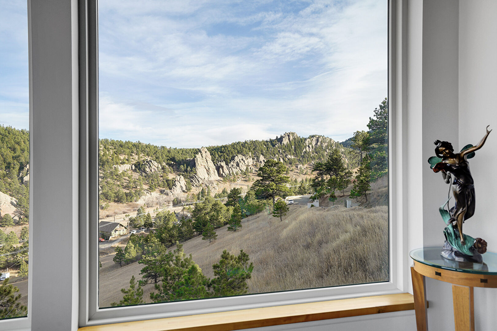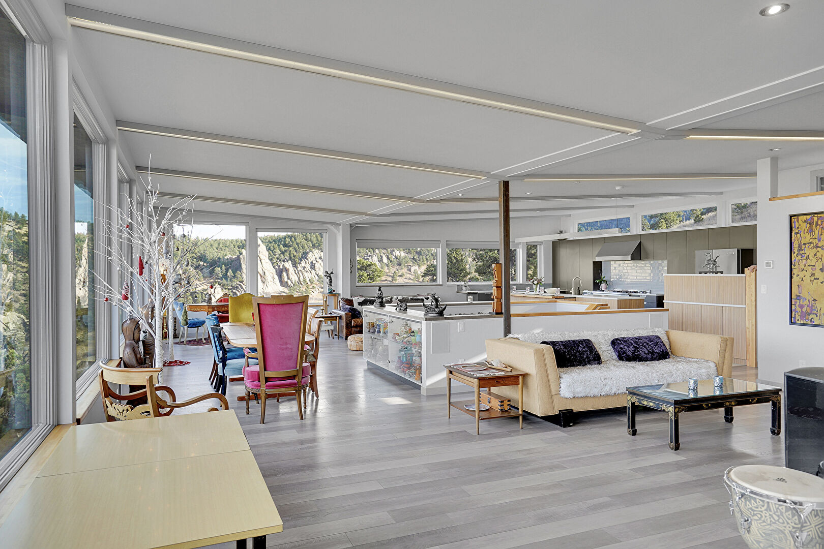 Baseboards Wall, Drywall, Floor Ceiling Windows, Forest View, Mountain View, Natural Light, Recessed Lighting, Vaulted Ceiling, Wood Finish Floor, Drywall, Natural Light, Wood Finish Floor