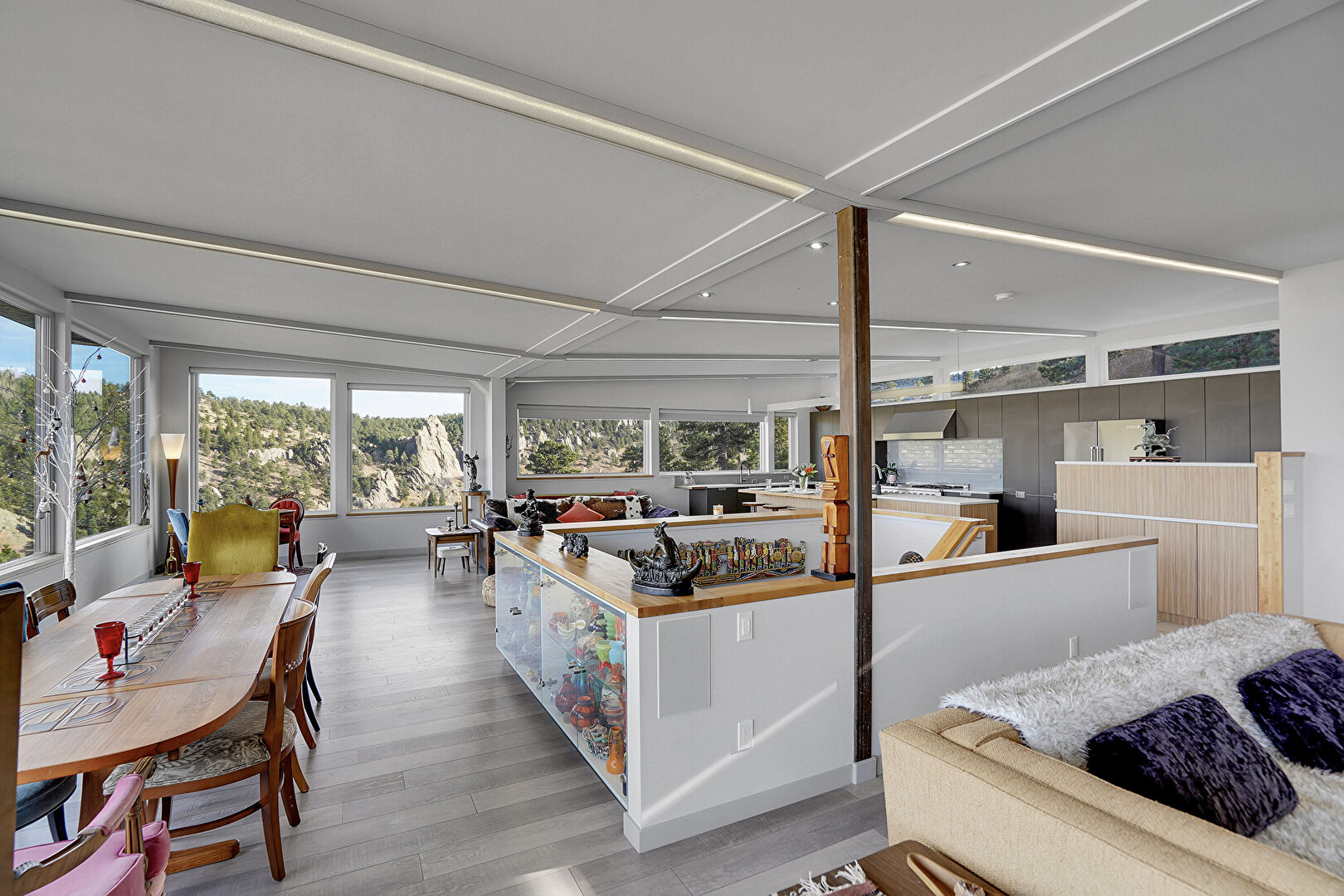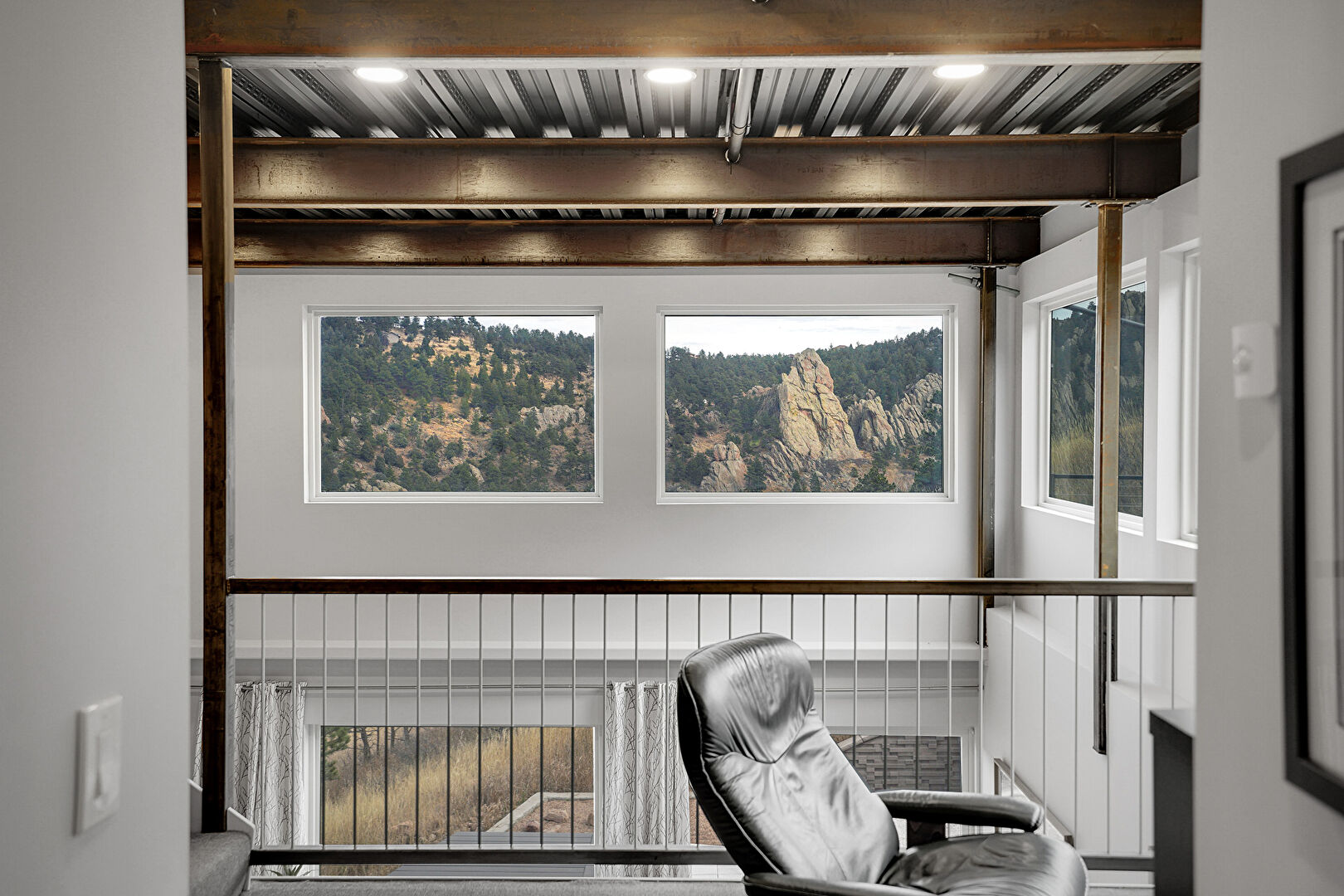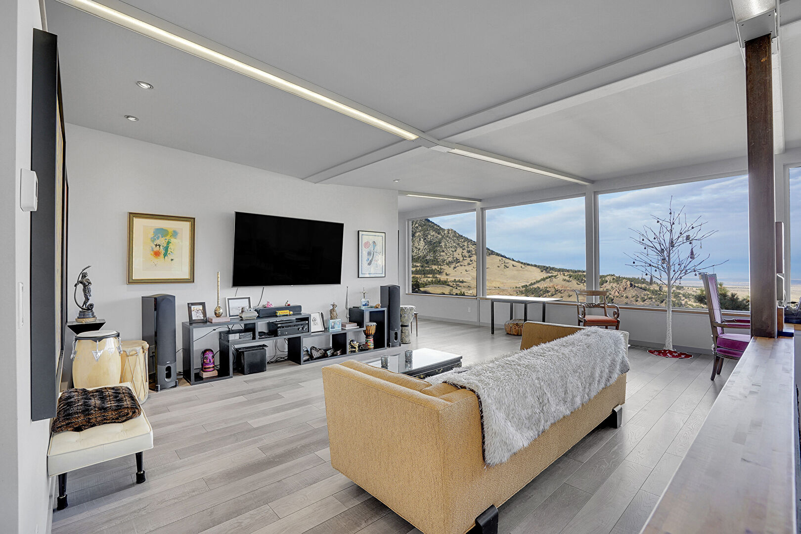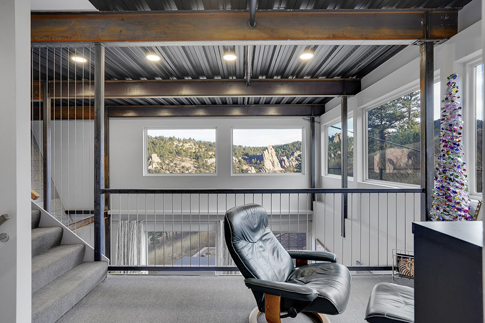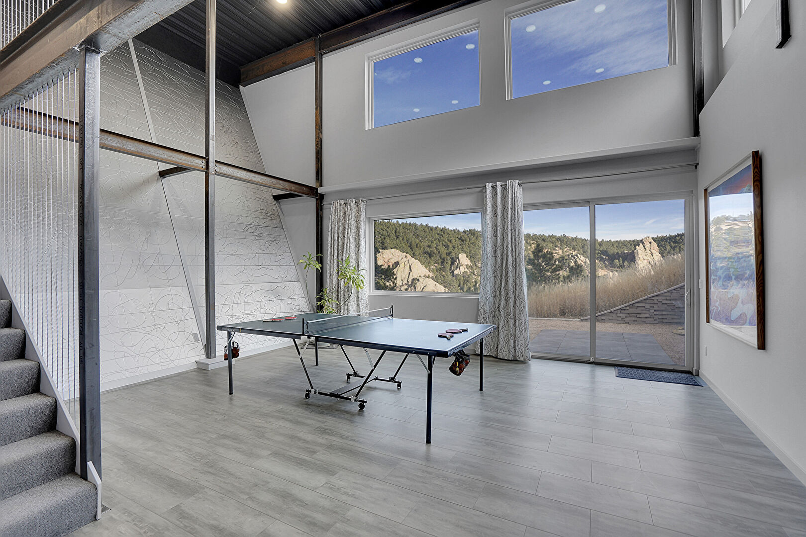 Baseboards Wall, Drywall, Floor Ceiling Windows, Forest View, Mountain View, Natural Light, Recessed Lighting, Vaulted Ceiling, Wood Finish Floor, Drywall, Natural Light, Wood Finish Floor