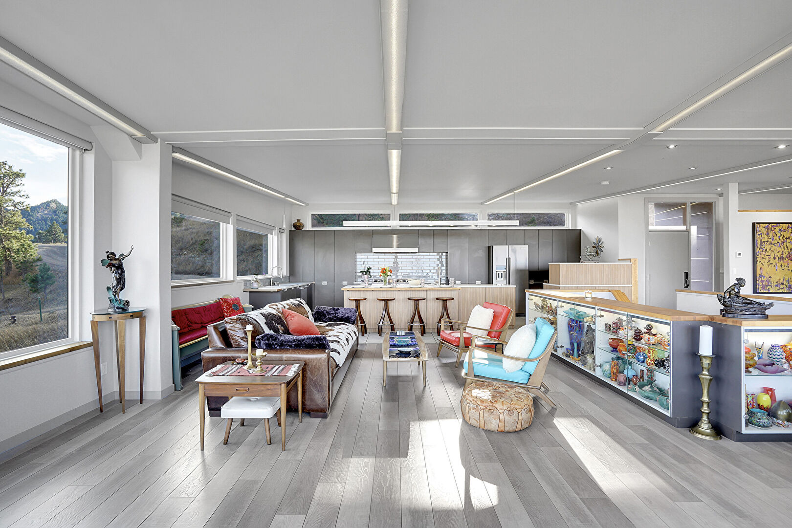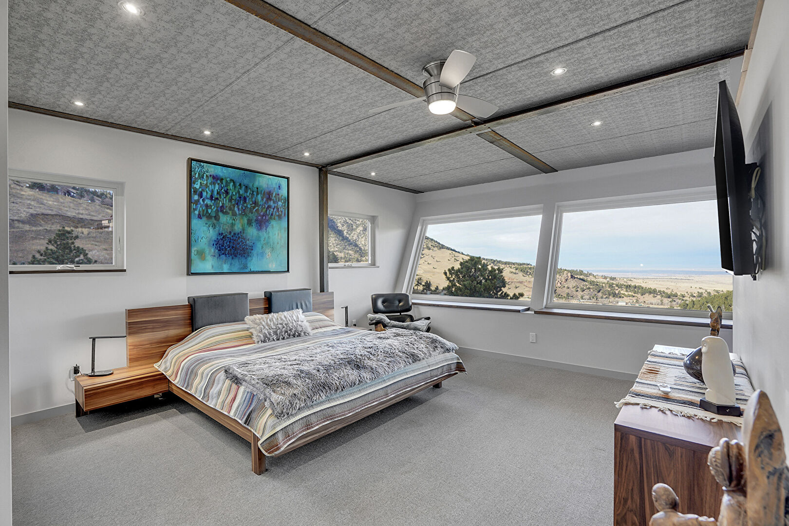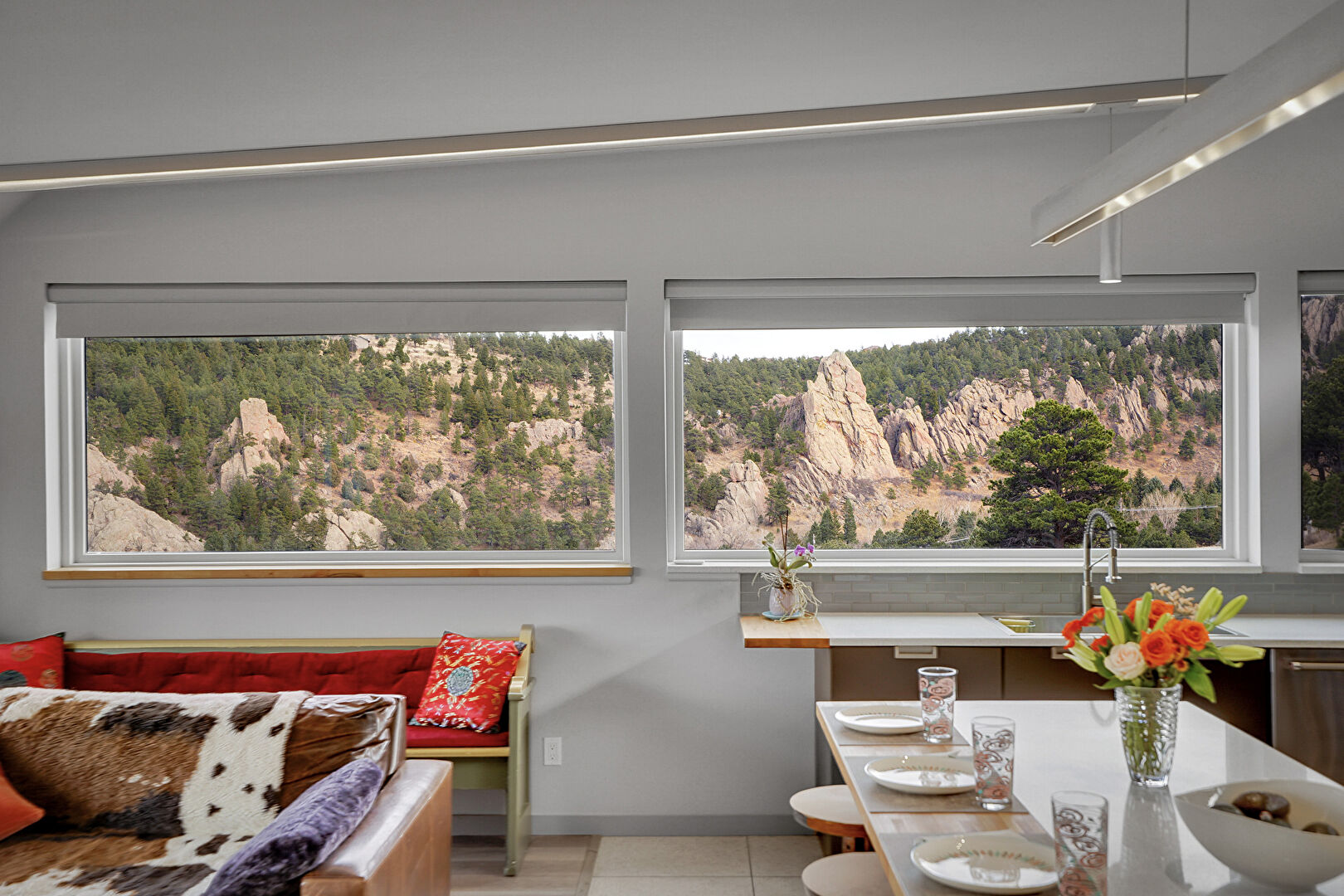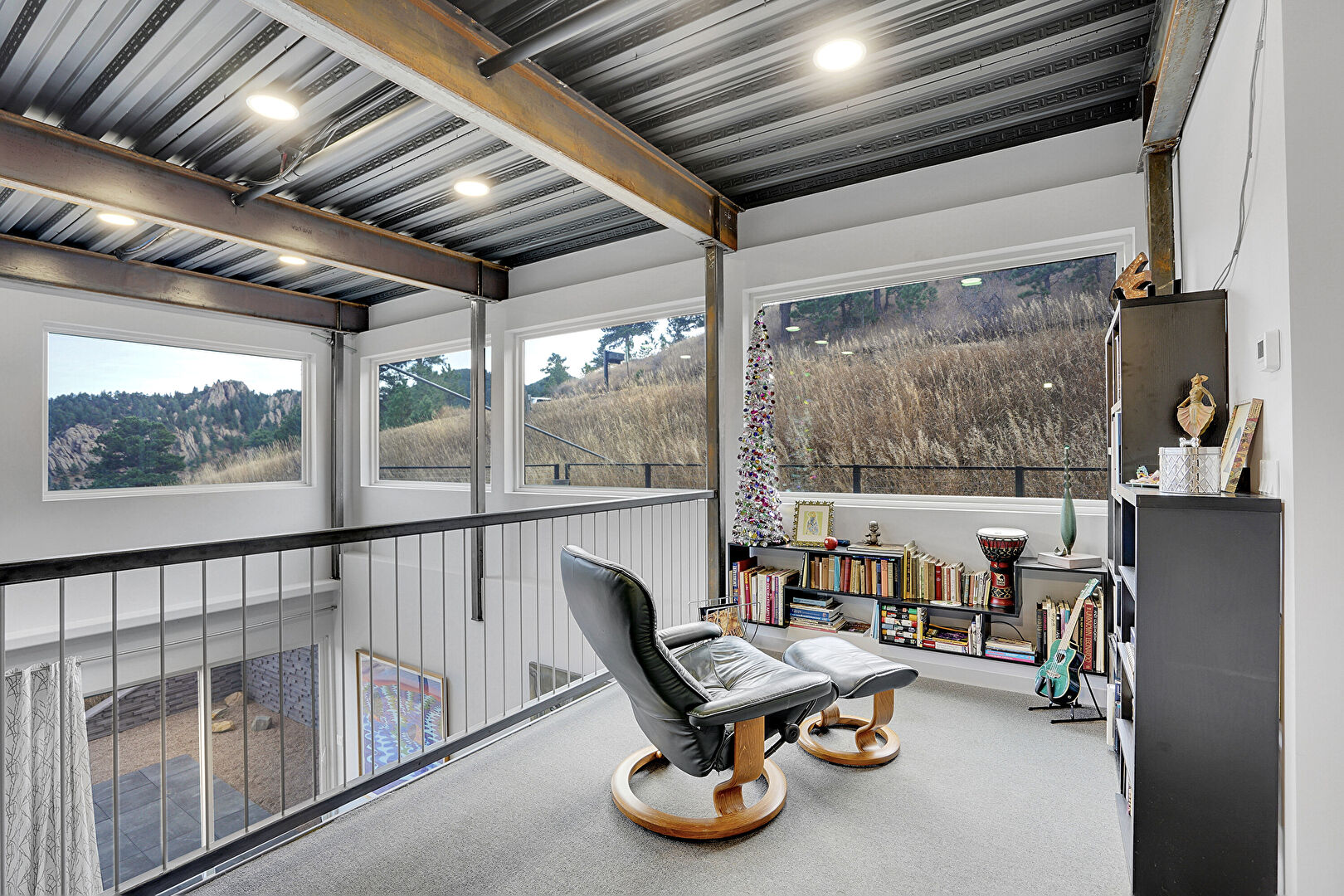 Baseboards Wall, Drywall, Floor Ceiling Windows, Forest View, Mountain View, Natural Light, Recessed Lighting, Vaulted Ceiling, Wood Finish Floor, Drywall, Natural Light, Wood Finish Floor