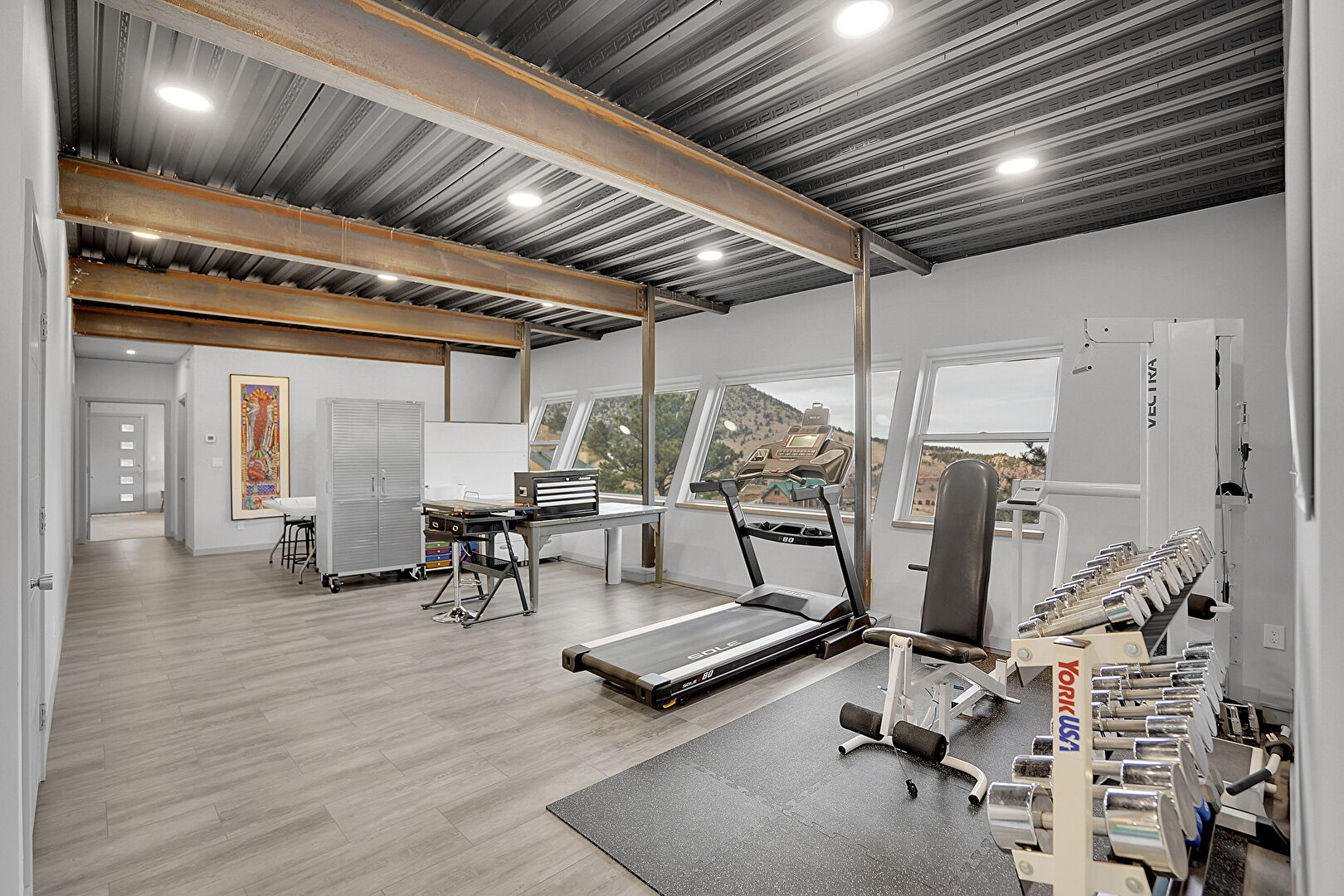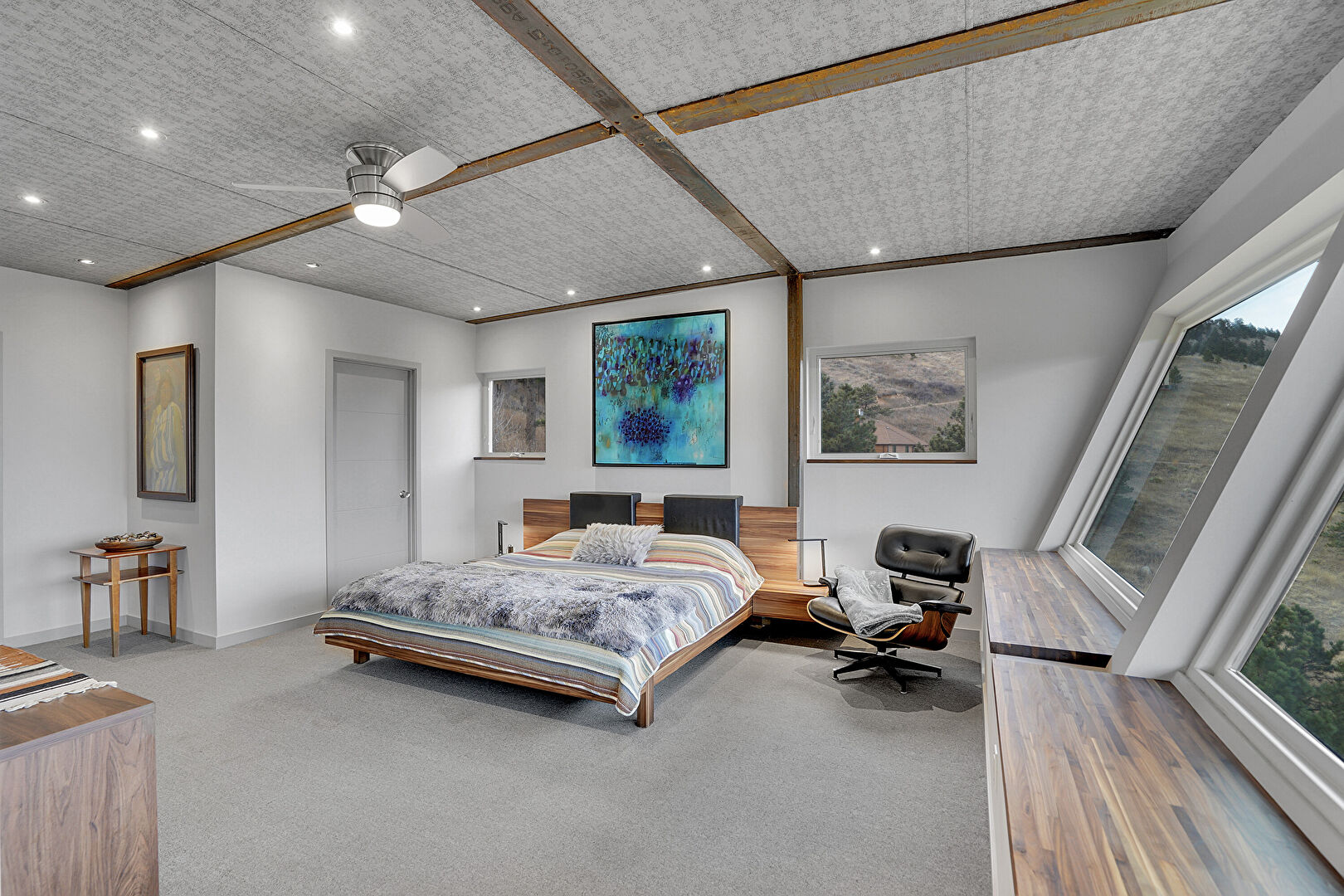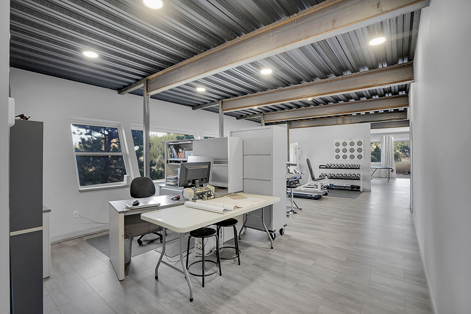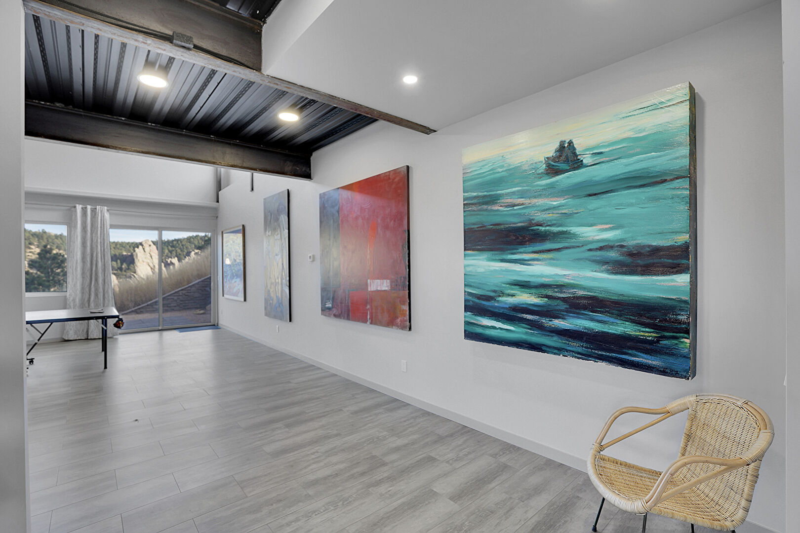 Baseboards Wall, Beamed Ceiling, Drywall, High Ceiling, Natural Light, Wood Ceiling, Wood Finish Floor, Woods View, Drywall, Natural Light, Recessed Lighting, Wood Finish Floor