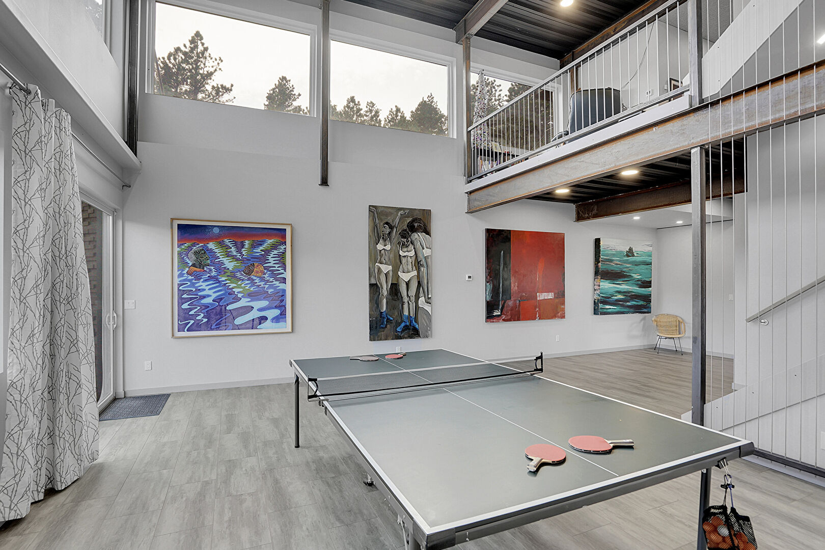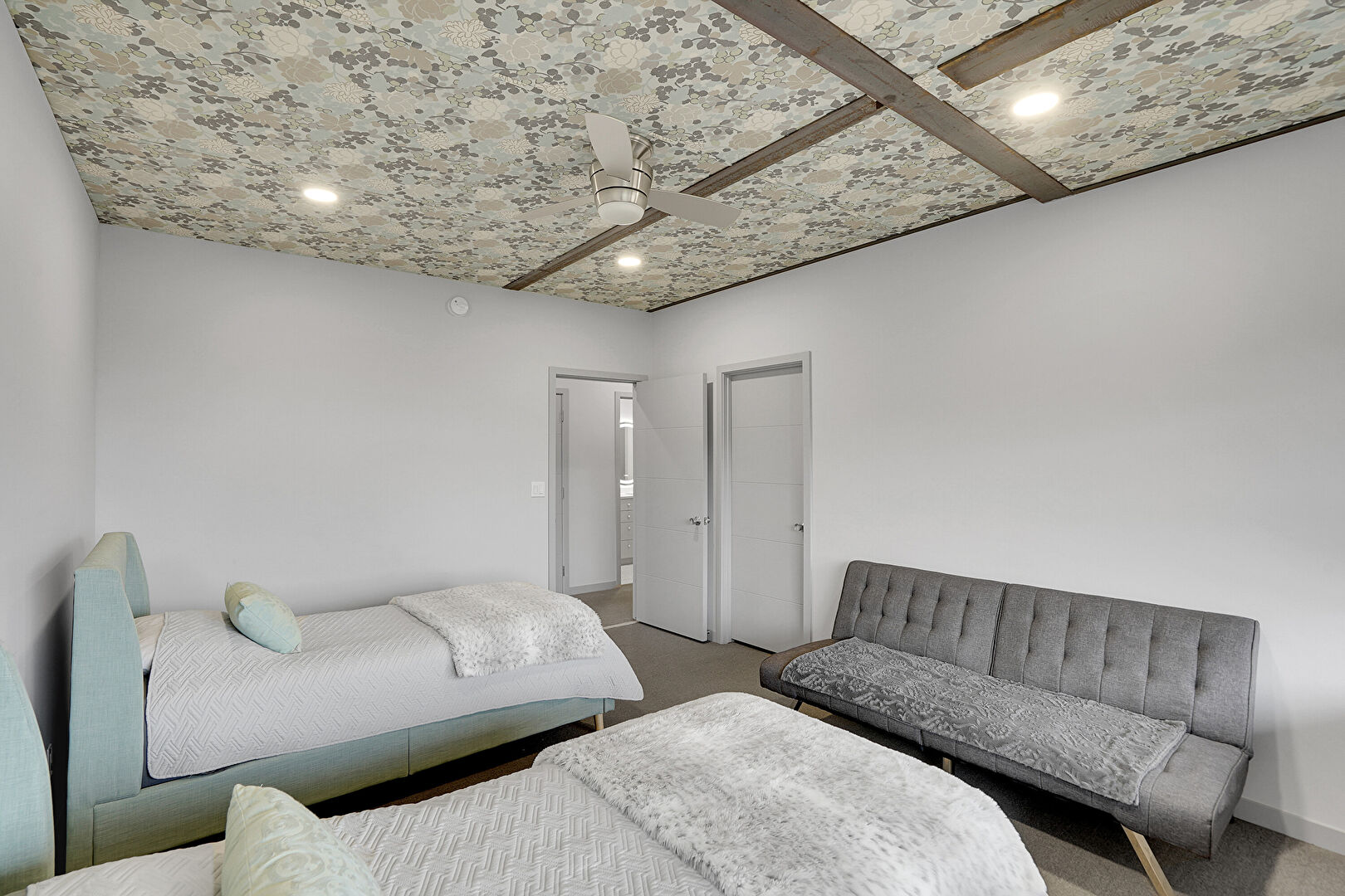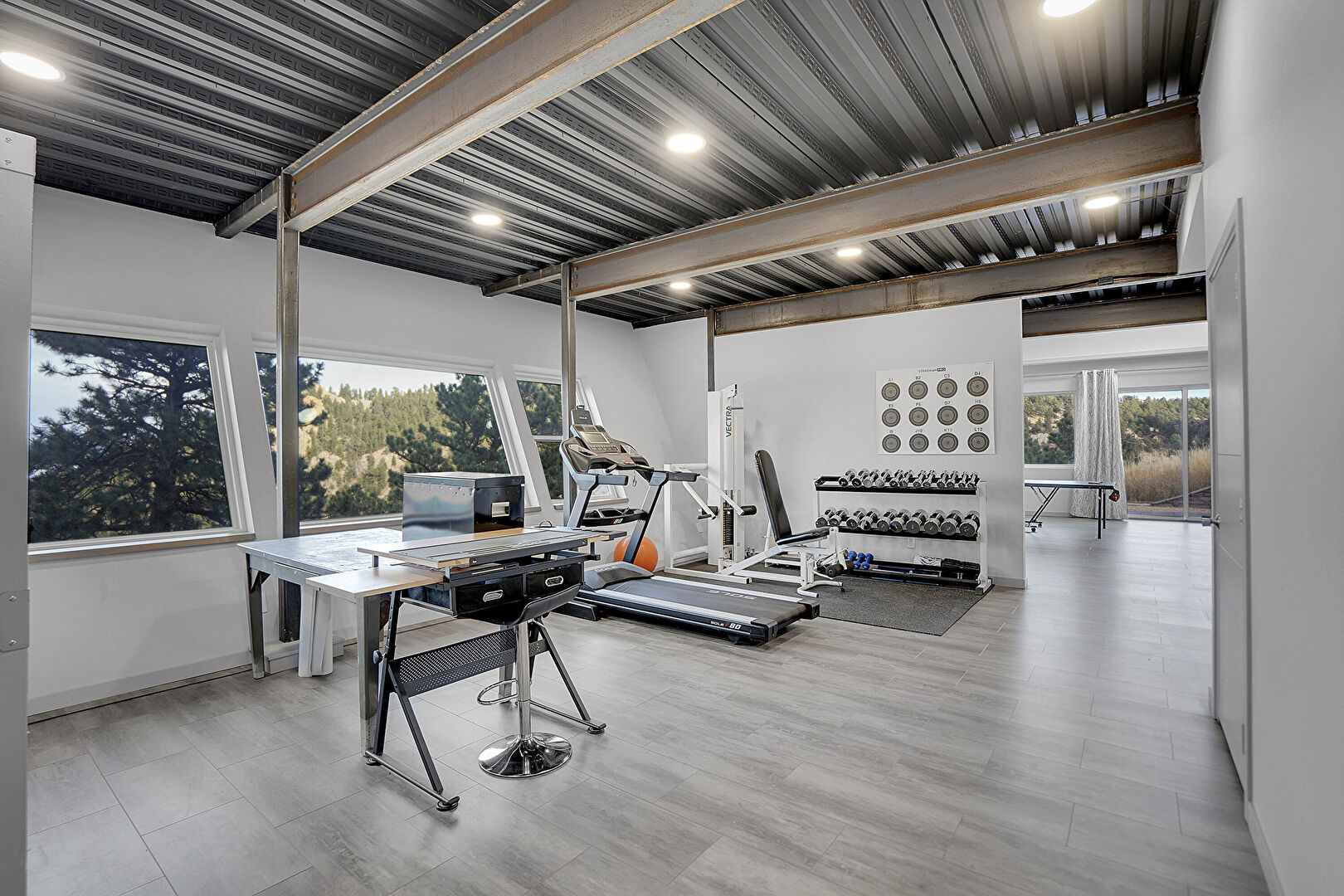 Baseboards Wall, Beamed Ceiling, Drywall, High Ceiling, Natural Light, Wood Ceiling, Wood Finish Floor, Woods View, Drywall, Natural Light, Recessed Lighting, Wood Finish Floor