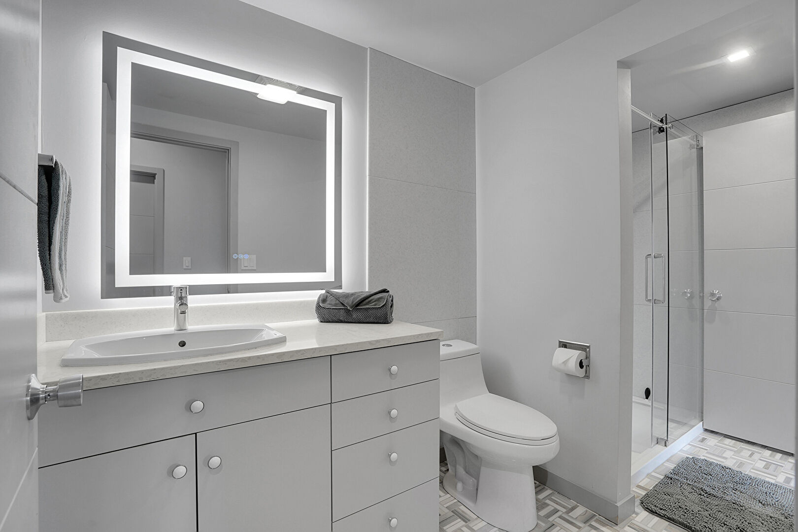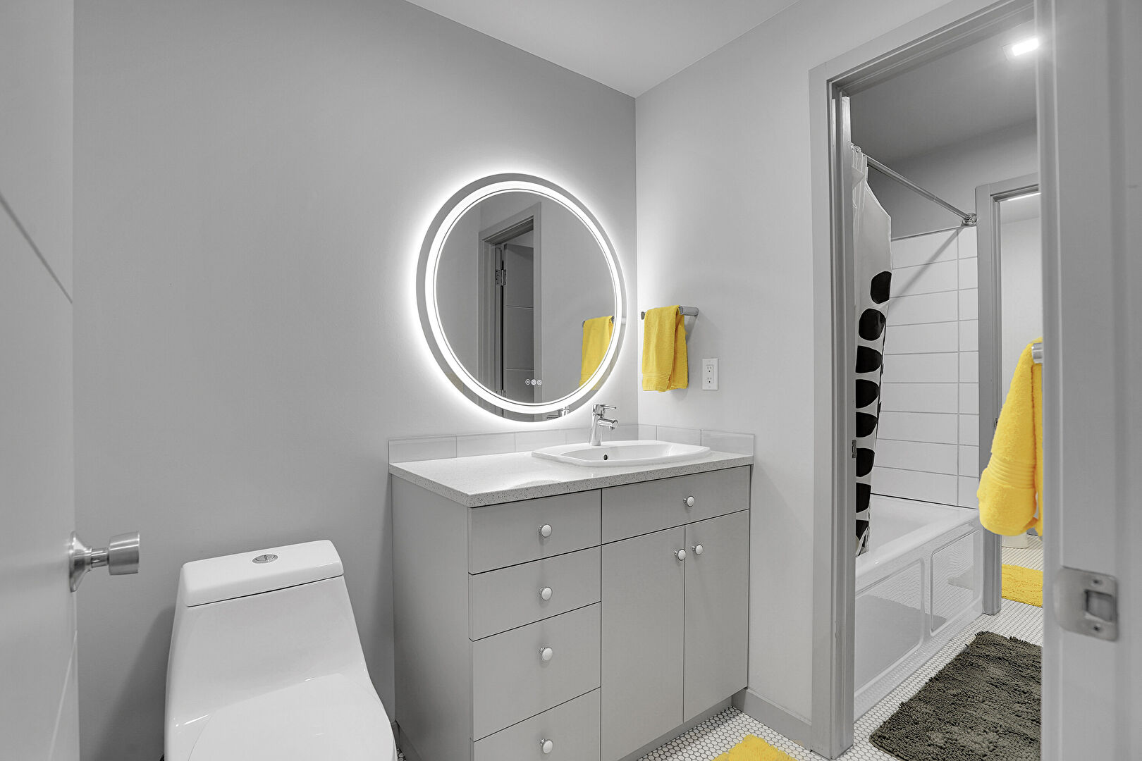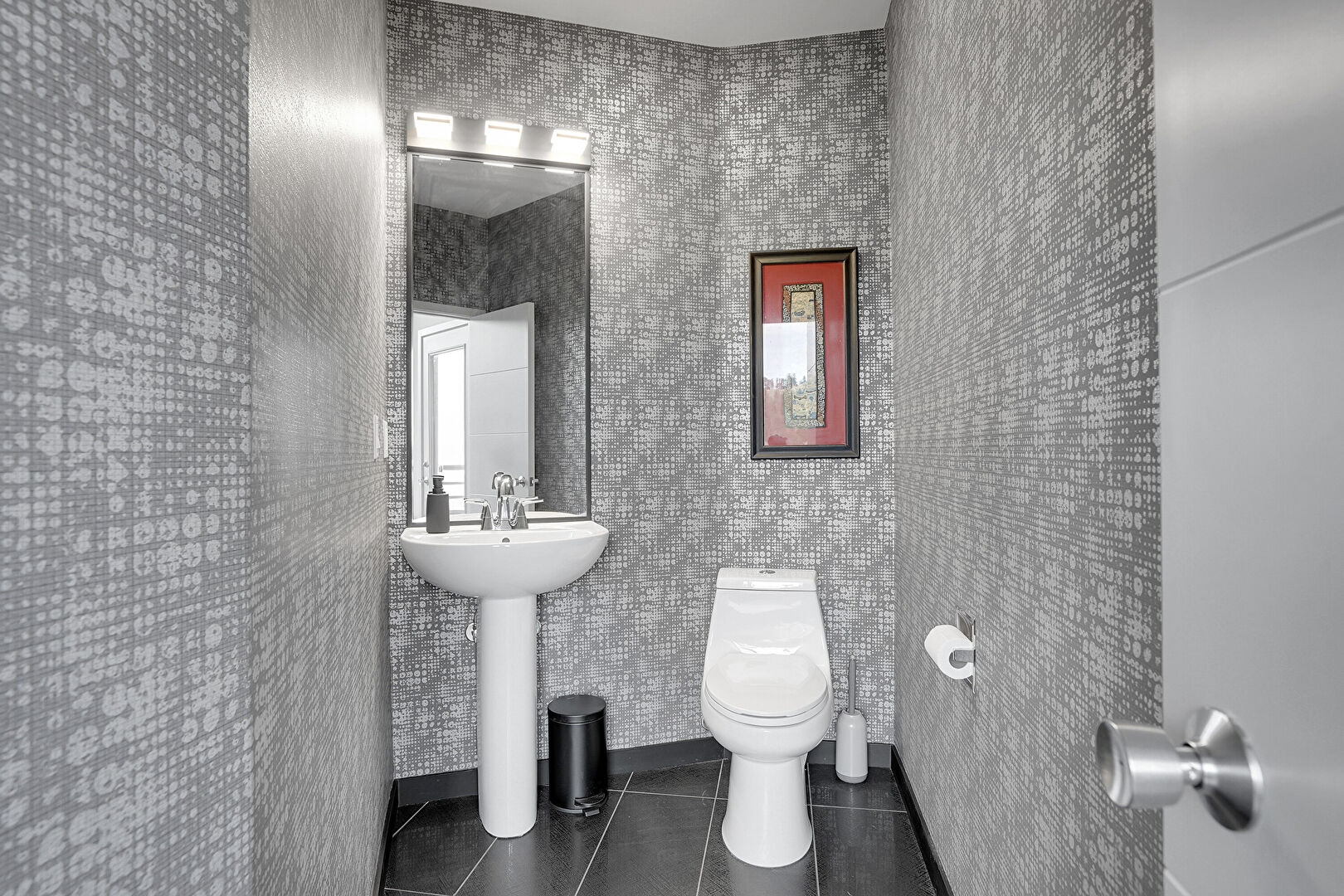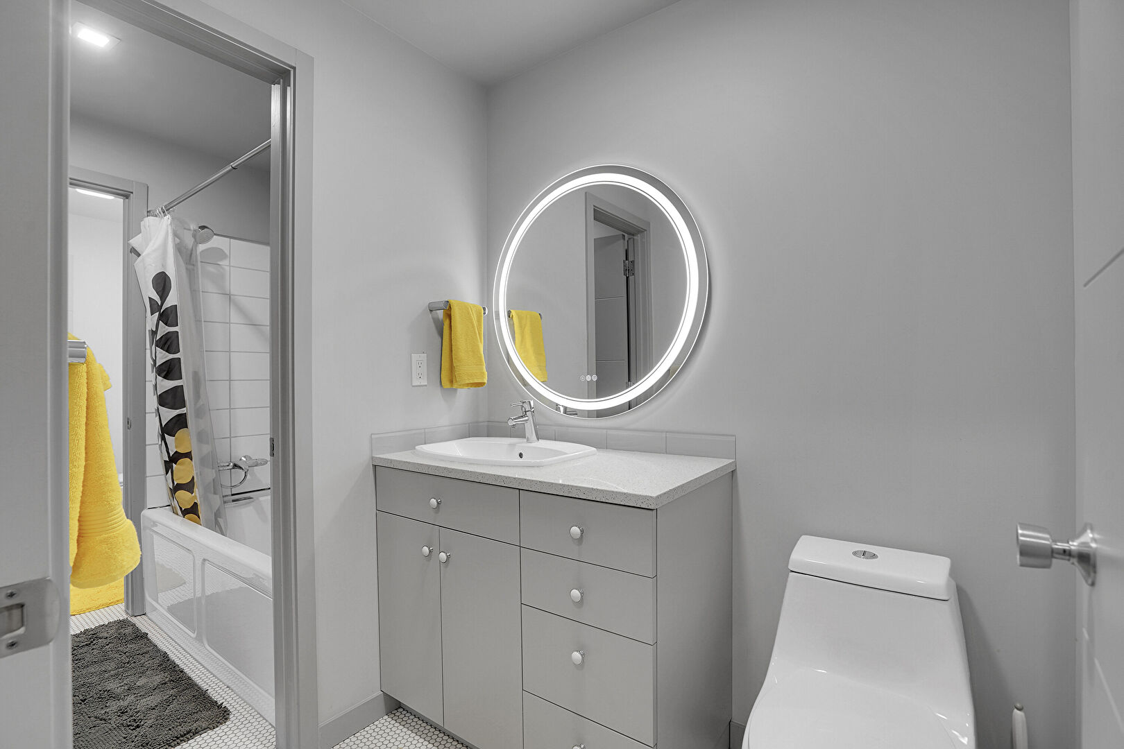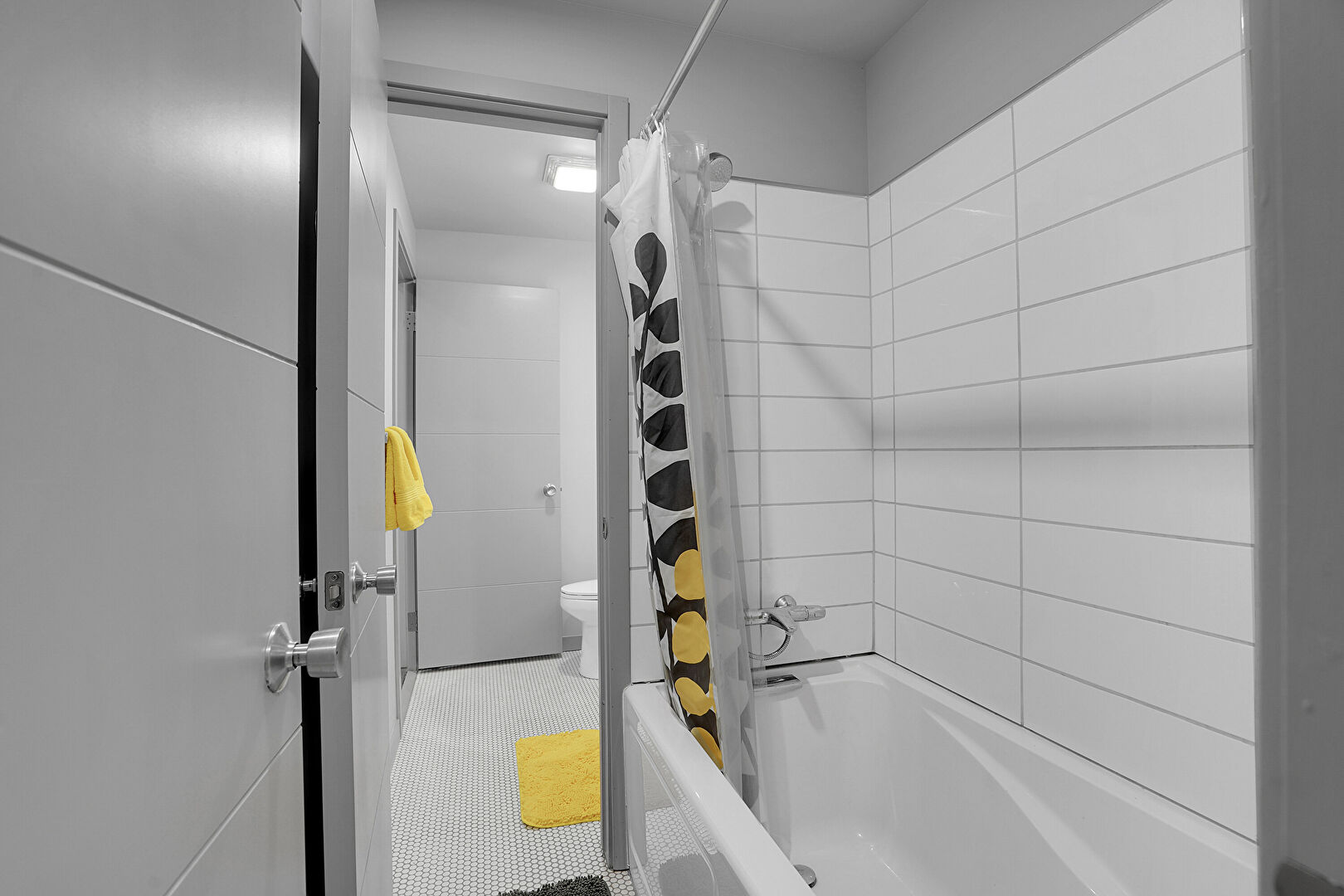 Baseboards Wall, Combined Bath Shower, Drywall, Full Bathroom, Half Bathroom, Tile Floor, Vanity, Wood Finish Floor, Full Bathroom, Natural Light, Tile Floor, Tile Wall, Vanity