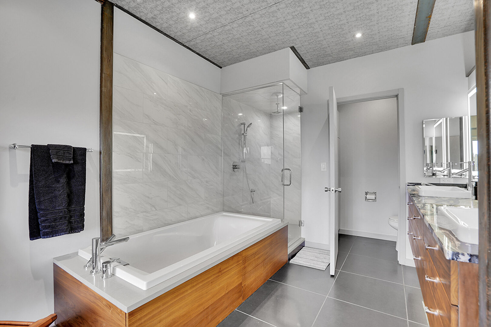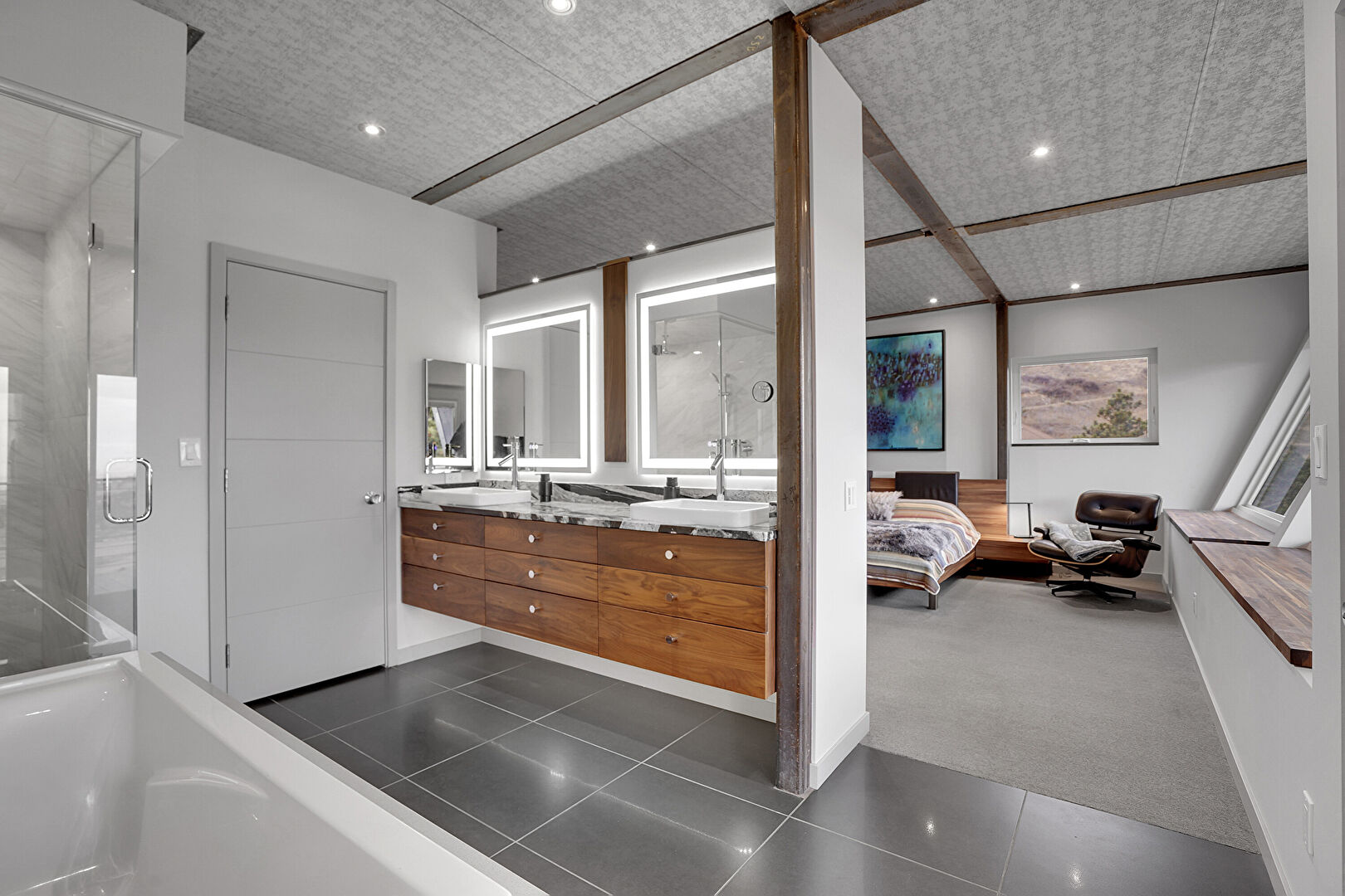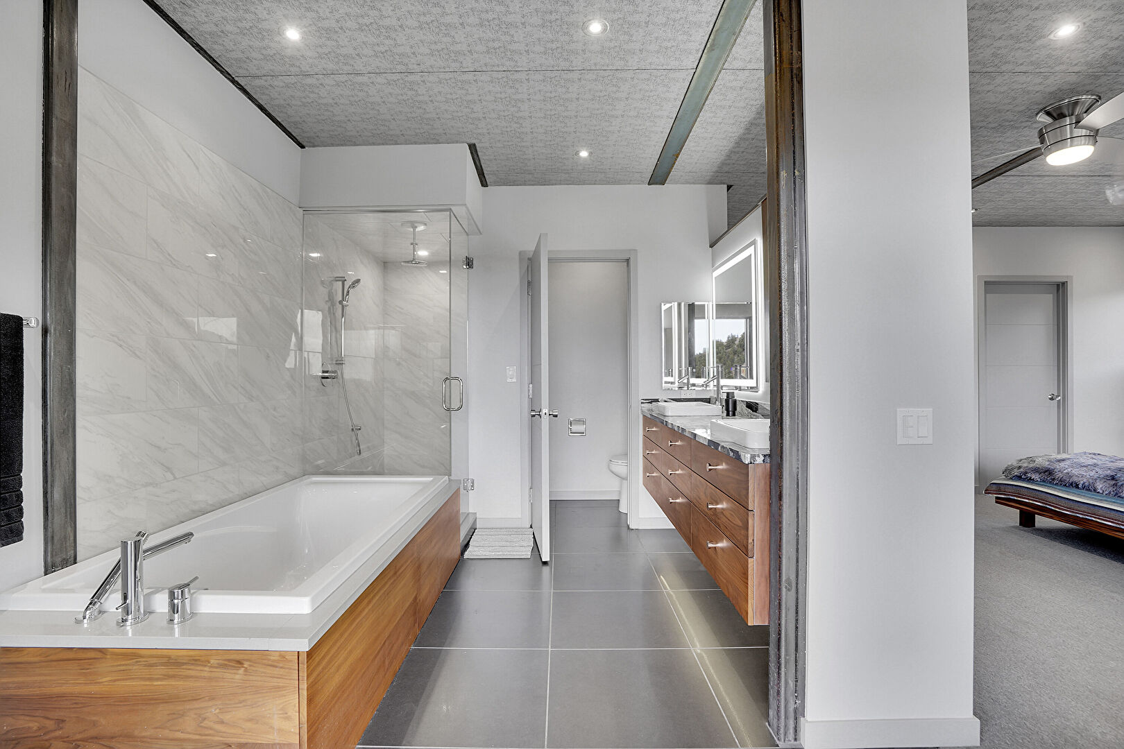Baseboards Wall, Carpet, Crown Molding, Double Vanity, Drywall, Ensuite Bathroom, Full Bathroom, Recessed Lighting, Tile Floor, Tin Ceiling, Vanity, Water Closet, Baseboards Wall, Tile Floor