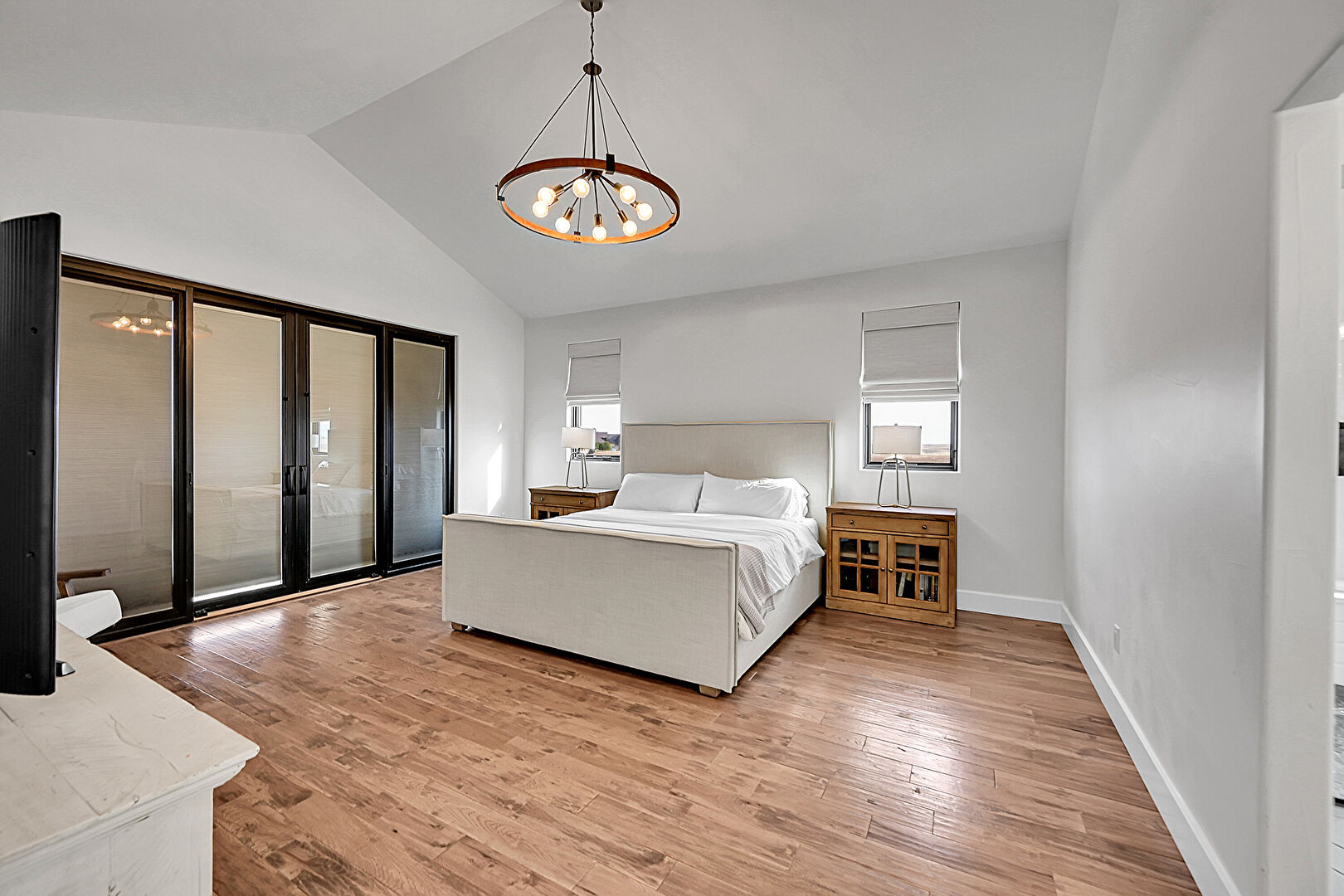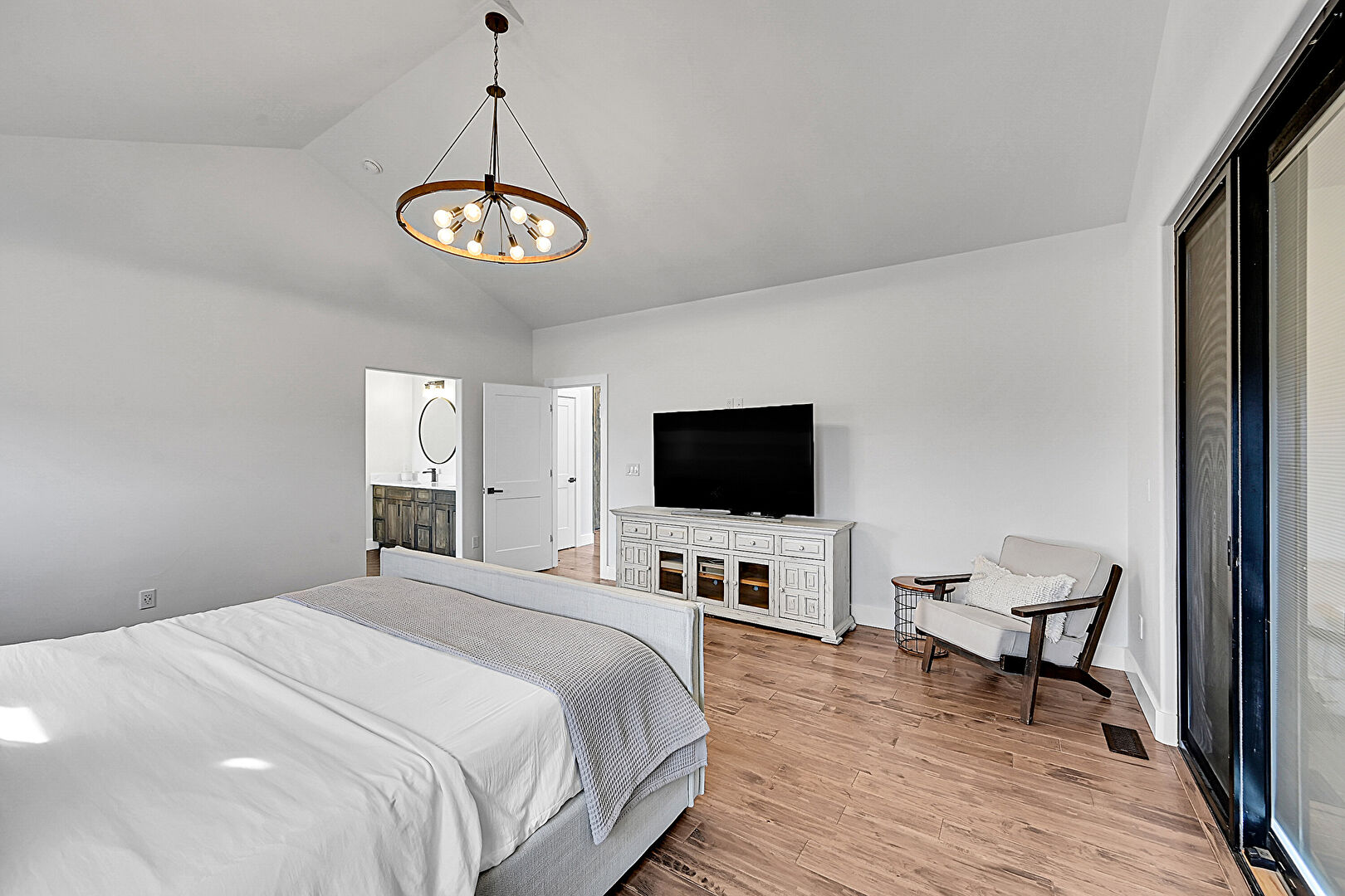 Access To Exterior, Baseboards Wall, Cathedral Ceiling, Drywall, Ensuite Bathroom, French Doors, High Ceiling, Natural Light, Notable Chandelier, Vaulted Ceiling, Vent, Wood Finish Floor, Baseboards Wall, Notable Chandelier