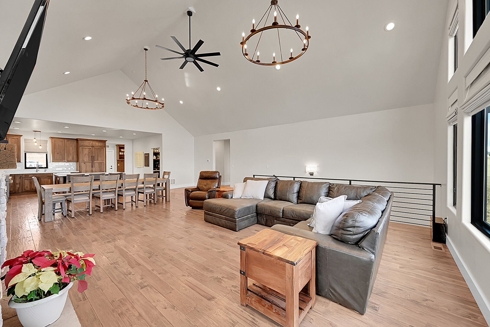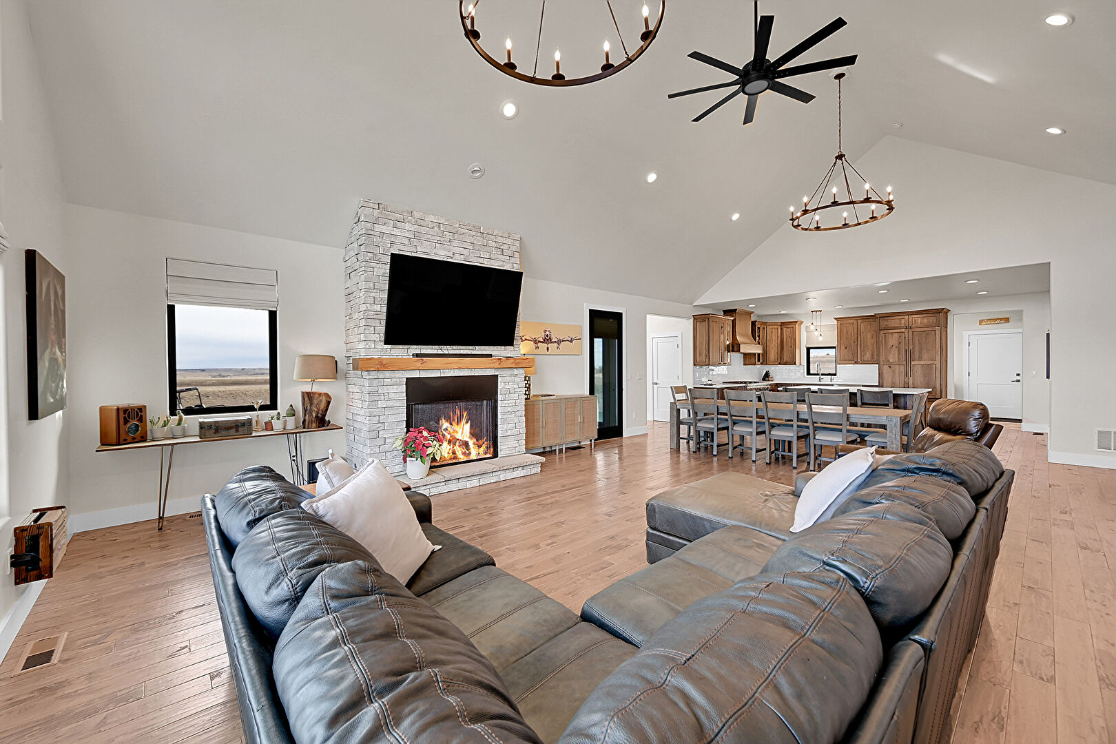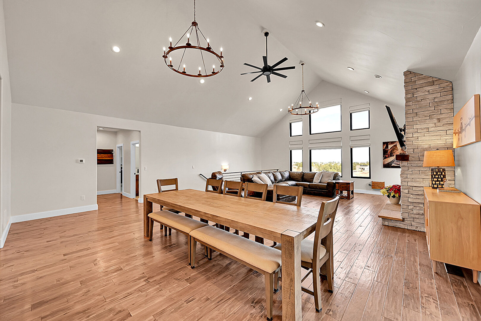 Baseboards Wall, Cathedral Ceiling, Ceiling Fan, Drywall, Fireplace, High Ceiling, Notable Chandelier, Recessed Lighting, Vaulted Ceiling, Wood Finish Floor, Natural Light
