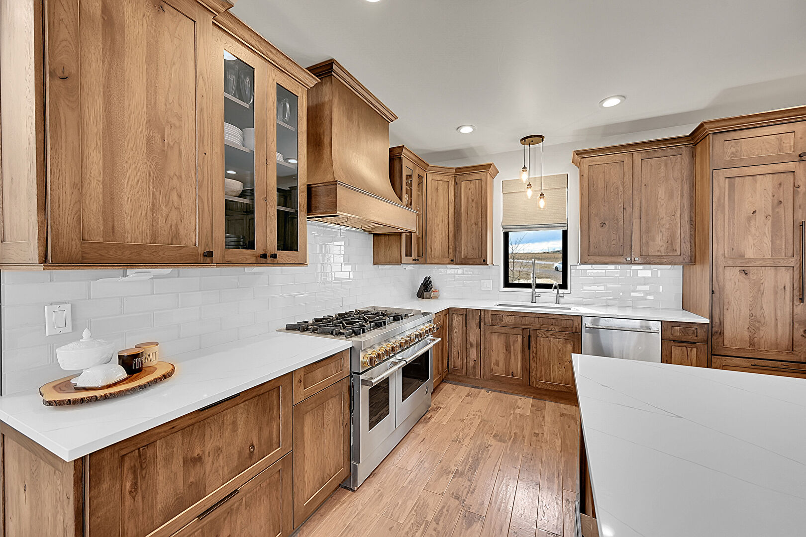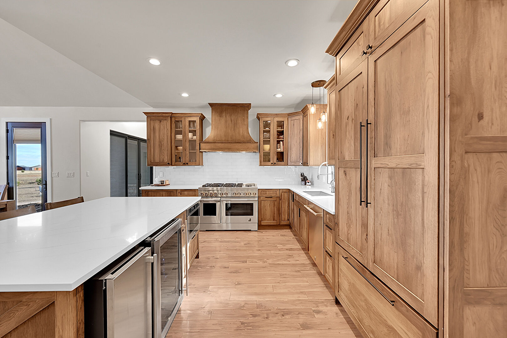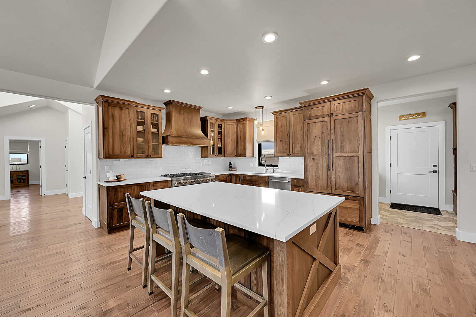 Baseboards Wall, Cathedral Ceiling, Crown Molding Cabinets, Drywall, Fireplace, Glass Insert Cabinets, High Ceiling, Kitchen Island, Medium Brown Cabinets, Natural Light, Notable Chandelier, Opens To Living Area, Pendant Lighting, Recessed Lighting, Shaker Cabinets, Stone Countertops, Trash Compactor, Vaulted Ceiling, Wine Cooler, Wood Finish Floor, Crown Molding Cabinets, Kitchen Bar, Opens To Living Area, Recessed Lighting, Vaulted Ceiling