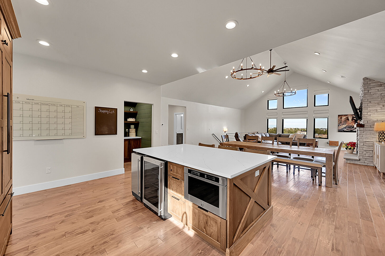 Baseboards Wall, Carpet, Cathedral Ceiling, Drywall, Fireplace, High Ceiling, L Shaped Kitchen, Natural Light, Notable Chandelier, Recessed Lighting, Vaulted Ceiling, Vent, Wine Cooler, Wood Finish Floor, Baseboards Wall, Cathedral Ceiling, Recessed Lighting