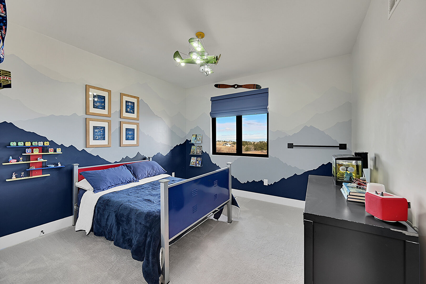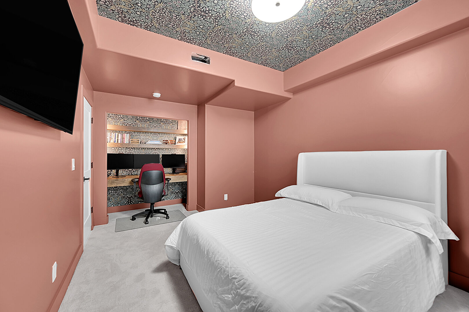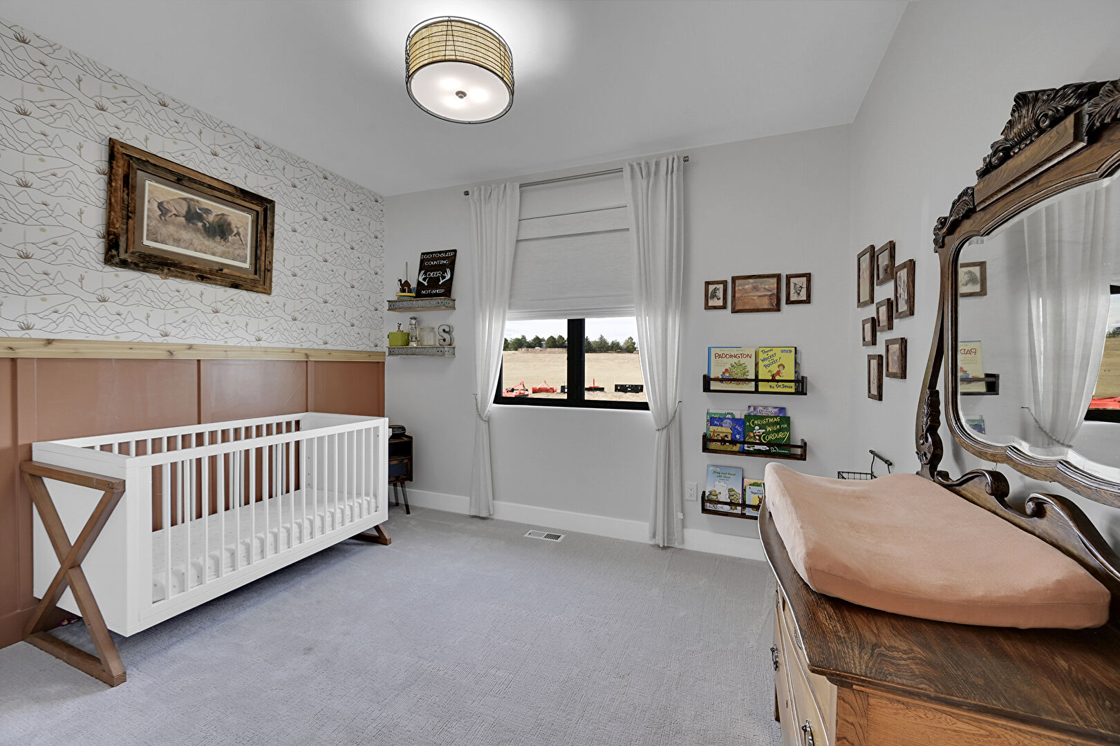 Accent Wall, Baseboards Wall, Carpet, Drywall, Natural Light, Nursery, Office Area, Textured Ceiling, Vent, Wallpaper Wall, Baseboards Wall, Built In Desk, Vent, Wainscot Wall