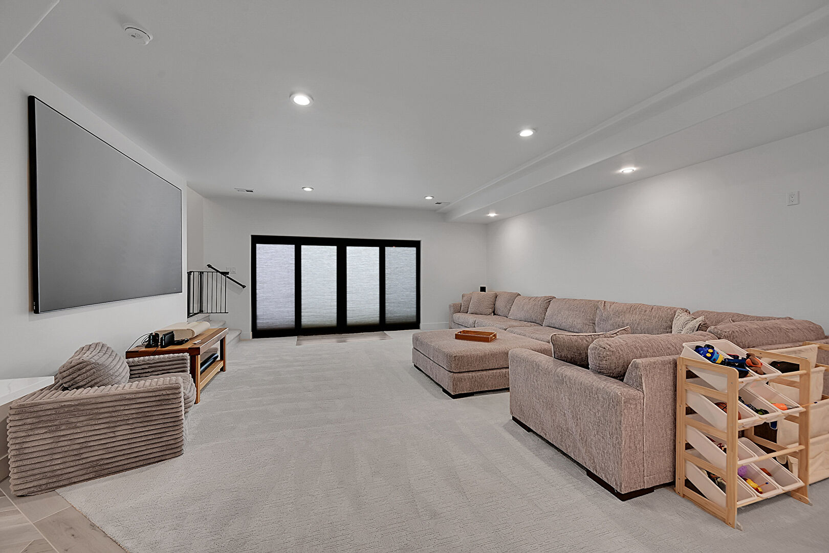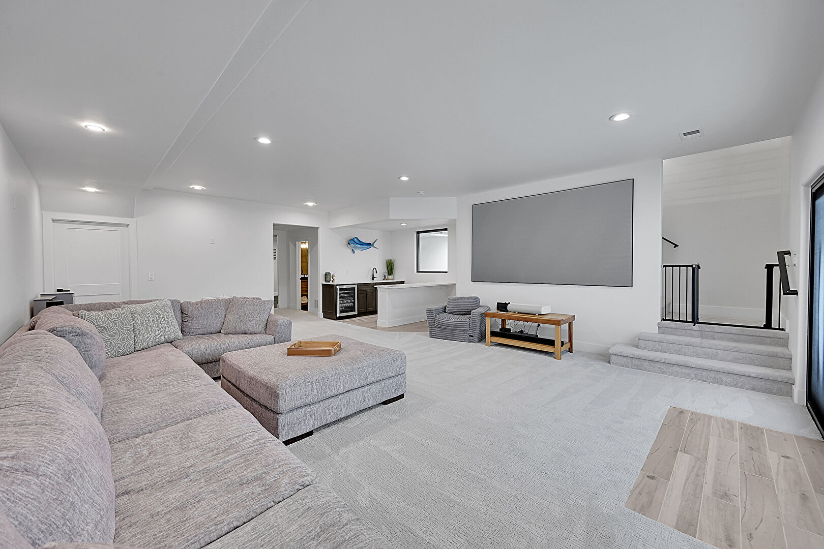 Baseboards Wall, Carpet, Drywall, Natural Light, Recessed Lighting, Stairs, Vent, Wine Cooler, Drywall, Smoke Carbon Monoxide Detector, Vent