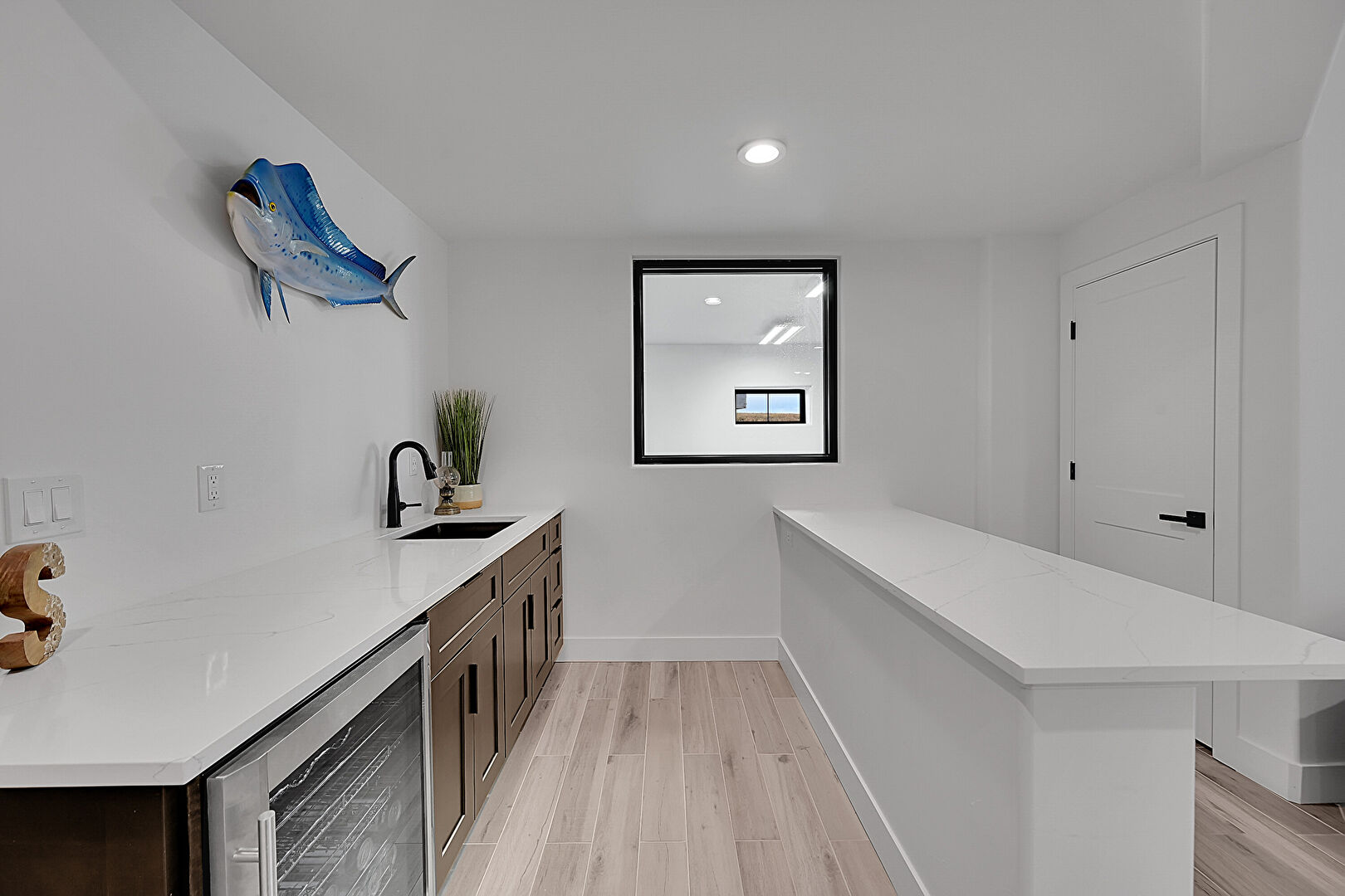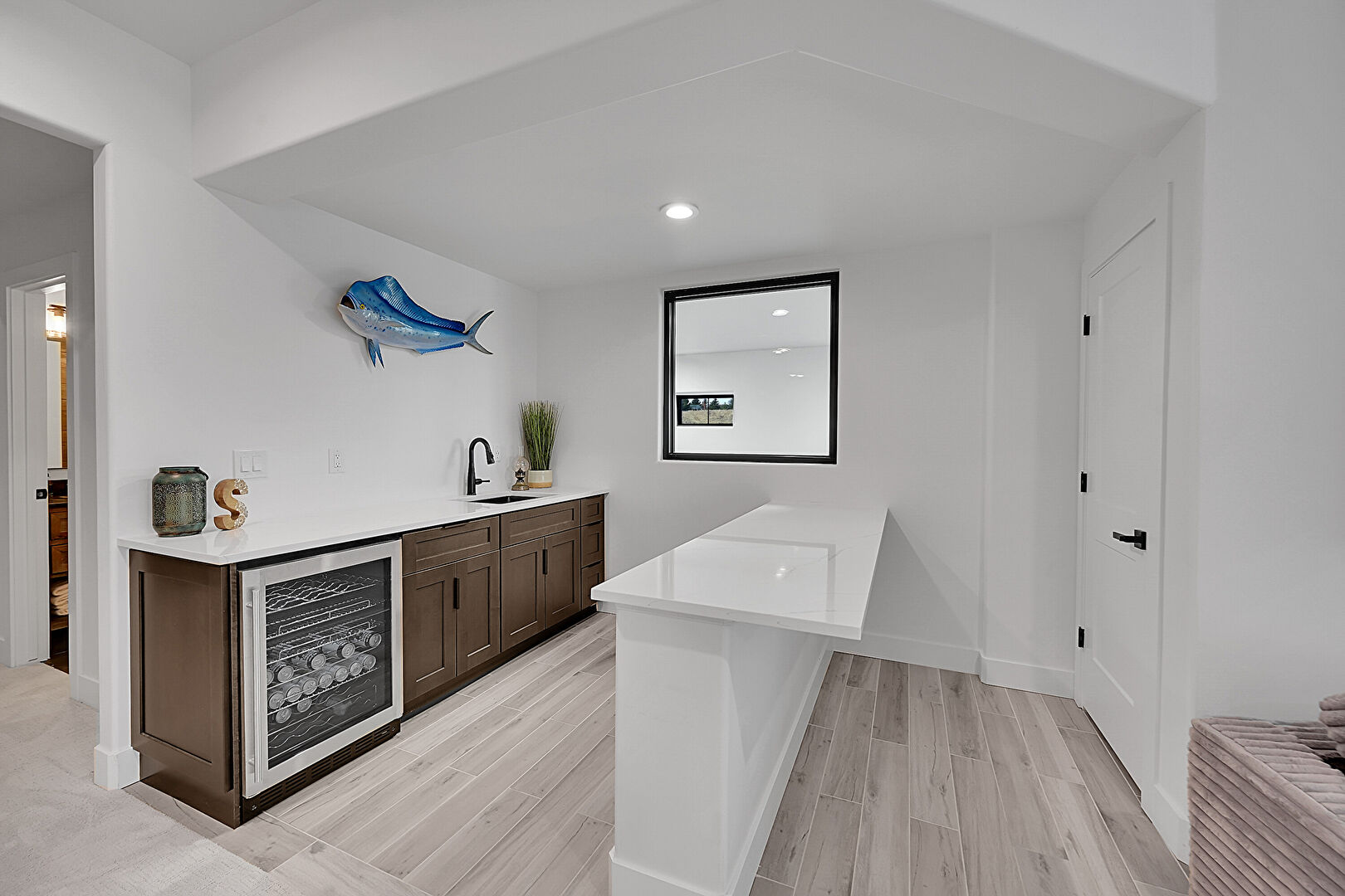 Baseboards Wall, Dark Brown Cabinets, Drywall, Indoor Bar, Natural Light, Recessed Lighting, Shaker Cabinets, Stone Countertops, Wine Cooler, Wood Finish Floor, Baseboards Wall, Wine Cooler