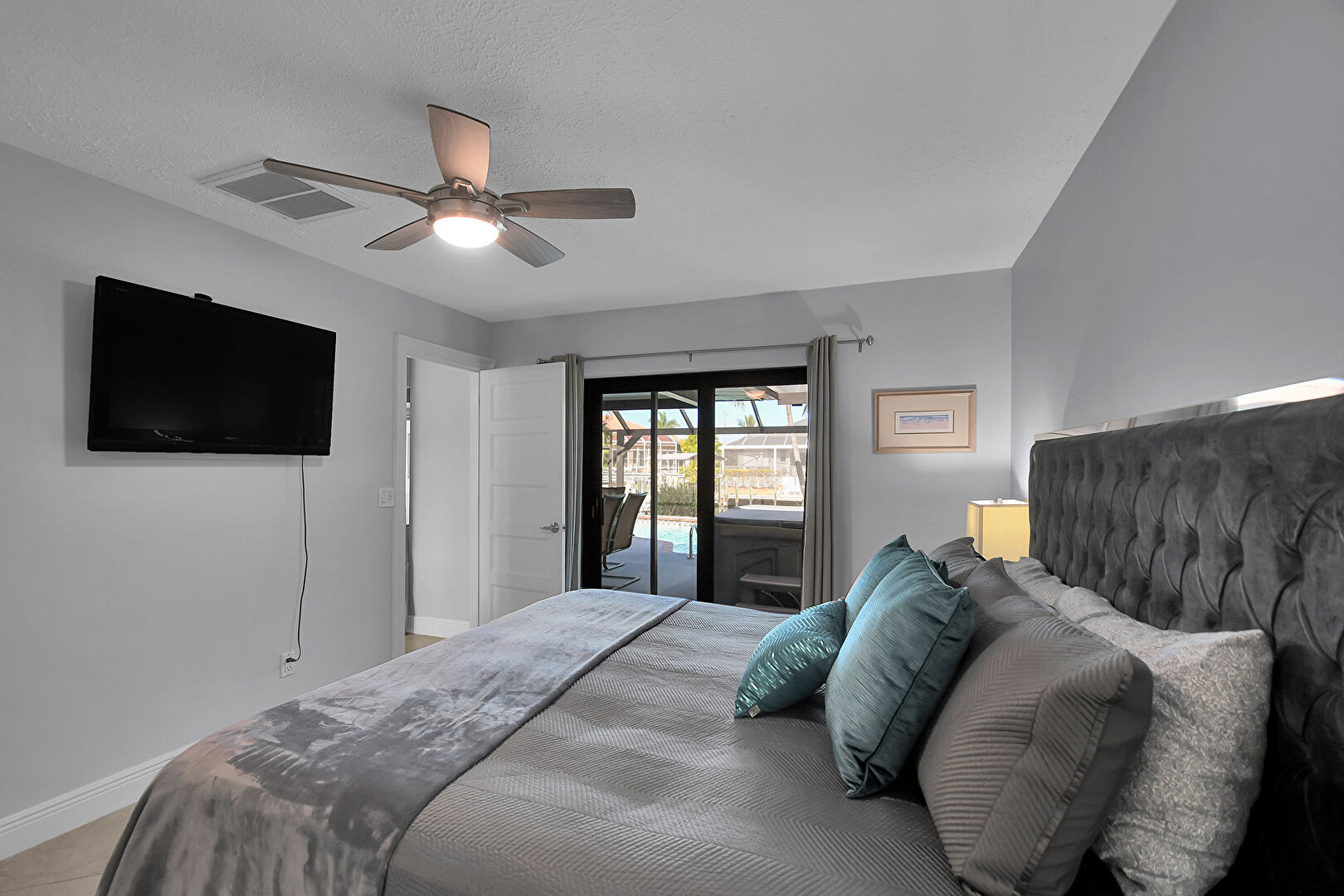 Access To Exterior, Baseboards Wall, Ceiling Fan, Drywall, Natural Light, Textured Ceiling, Tile Floor, Vent, Ensuite Bathroom, Textured Ceiling