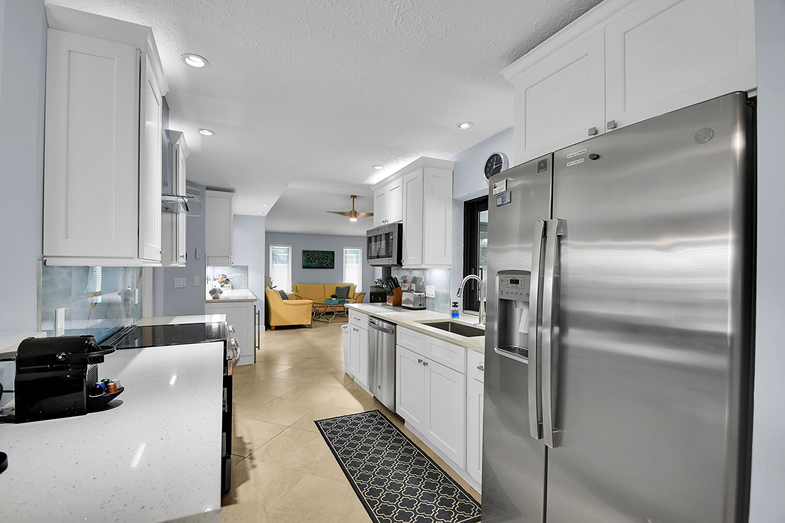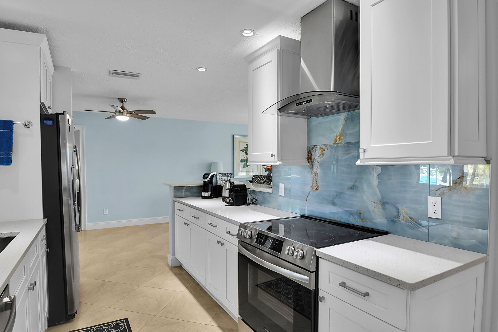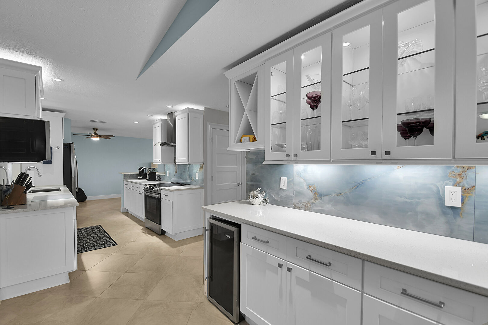 Baseboards Wall, Ceiling Fan, Crown Molding Cabinets, Drywall, Galley Kitchen, Glass Insert Cabinets, Kitchen Bar, Kitchen Peninsula, Natural Light, Open Shelves, Opens To Living Area, Recessed Lighting, Shaker Cabinets, Stone Countertops, Textured Ceiling, Tile Floor, Toaster, Vent, Wine Cooler, Ceiling Fan, Drywall, Natural Light, Shaker Cabinets, Textured Ceiling, Vent