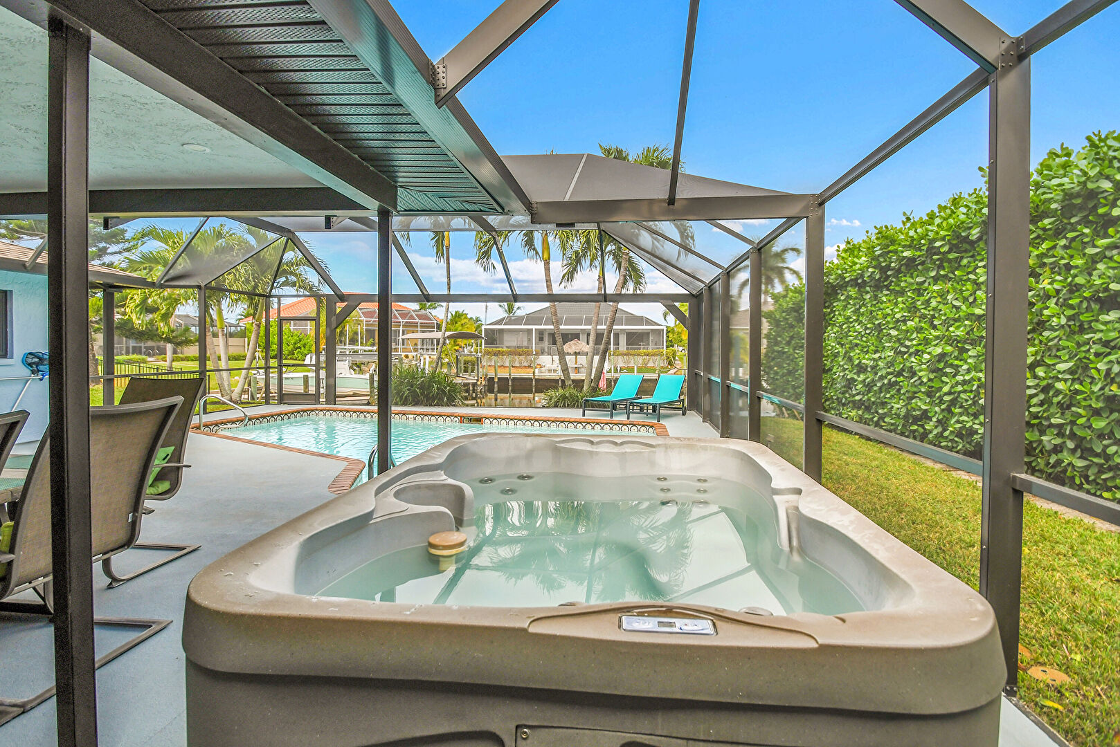 Fence, Grill, Handrail, Hot Tub, Lanai, Lawn, Outdoor Dining Area, Outdoor Living Space, Patio, Pool, Sunroom, Grill, Hot Tub, Outdoor Living Space, Patio, Pool, Pool Water Feature