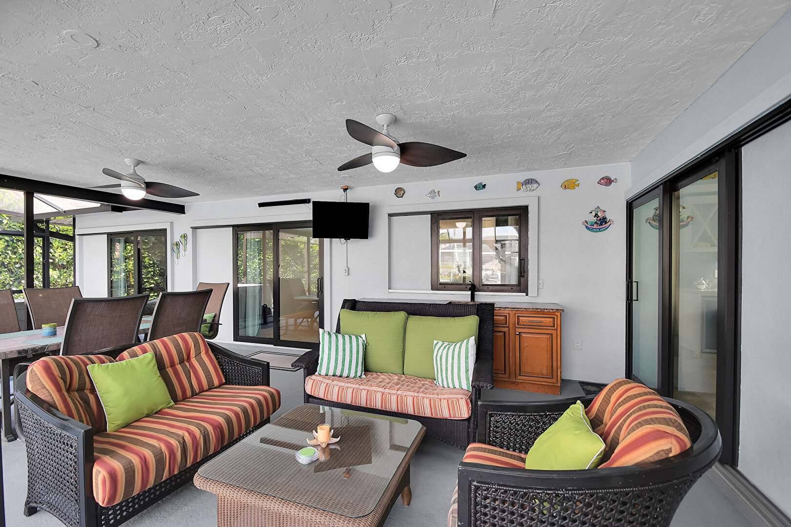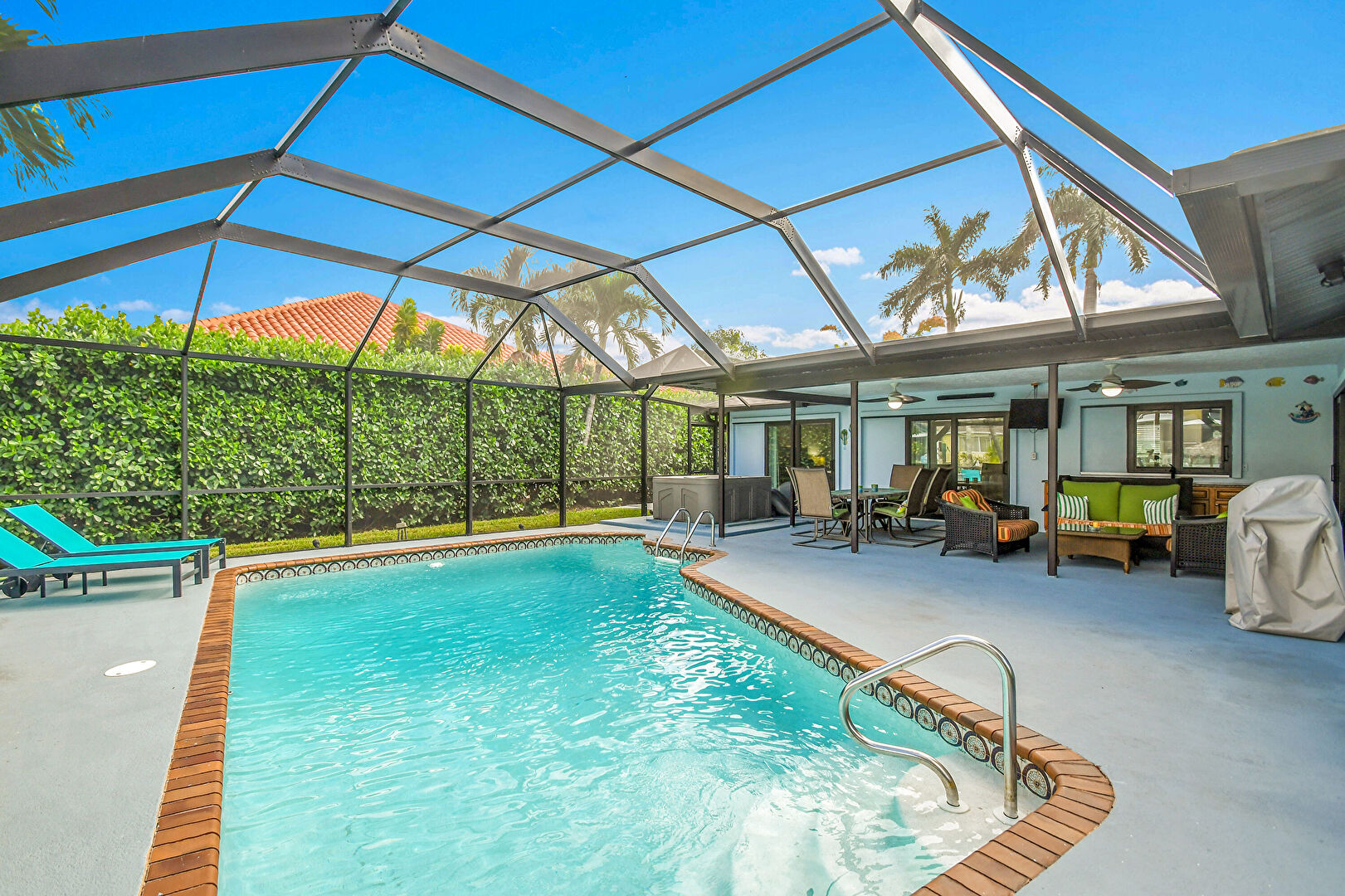 Ceiling Fan, Grill, Handrail, Hot Tub, Lanai, Outdoor Dining Area, Outdoor Living Space, Pool, Sunroom, Natural Light, Patio
