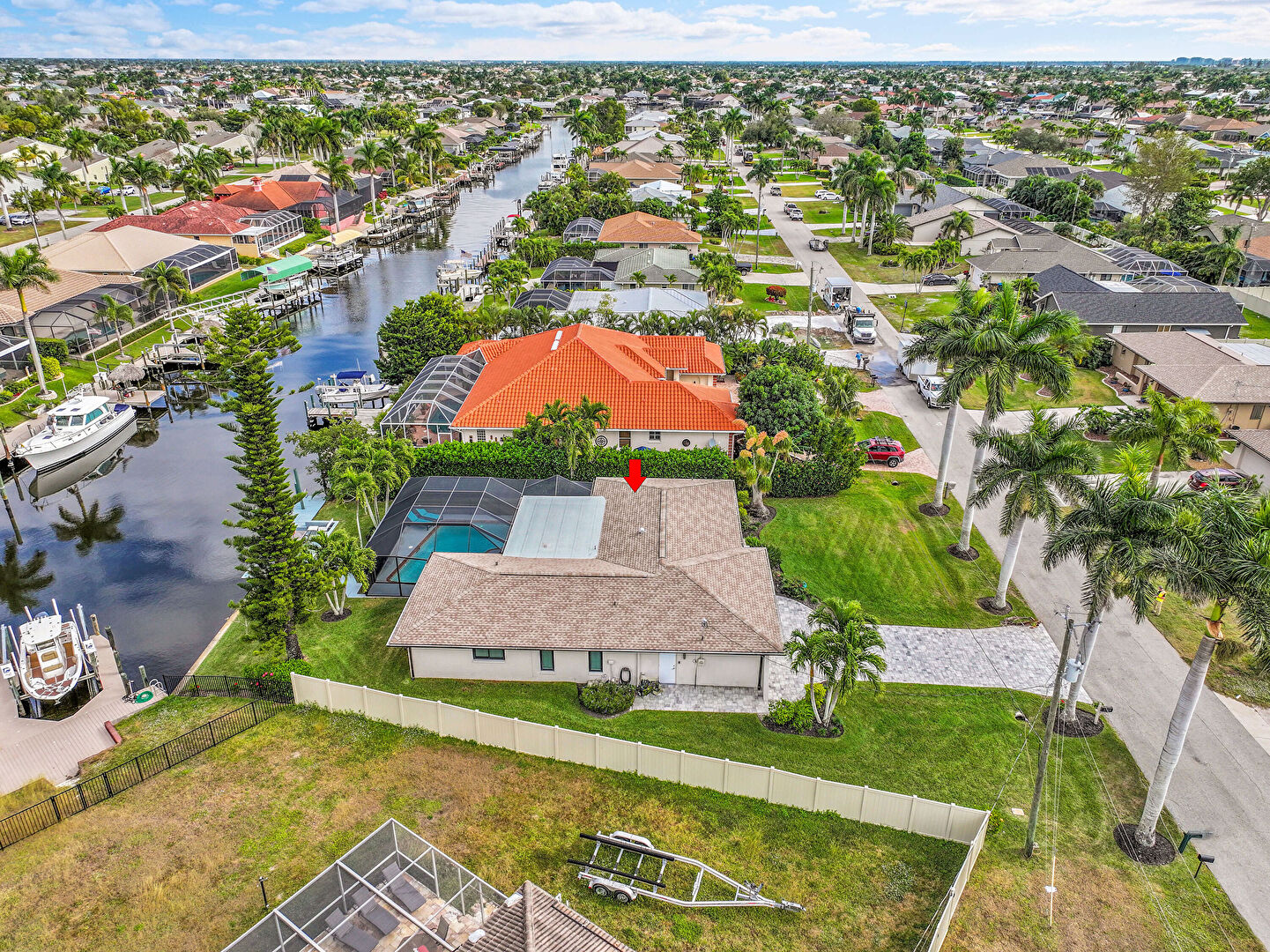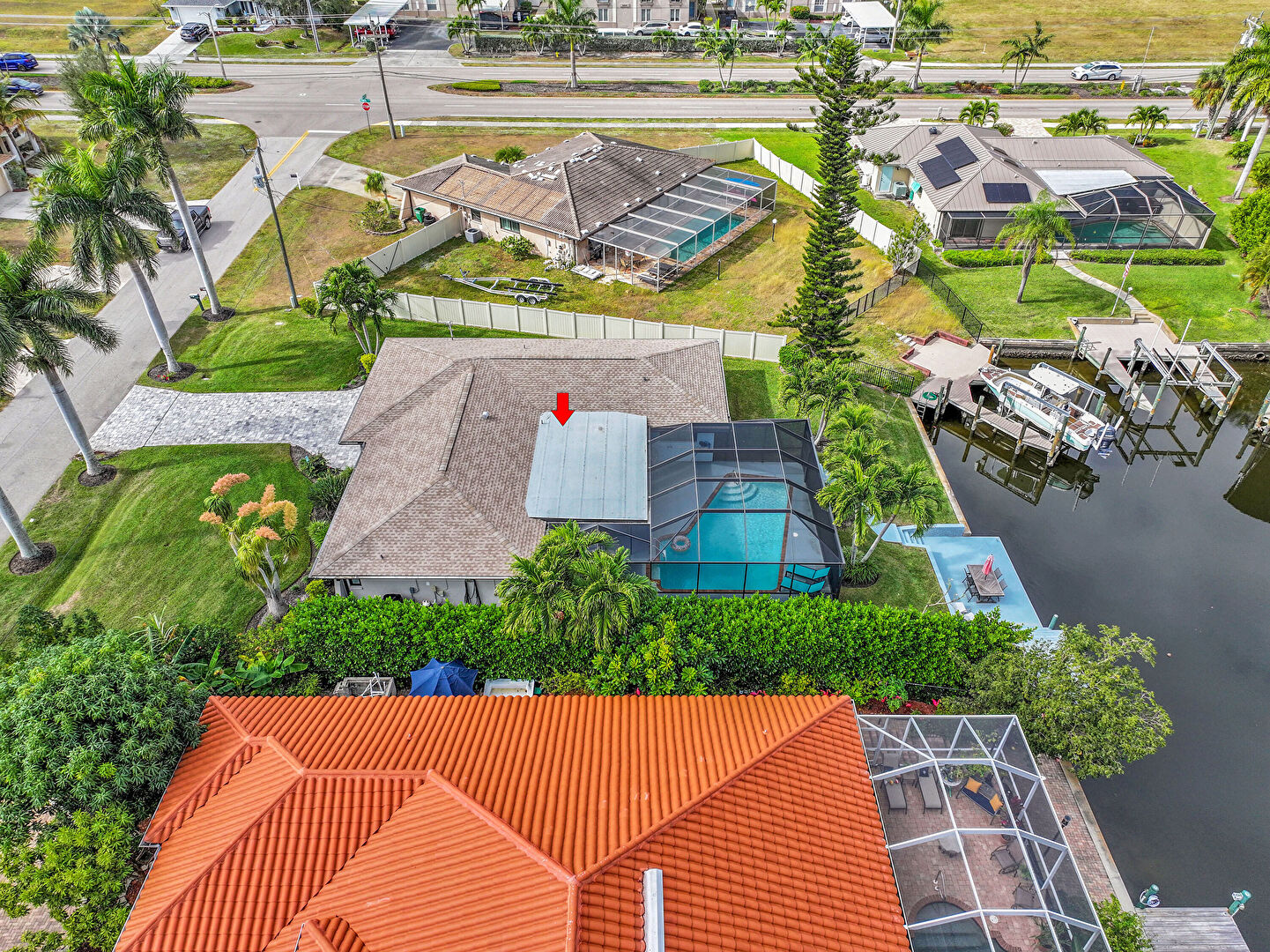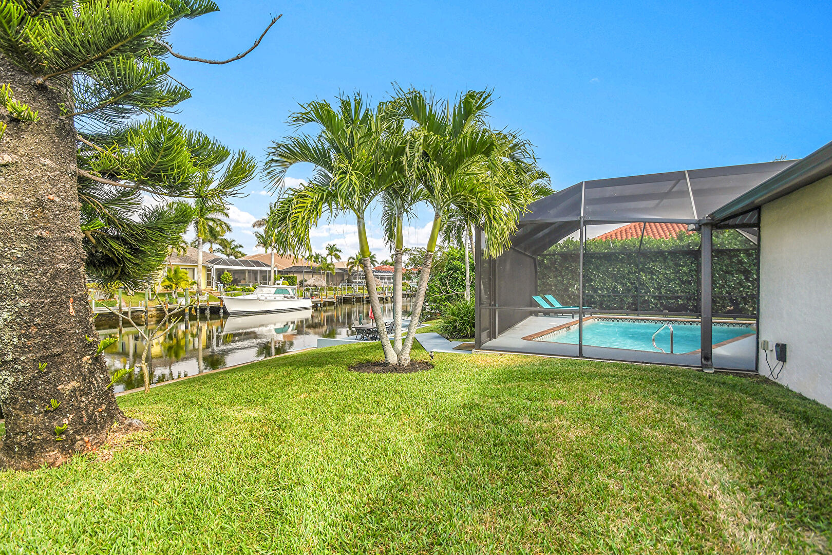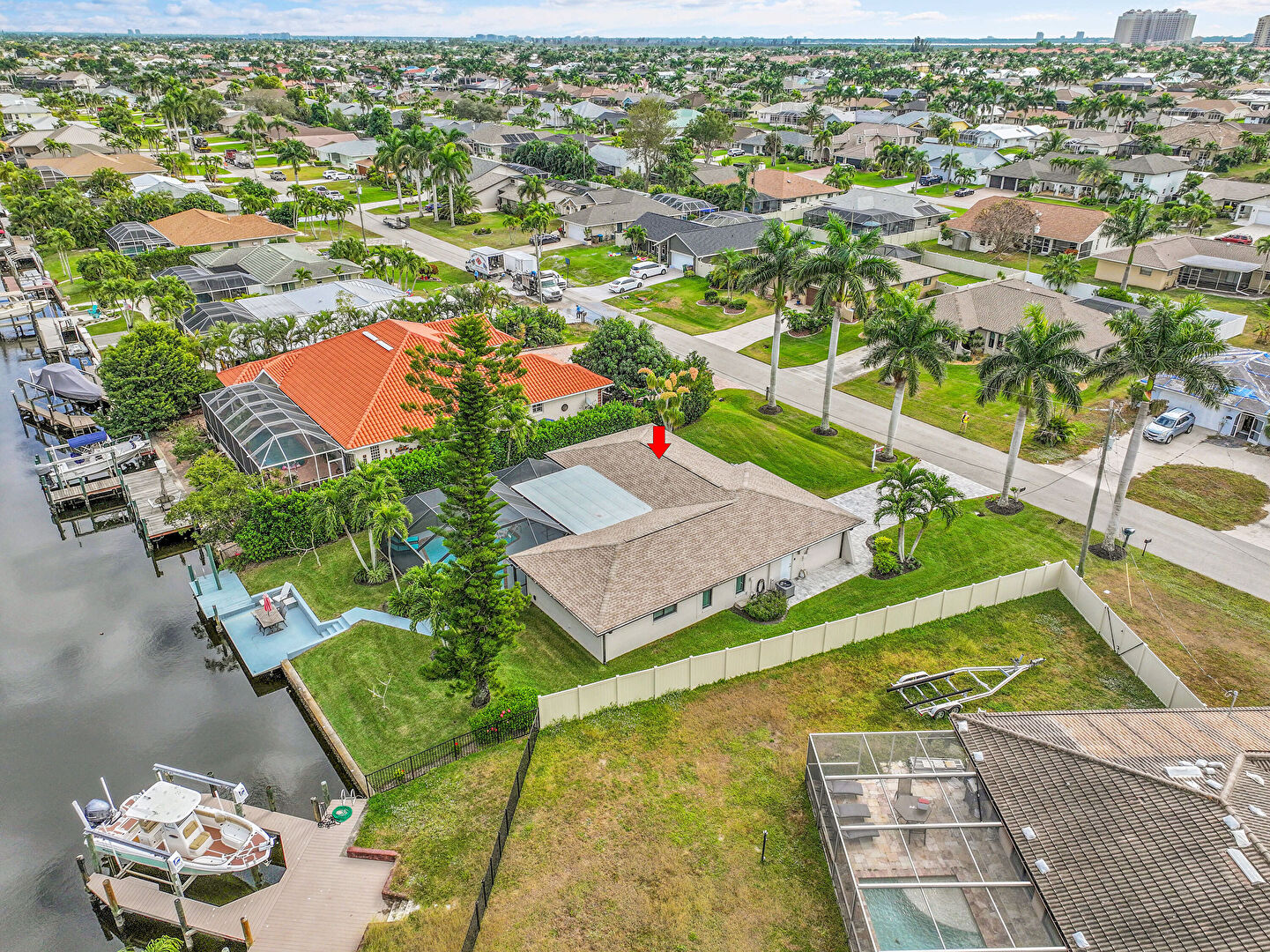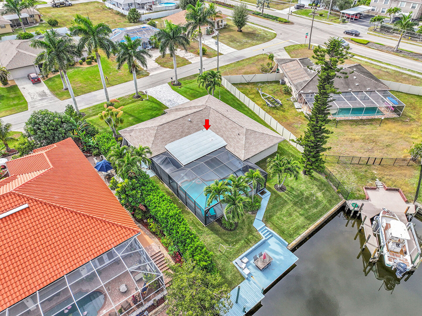 Boat Lift, Canalfront, Dock, Fence, Lanai, Lawn, Outdoor Dining Area, Patio, Residential View, Sunroom, Water View, Waterfront, Waterfront Bulkhead, Lawn, Residential View, Waterfront