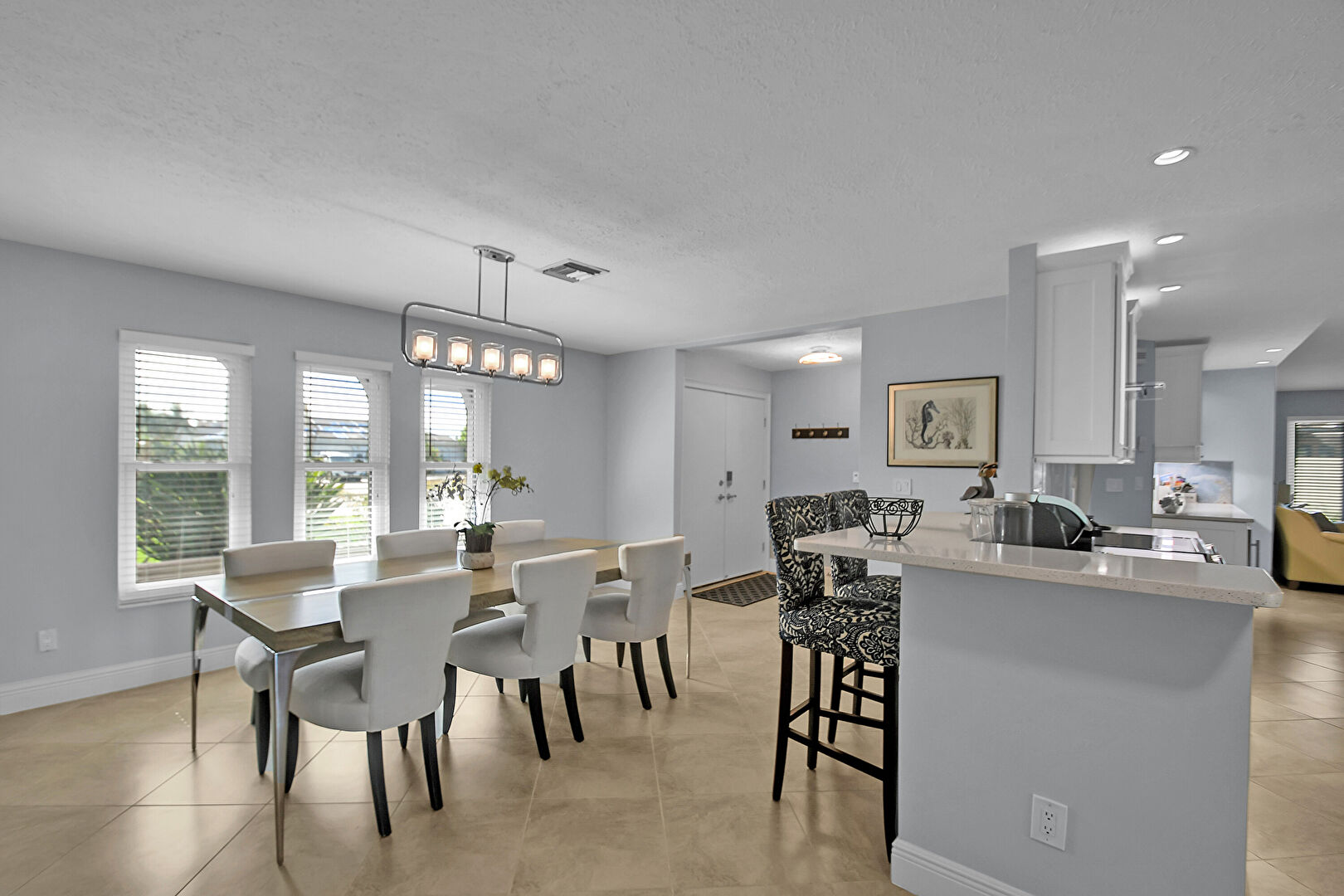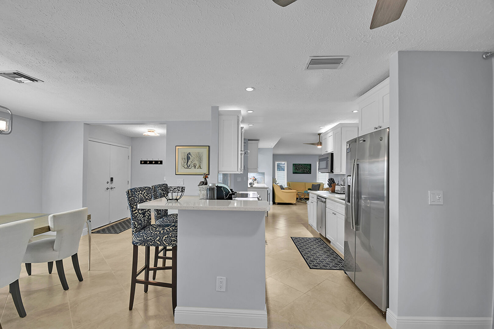 Baseboards Wall, Ceiling Fan, Drywall, Natural Light, Notable Chandelier, Recessed Lighting, Textured Ceiling, Tile Floor, Vent, Natural Light, Notable Chandelier, Vent