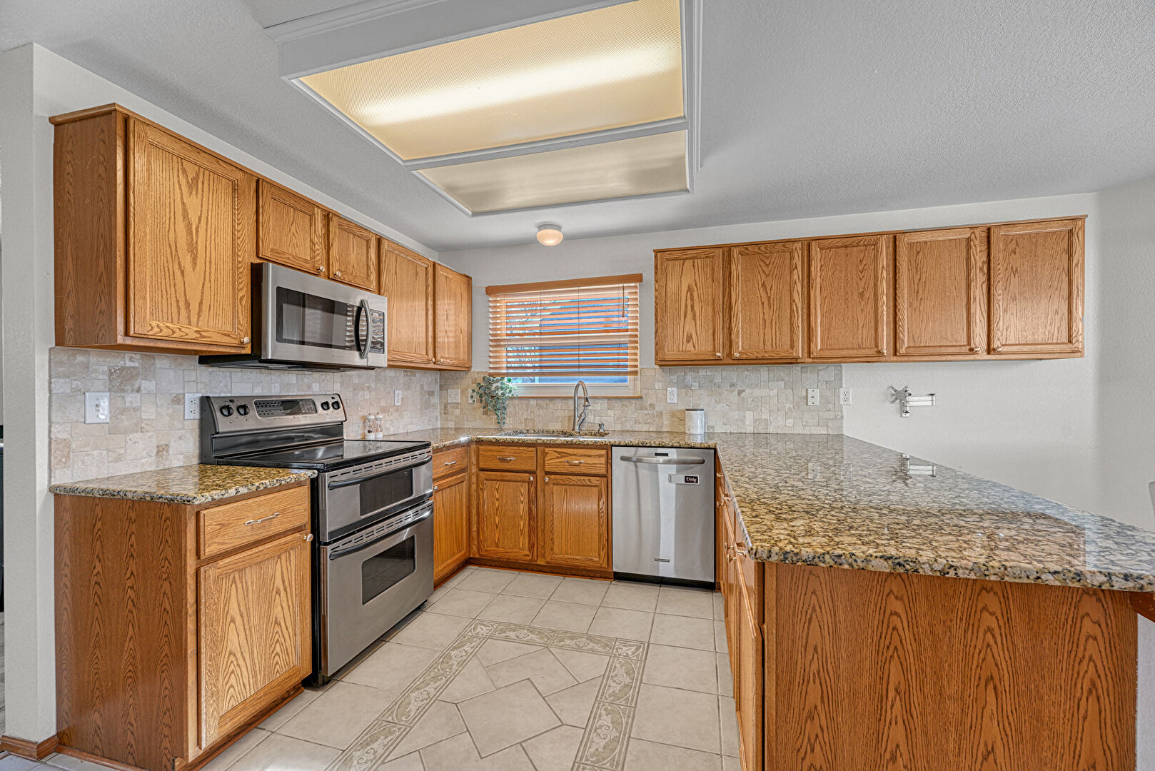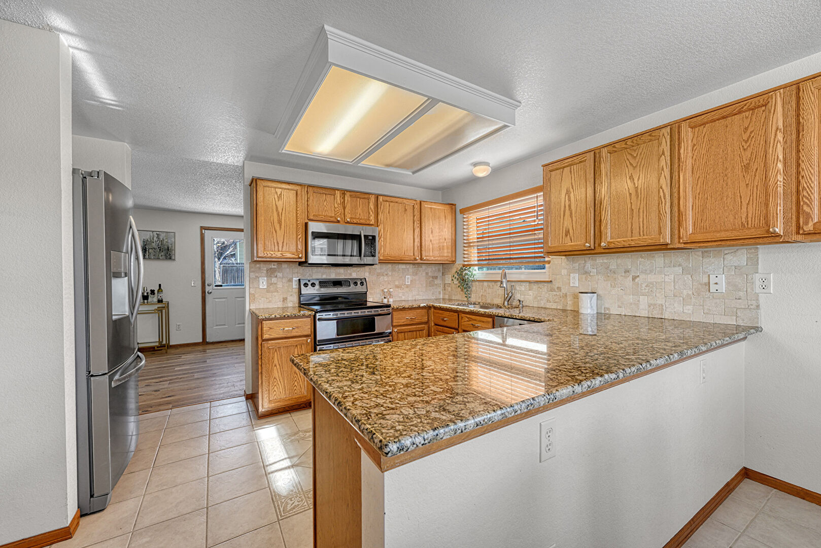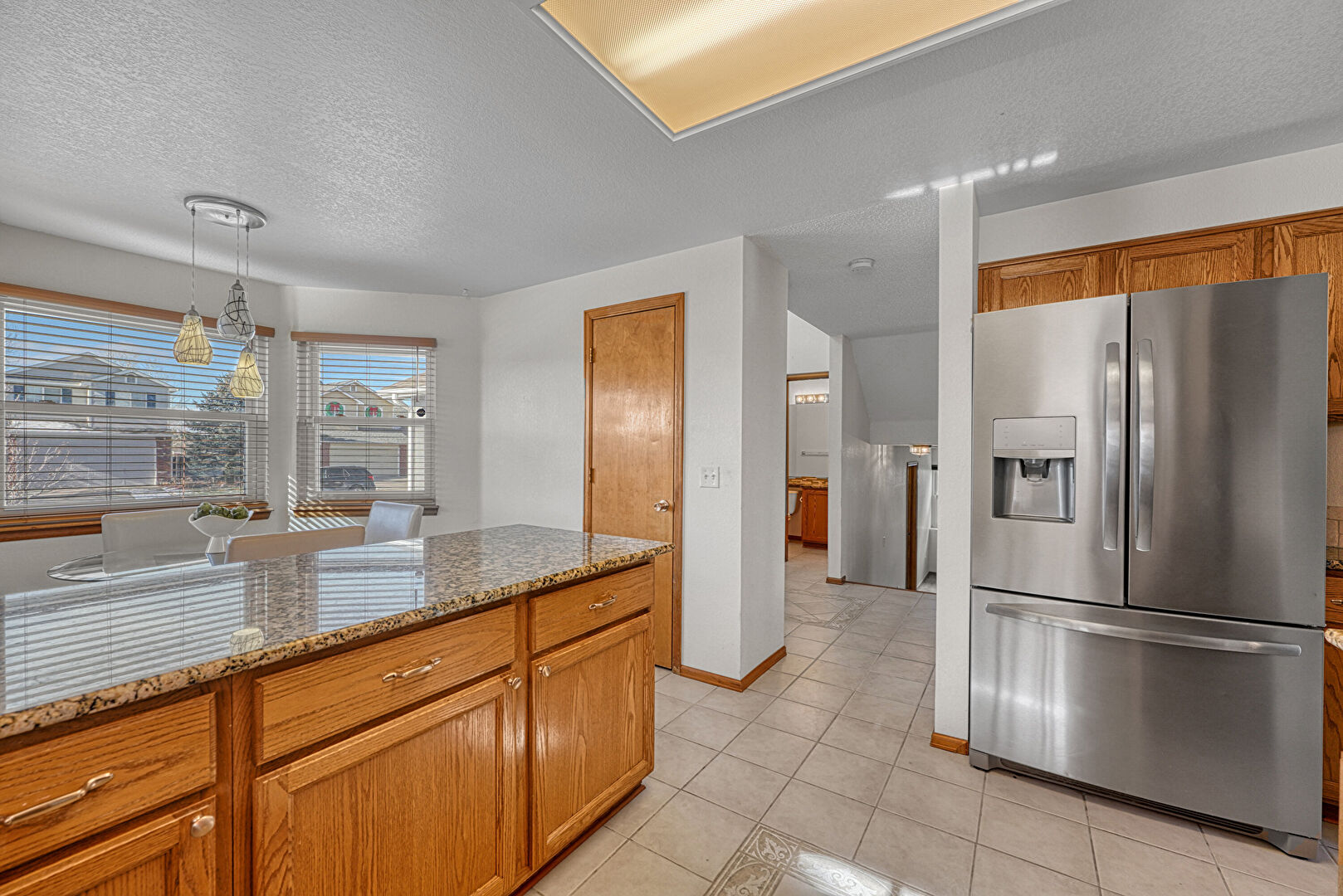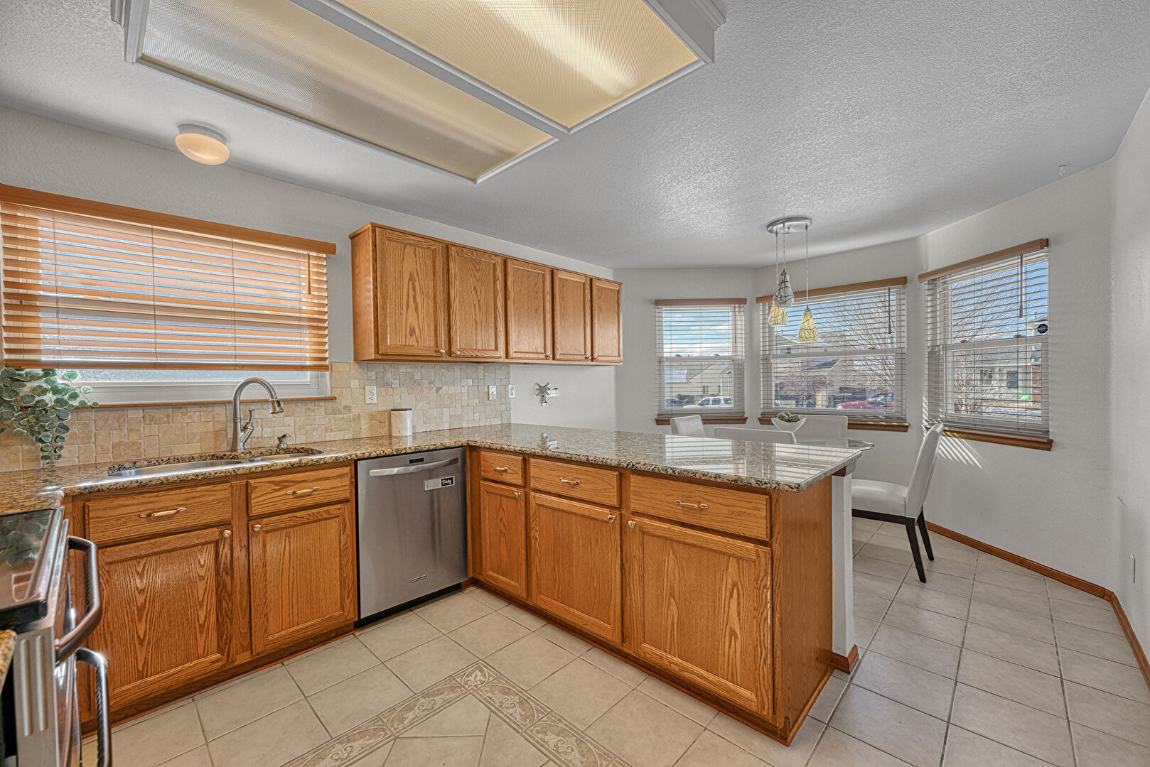Baseboards Wall, Drywall, G Shaped Kitchen, Inlaid Floor, Kitchen Peninsula, Medium Brown Cabinets, Natural Light, Pendant Lighting, Shaker Cabinets, Stone Countertops, Textured Ceiling, Tile Floor, Kitchen Peninsula, Medium Brown Cabinets, Shaker Cabinets