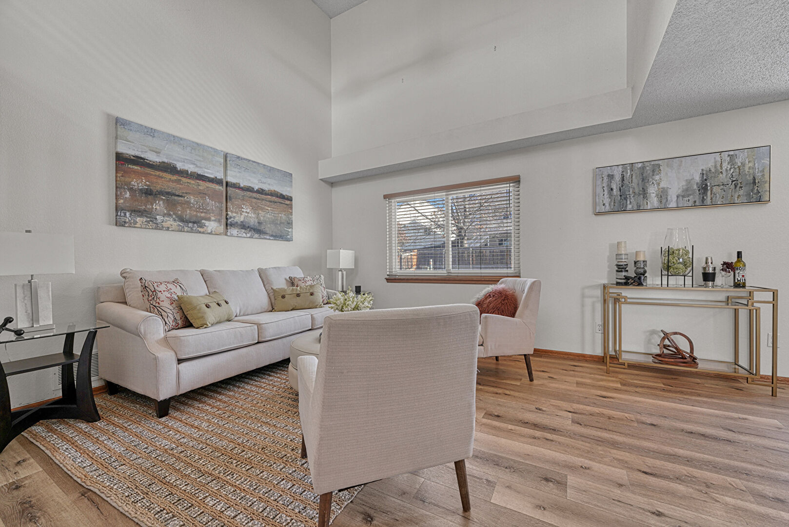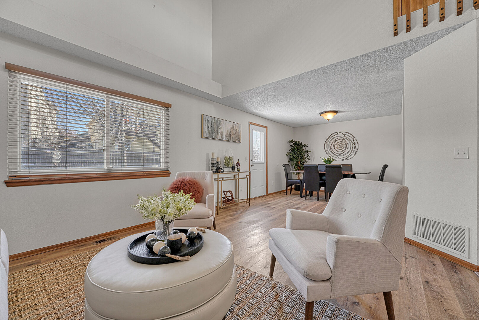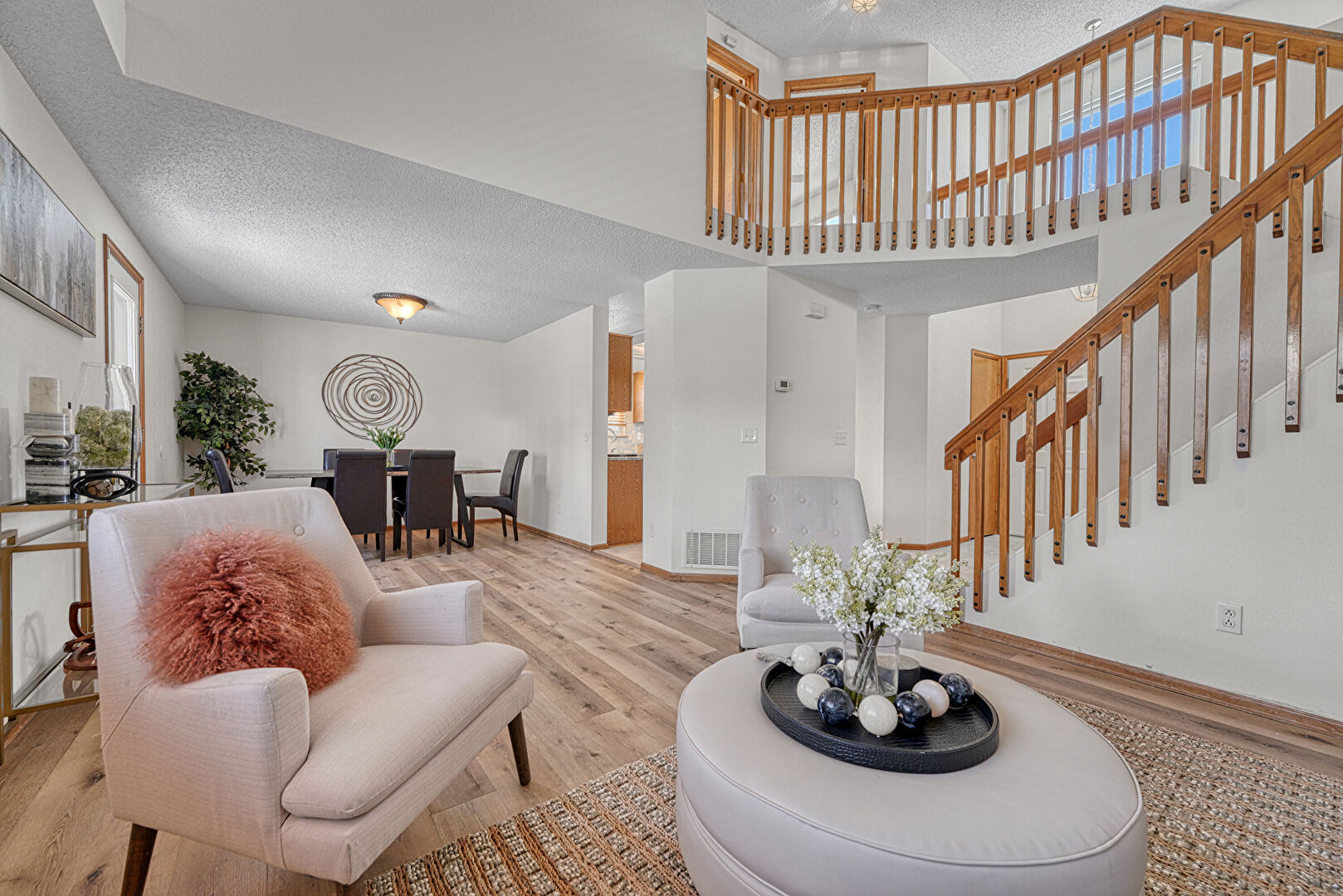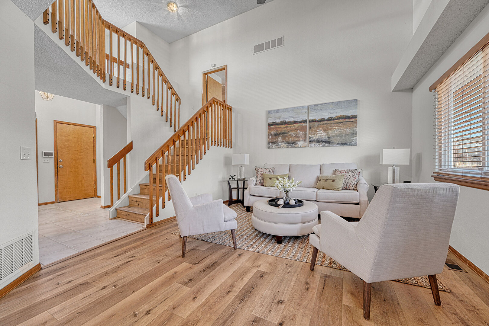 Baseboards Wall, Drywall, High Ceiling, Natural Light, Stairs, Textured Ceiling, Vaulted Ceiling, Vent, Wood Finish Floor, Drywall, Natural Light, Textured Ceiling