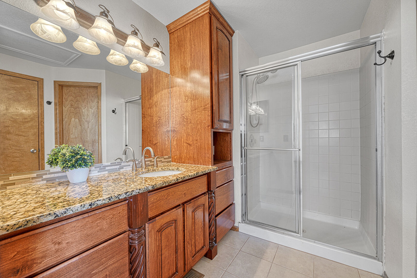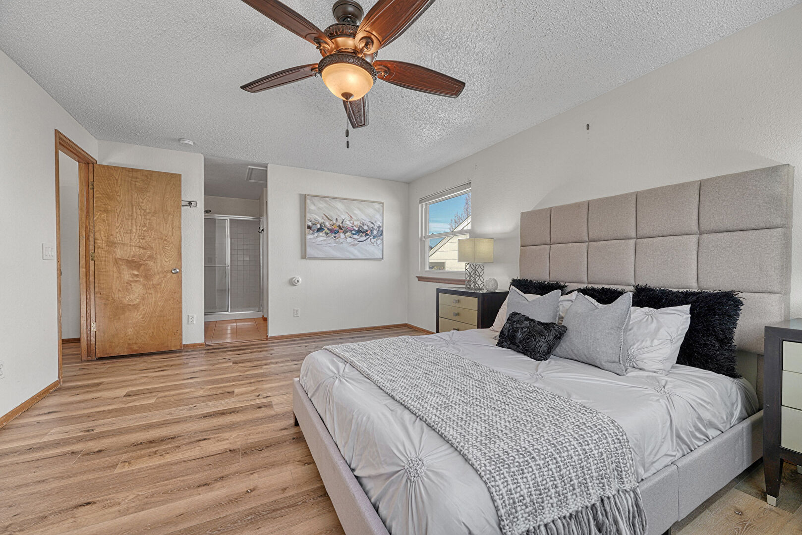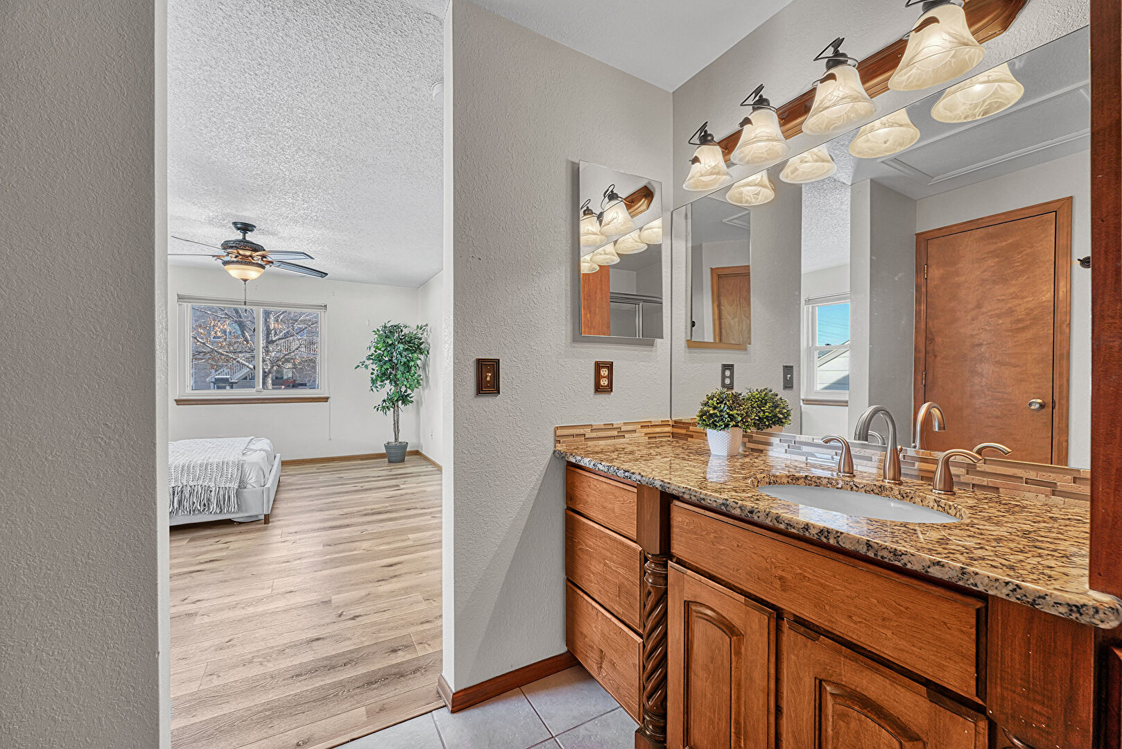 Ceiling Fan, Ensuite Bathroom, Full Bathroom, Natural Light, Textured Ceiling, Textured Wall, Tile Floor, Vanity, Wood Finish Floor, Baseboards Wall, Drywall
