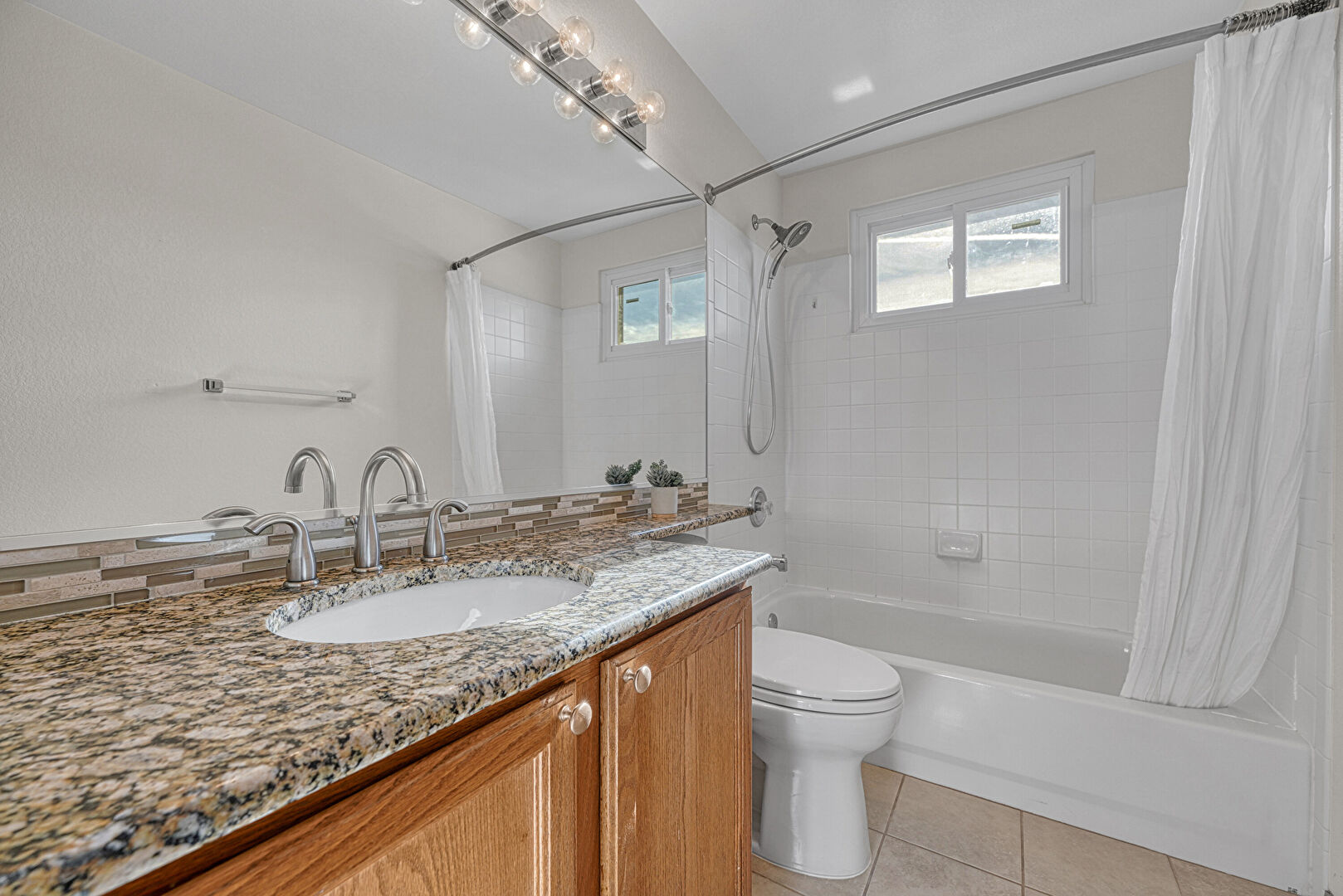 Combined Bath Shower, Drywall, Natural Light, Tile Floor, Vanity, Full Bathroom