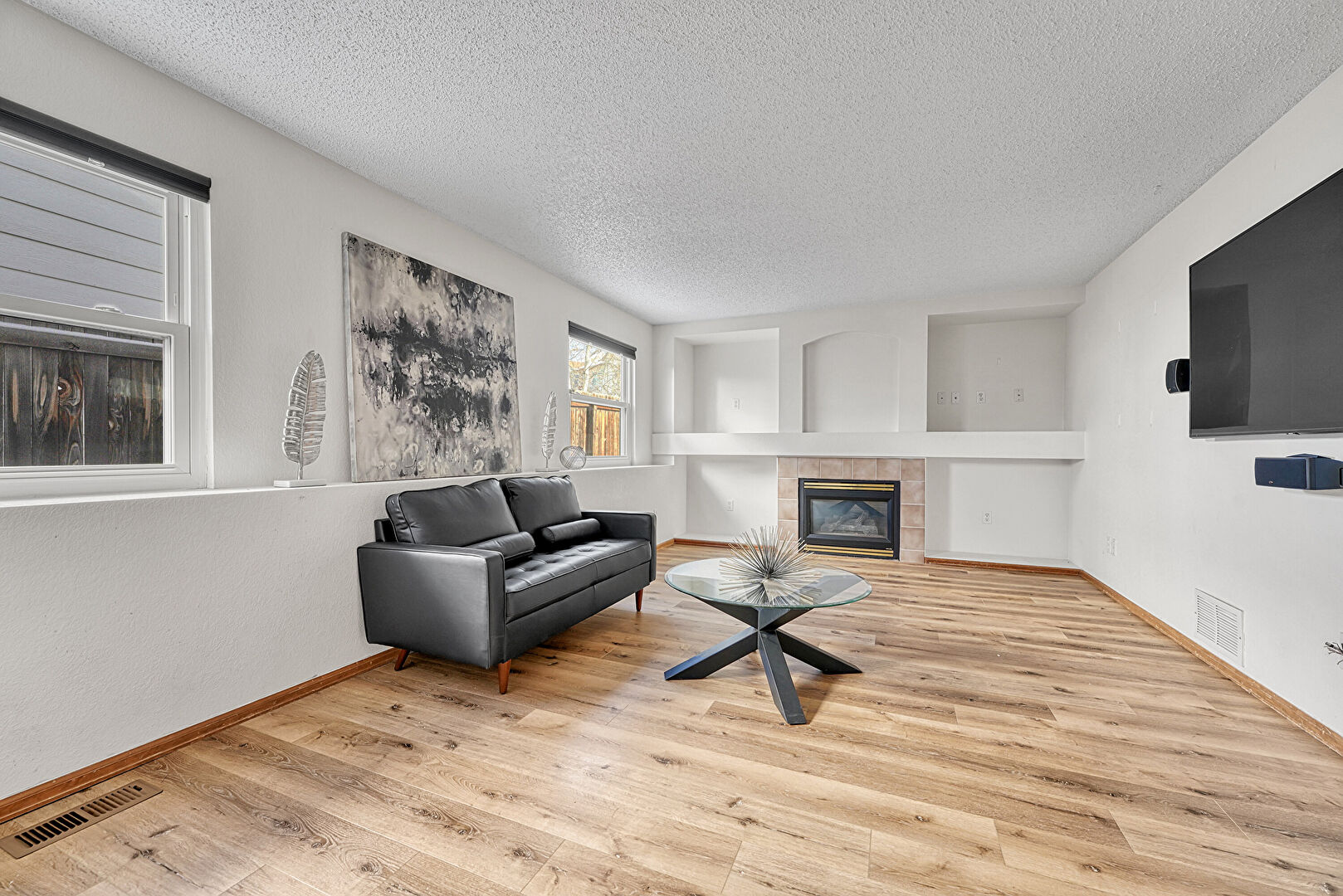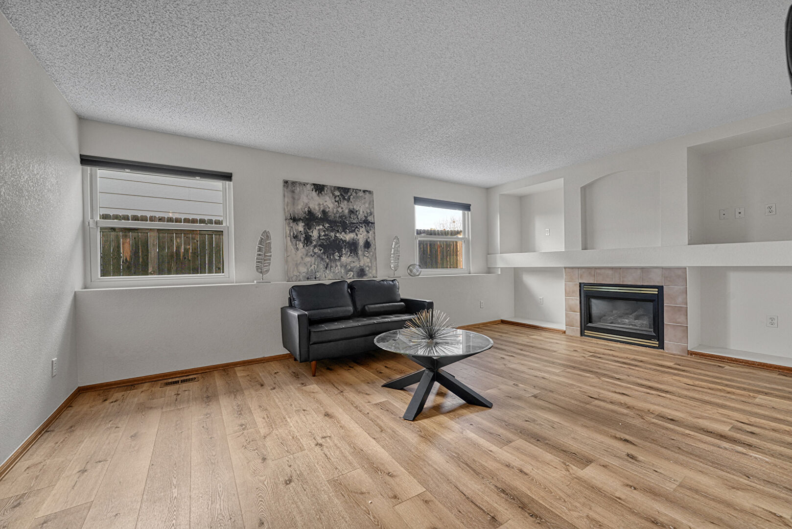 Baseboards Wall, Drywall, Fireplace, Natural Light, Textured Ceiling, Vent, Wood Finish Floor, Fireplace, Natural Light, Wood Finish Floor