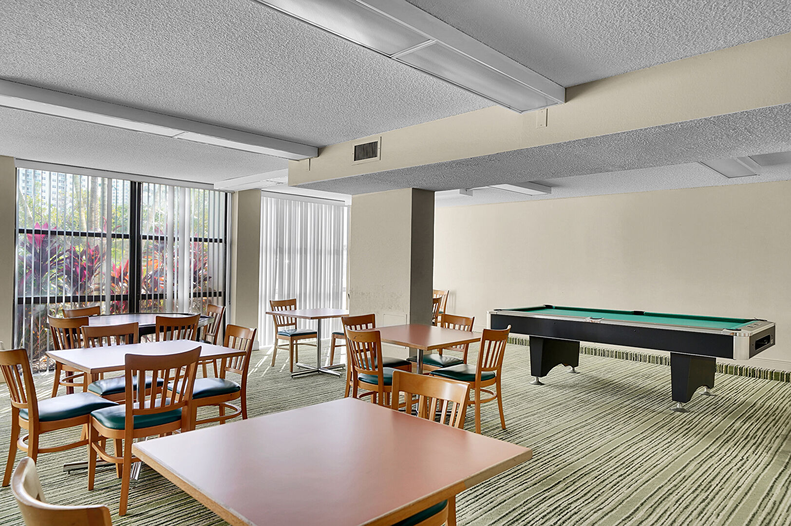 Baseboards Wall, Billiards, Carpet, Drywall, Floor Ceiling Windows, Natural Light, Textured Ceiling, Vent, Billiards, Vent