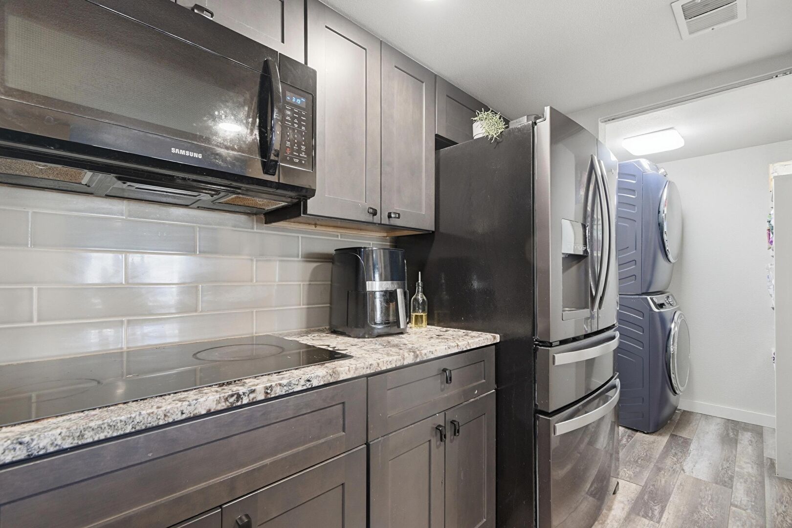 Baseboards Wall, Dark Brown Cabinets, Double Oven, Drywall, Galley Kitchen, Gray Cabinets, Kitchen Peninsula, Laundry, Opens To Living Area, Recessed Lighting, Shaker Cabinets, Stone Countertops, Vent, Washer Dryer, Wood Finish Floor, Drywall, Kitchen Peninsula, Laundry