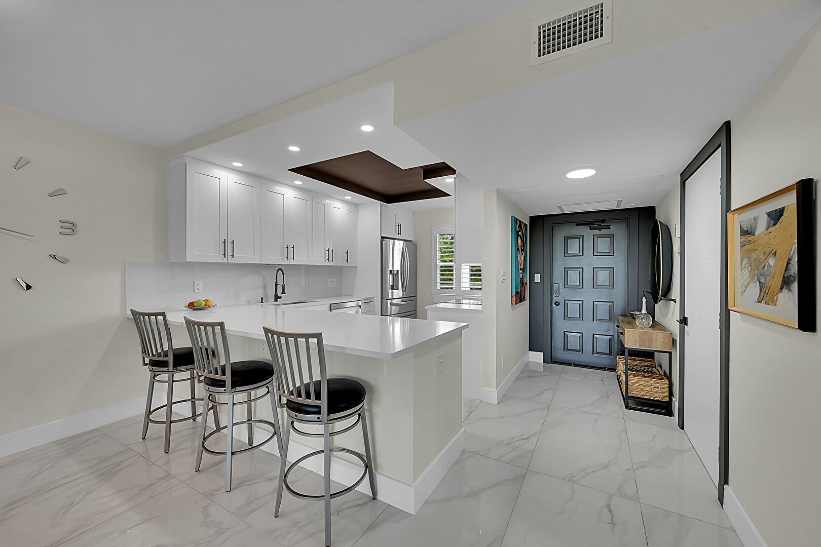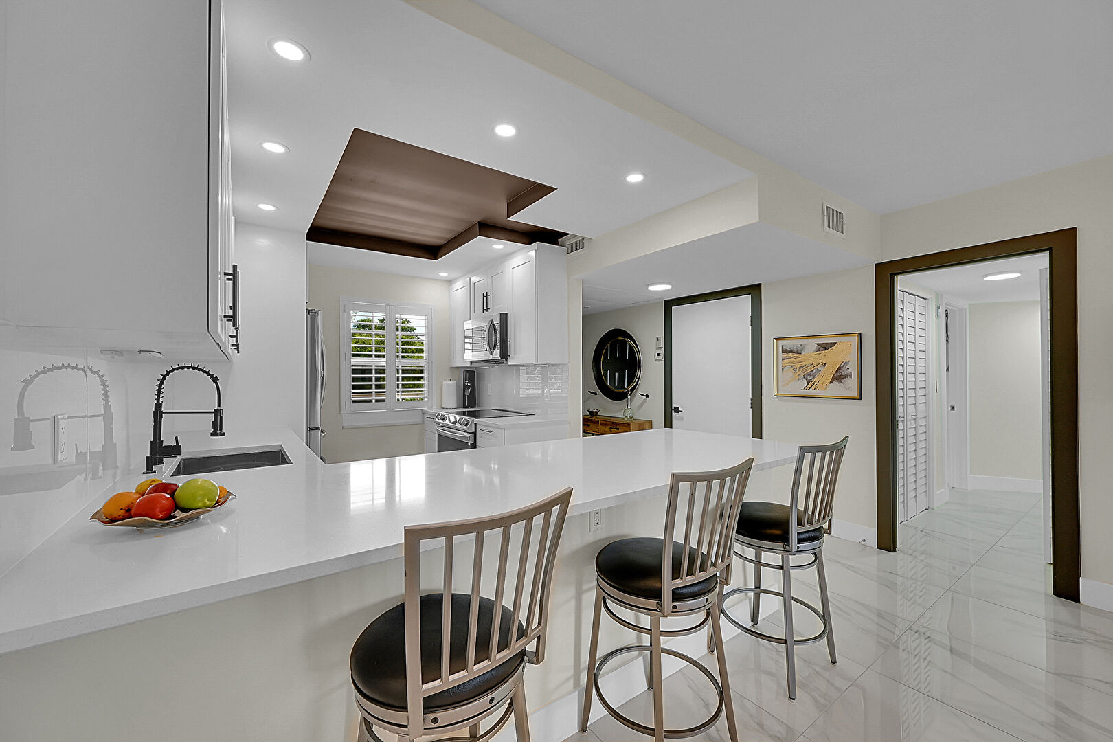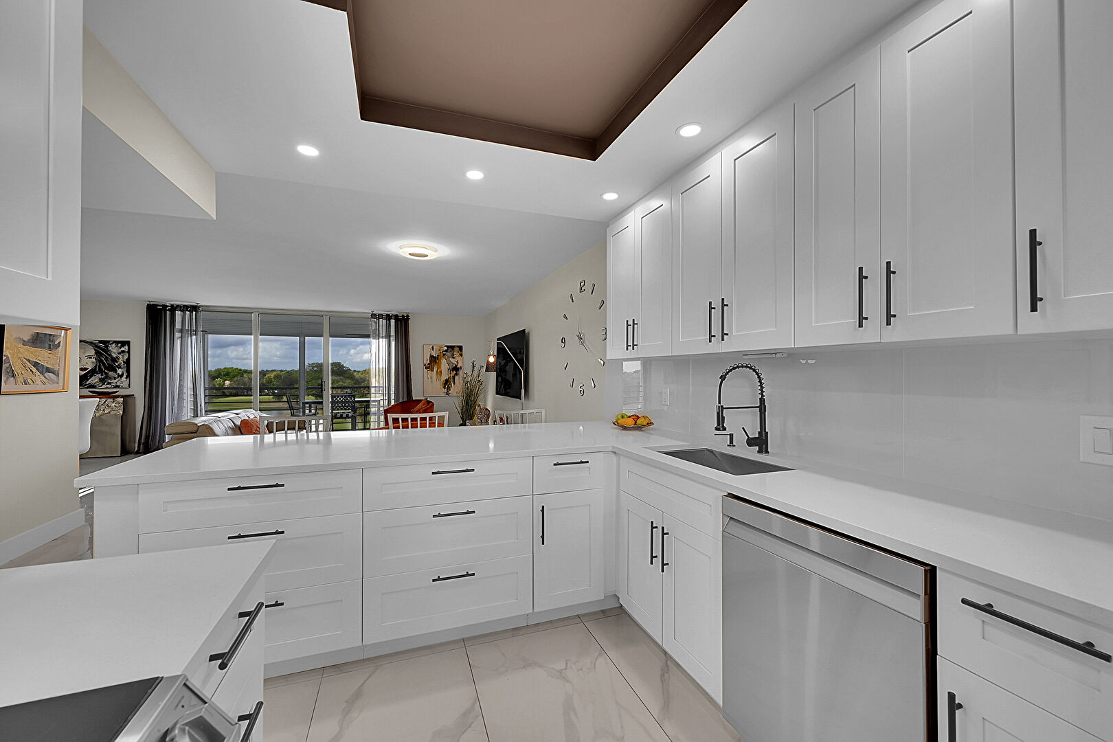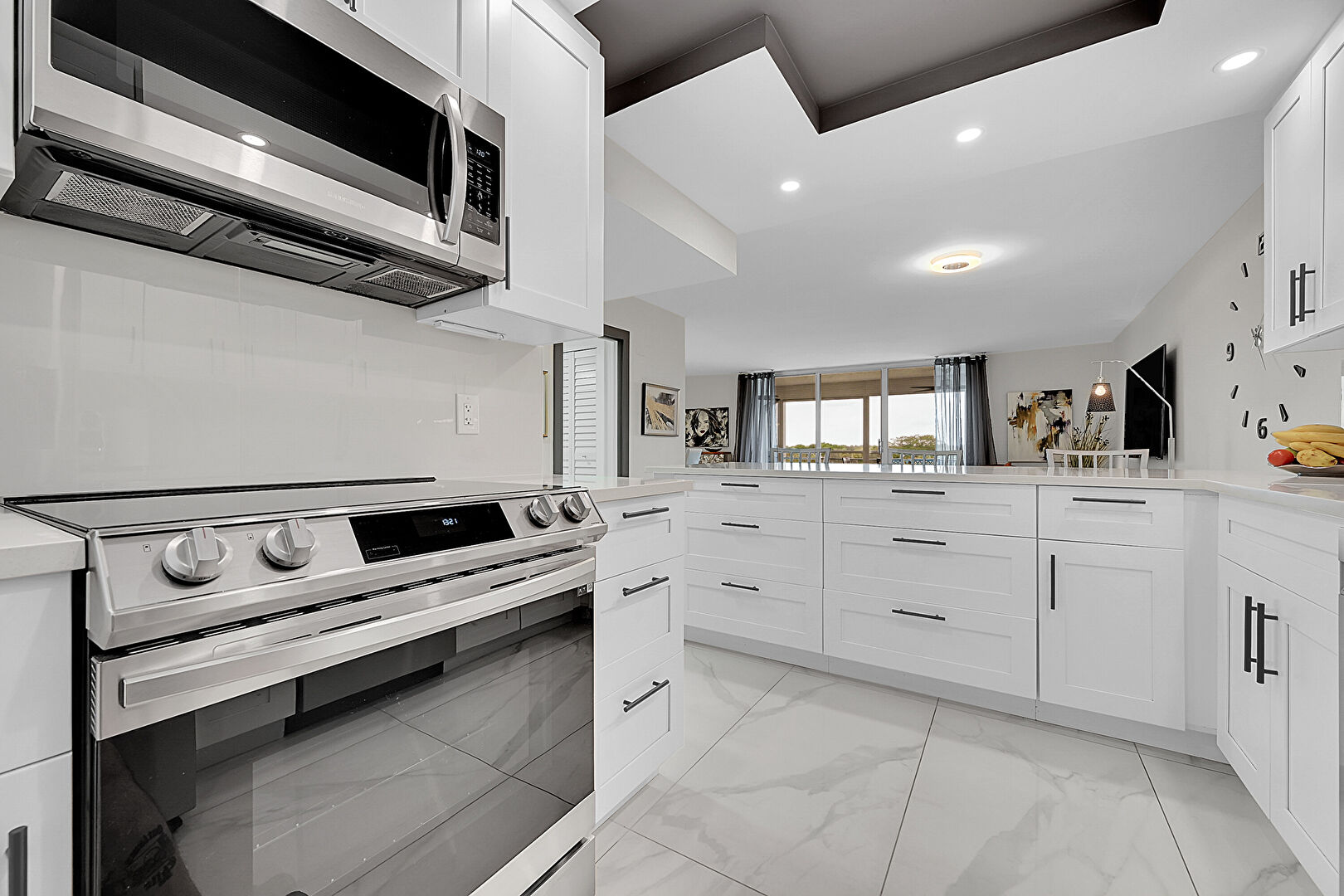 Baseboards Wall, Drywall, Floor Ceiling Windows, Kitchen Bar, Kitchen Peninsula, Marble Finish Floor, Natural Light, Opens To Living Area, Recessed Lighting, Shaker Cabinets, Stone Countertops, Tile Floor, Tray Ceiling, U Shaped Kitchen, Vent, Drywall, Kitchen Bar, Marble Finish Floor, Natural Light, Recessed Lighting, U Shaped Kitchen