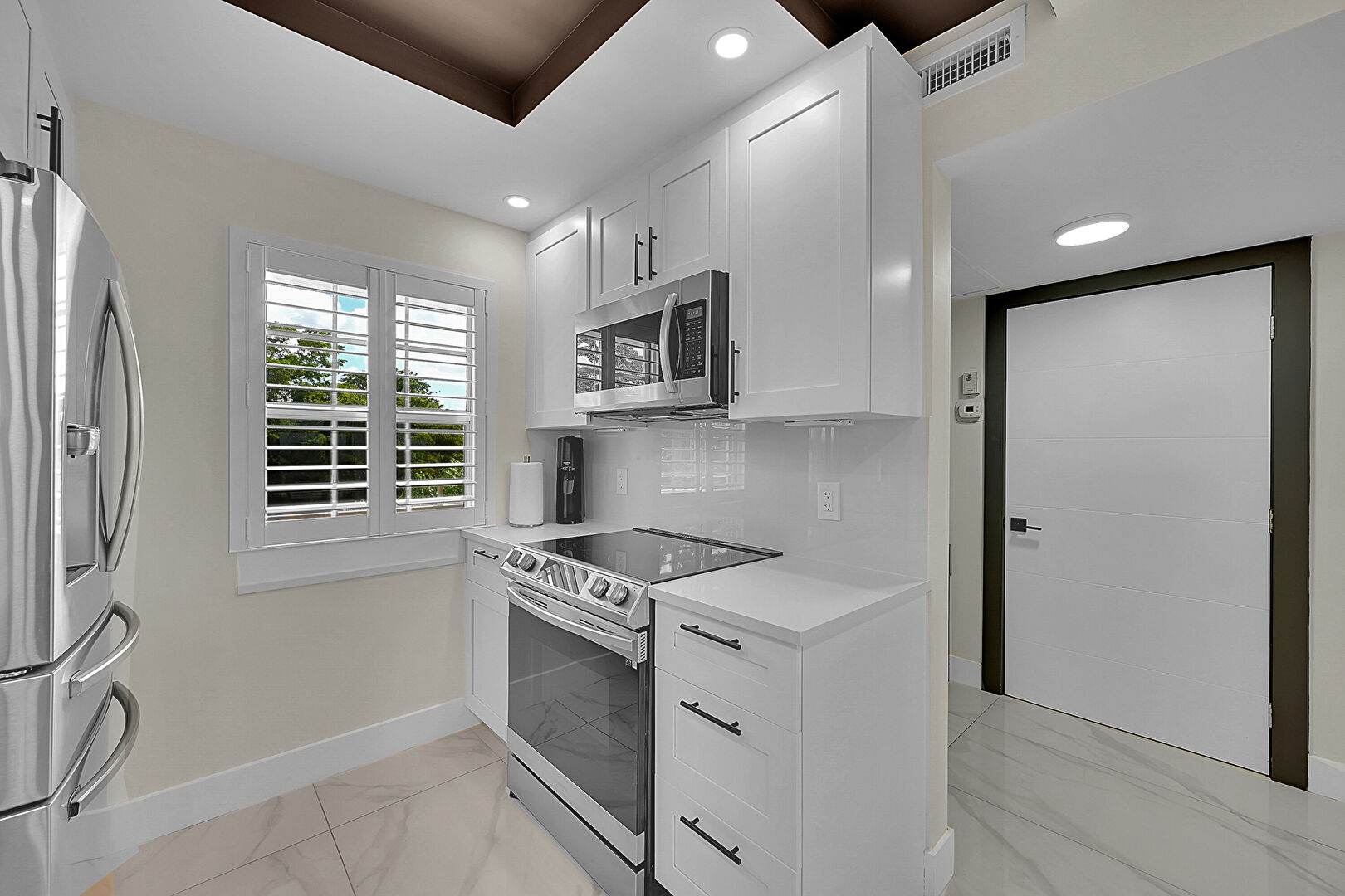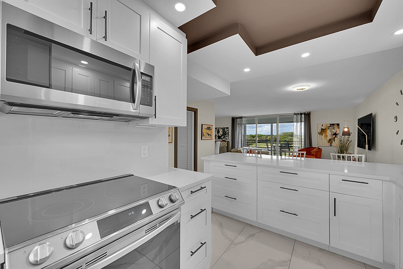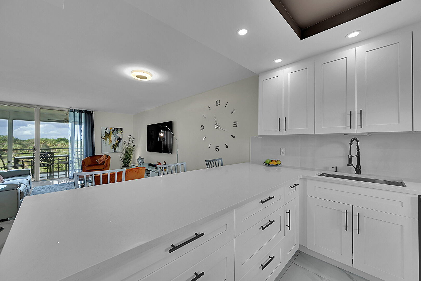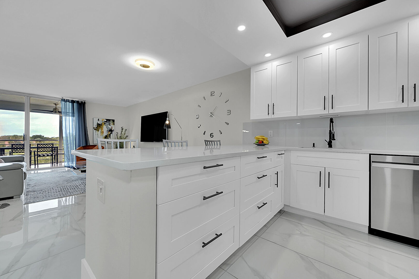 Baseboards Wall, Drywall, Floor Ceiling Windows, Kitchen Bar, Kitchen Peninsula, Marble Finish Floor, Natural Light, Opens To Living Area, Recessed Lighting, Shaker Cabinets, Stone Countertops, Tile Floor, Tray Ceiling, U Shaped Kitchen, Vent, Drywall, Kitchen Bar, Marble Finish Floor, Natural Light, Recessed Lighting, U Shaped Kitchen