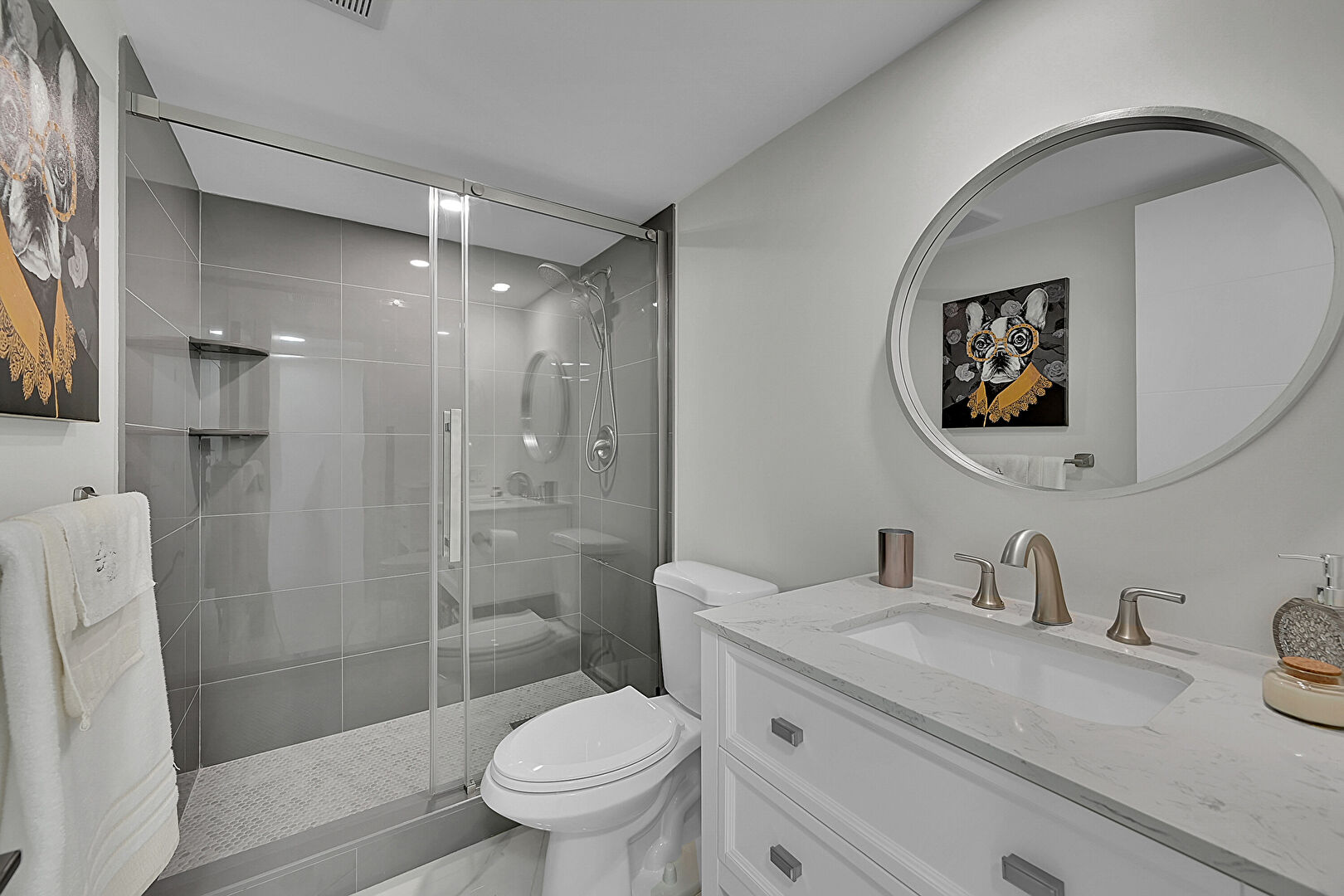 Full Bathroom, Marble Finish Floor, Recessed Lighting, Vanity, Vent, Drywall