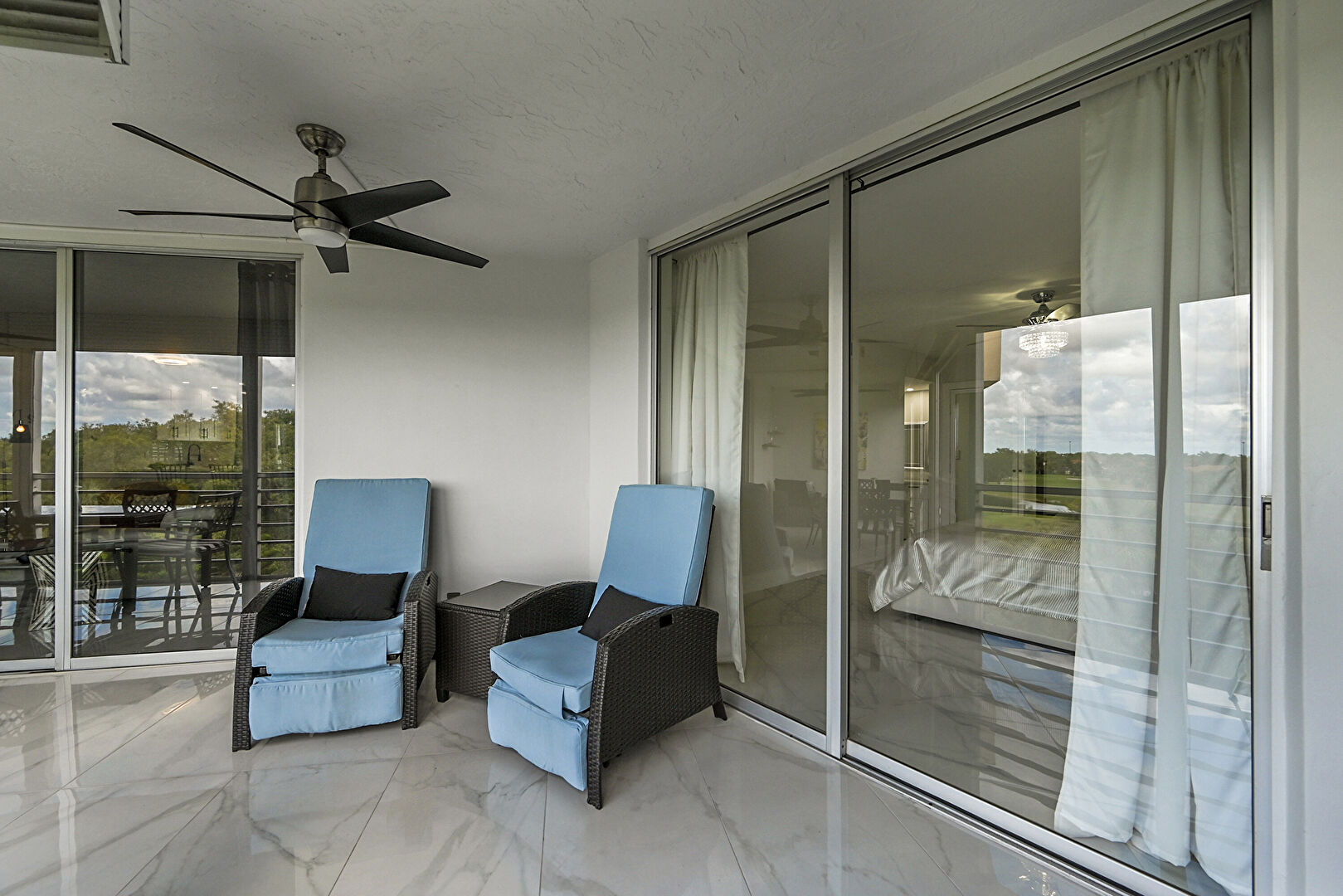 Balcony, Ceiling Fan, Drywall, Floor Ceiling Windows, Golf Course View, Marble Finish Floor, Natural Light, Outdoor Dining Area, Sunroom, Textured Ceiling, Vent, Water View, Waterfront, Woods View, Balcony, Natural Light, Woods View