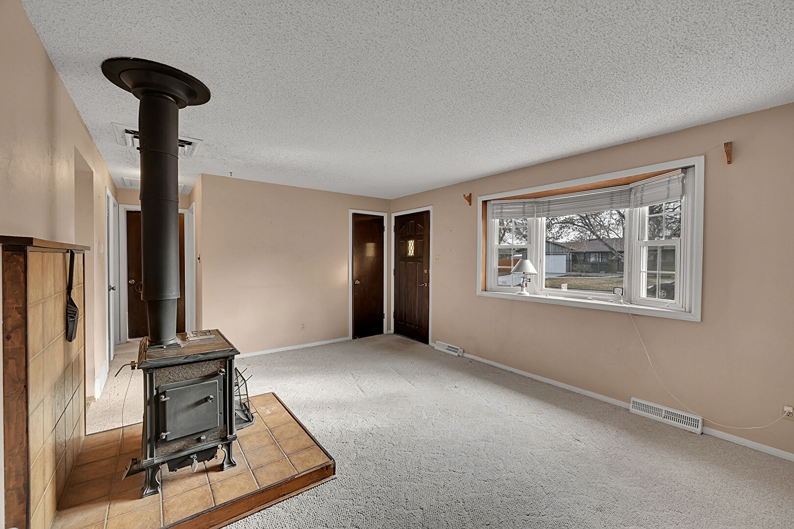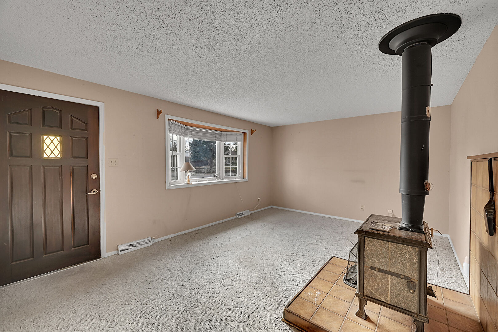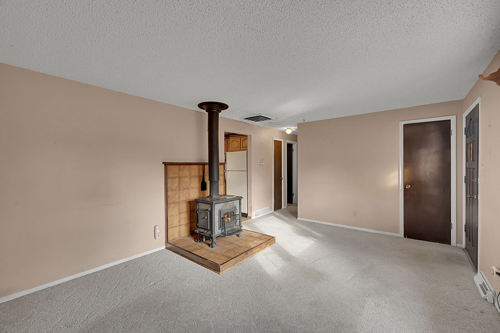 Baseboards Wall, Carpet, Drywall, Natural Light, Textured Ceiling, Tile Floor, Vent, Wood Stove, Baseboard Radiator, Carpet, Wood Stove
