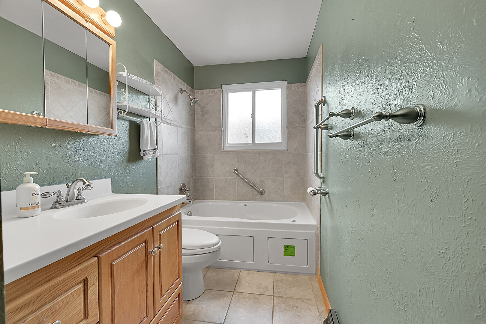Baseboards Wall, Combined Bath Shower, Natural Light, Textured Wall, Tile Floor, Vanity, Full Bathroom