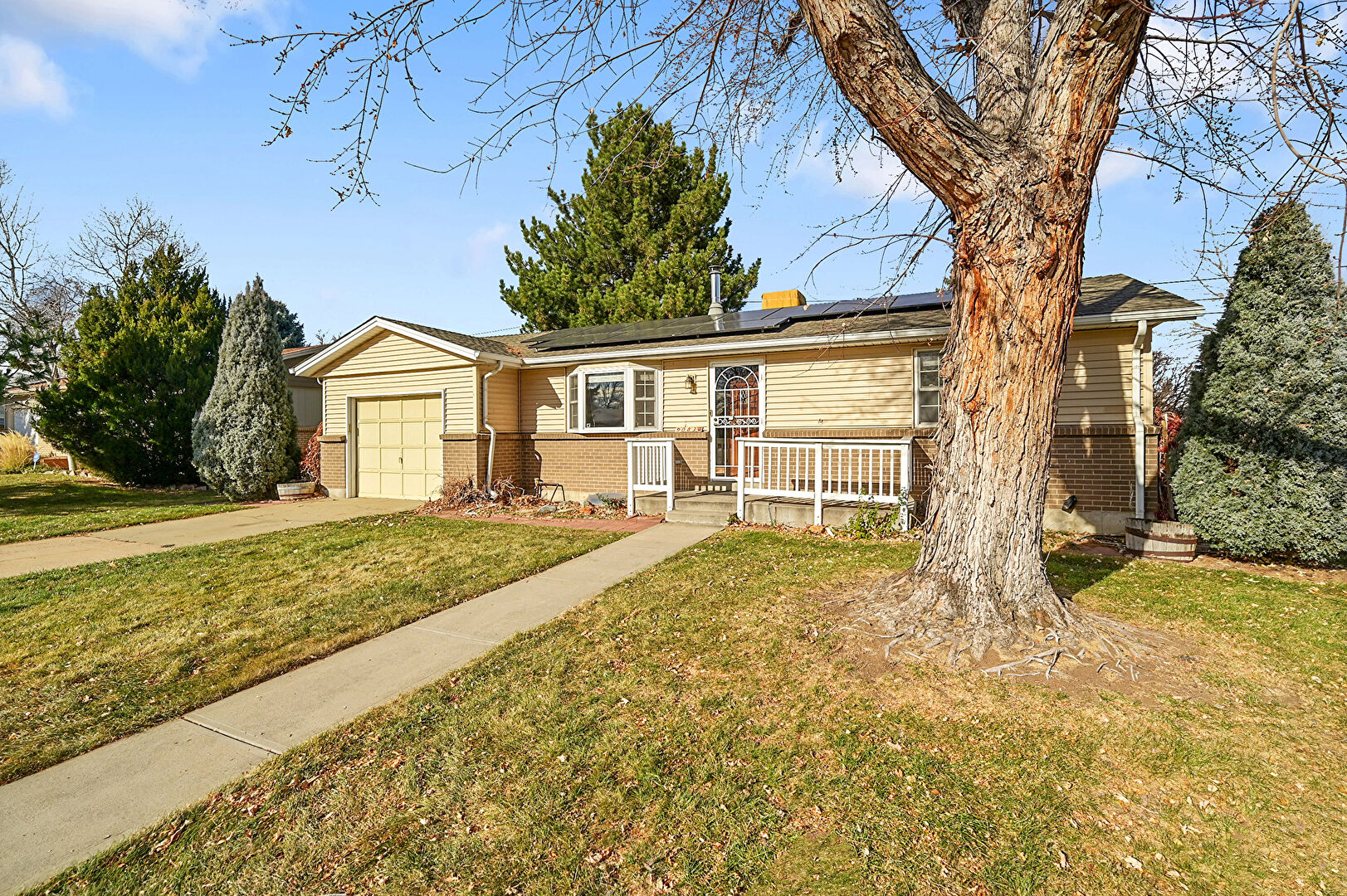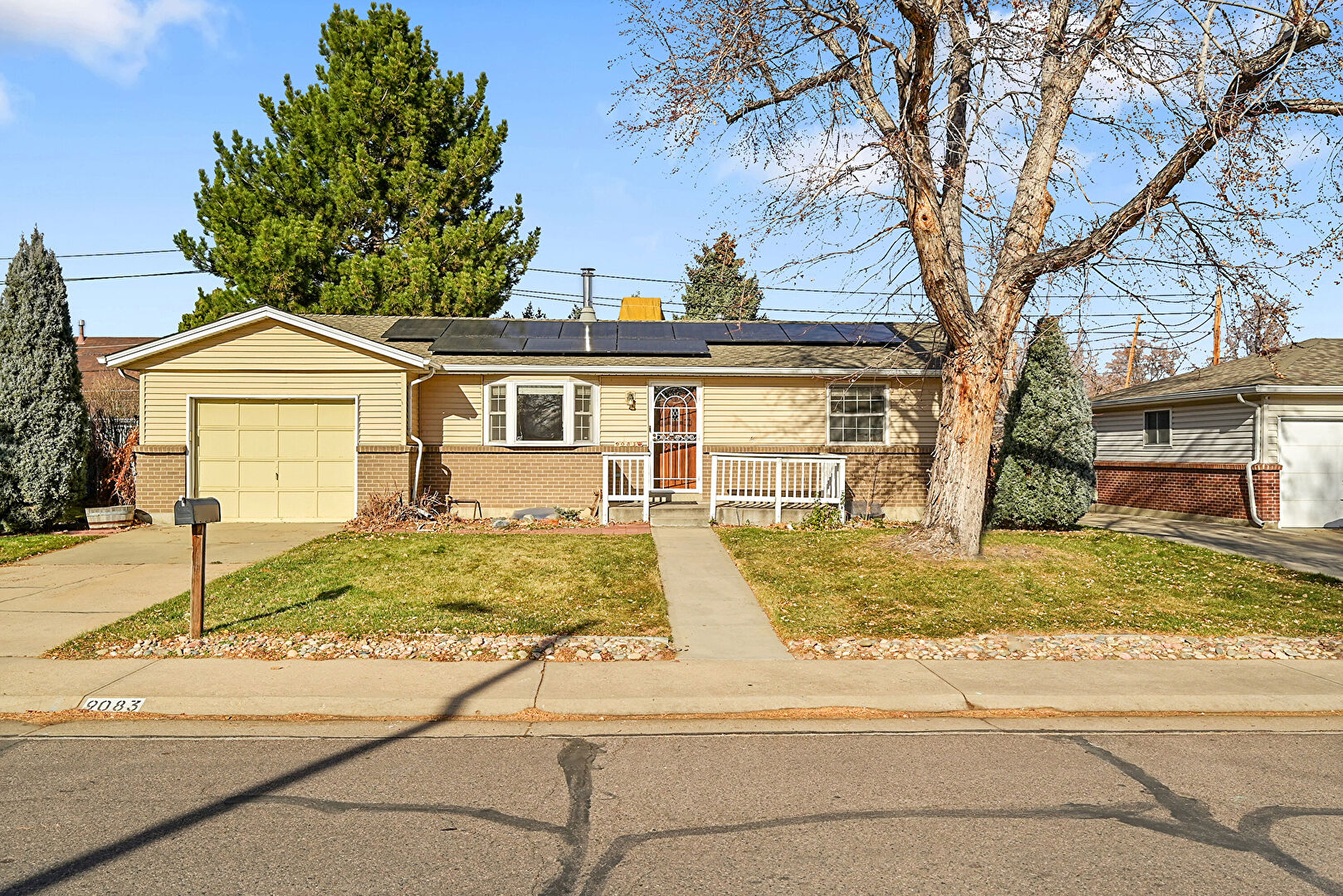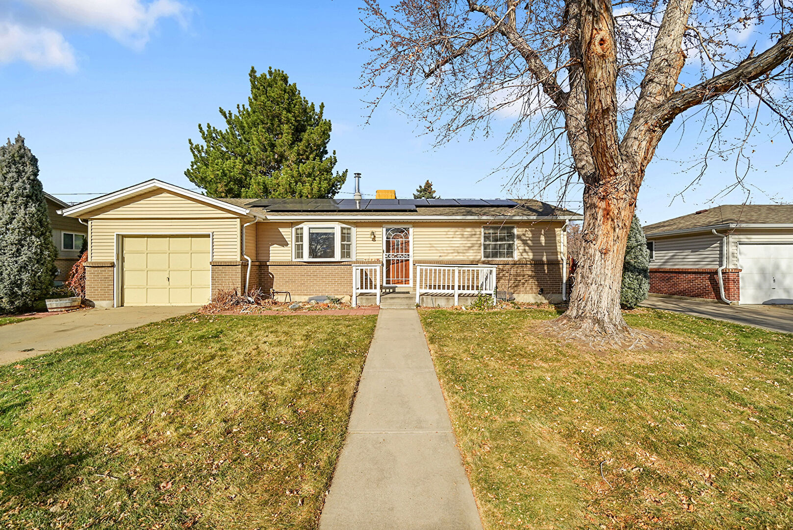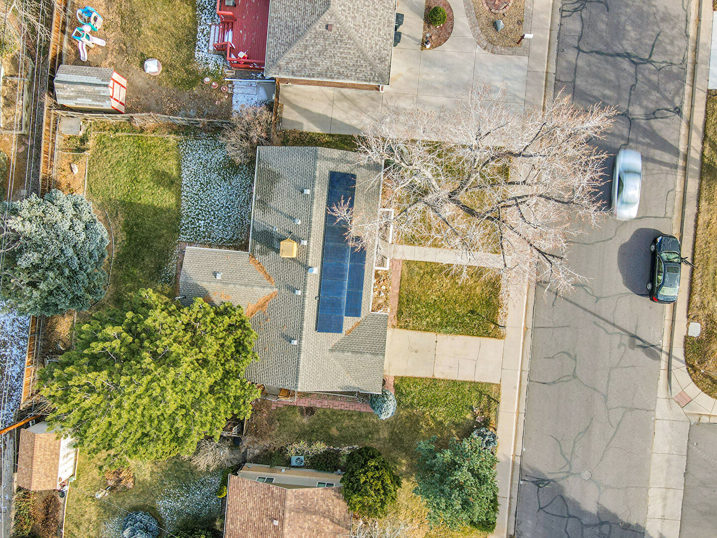 Brick Siding, Chimney, Concrete Foundation, Downspout, Driveway, Fence, Gutters, Lawn, Solar Panels, Stoop, Horizontal Siding