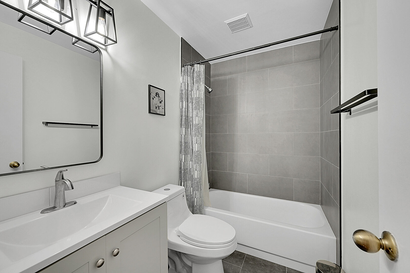 Combined Bath Shower, Drywall, Full Bathroom, Vanity, Vent, Tile Floor