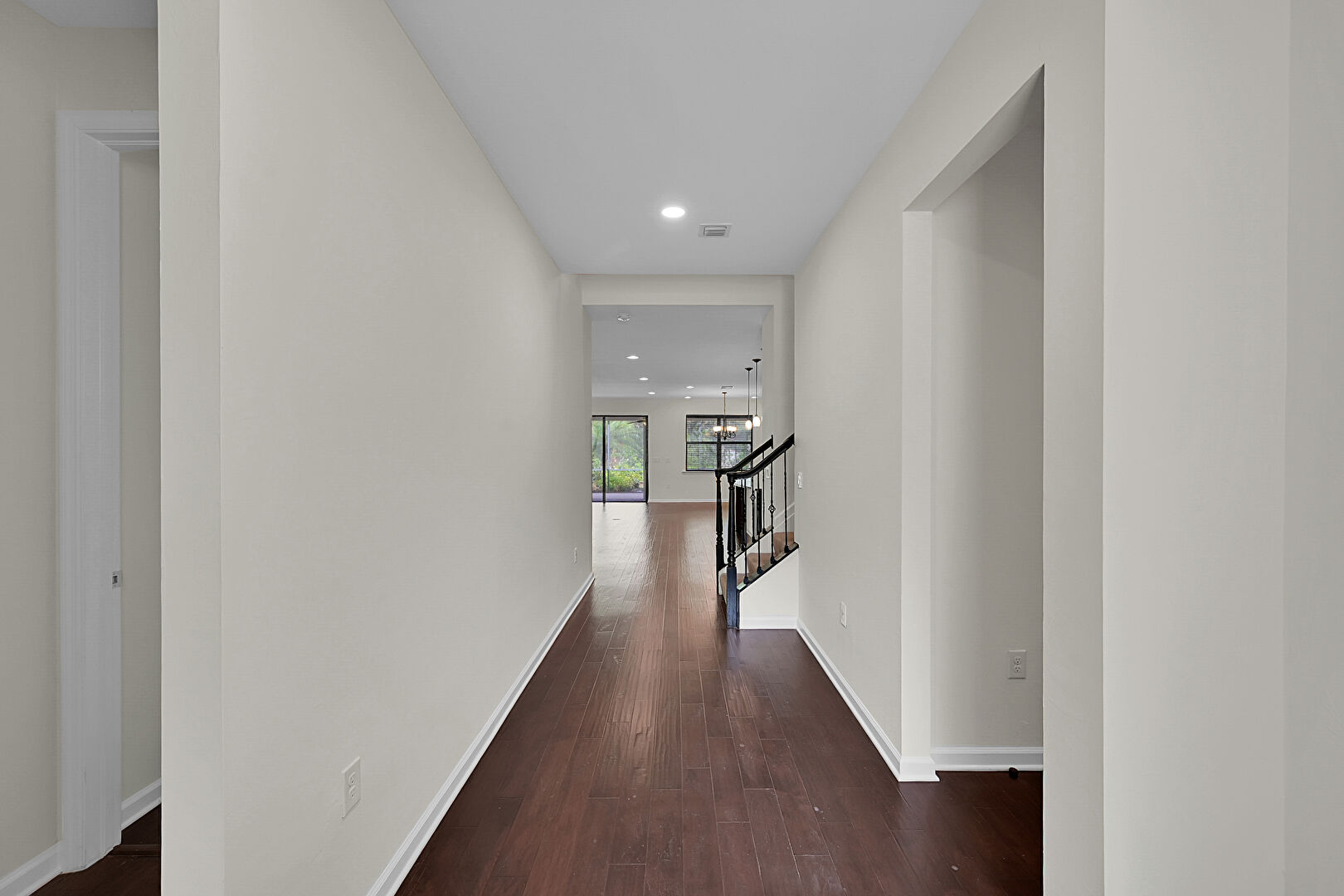 Baseboards Wall, Drywall, Natural Light, Notable Chandelier, Recessed Lighting, Stairs, Wood Finish Floor, Vent