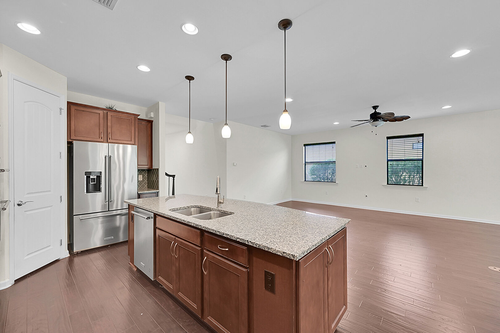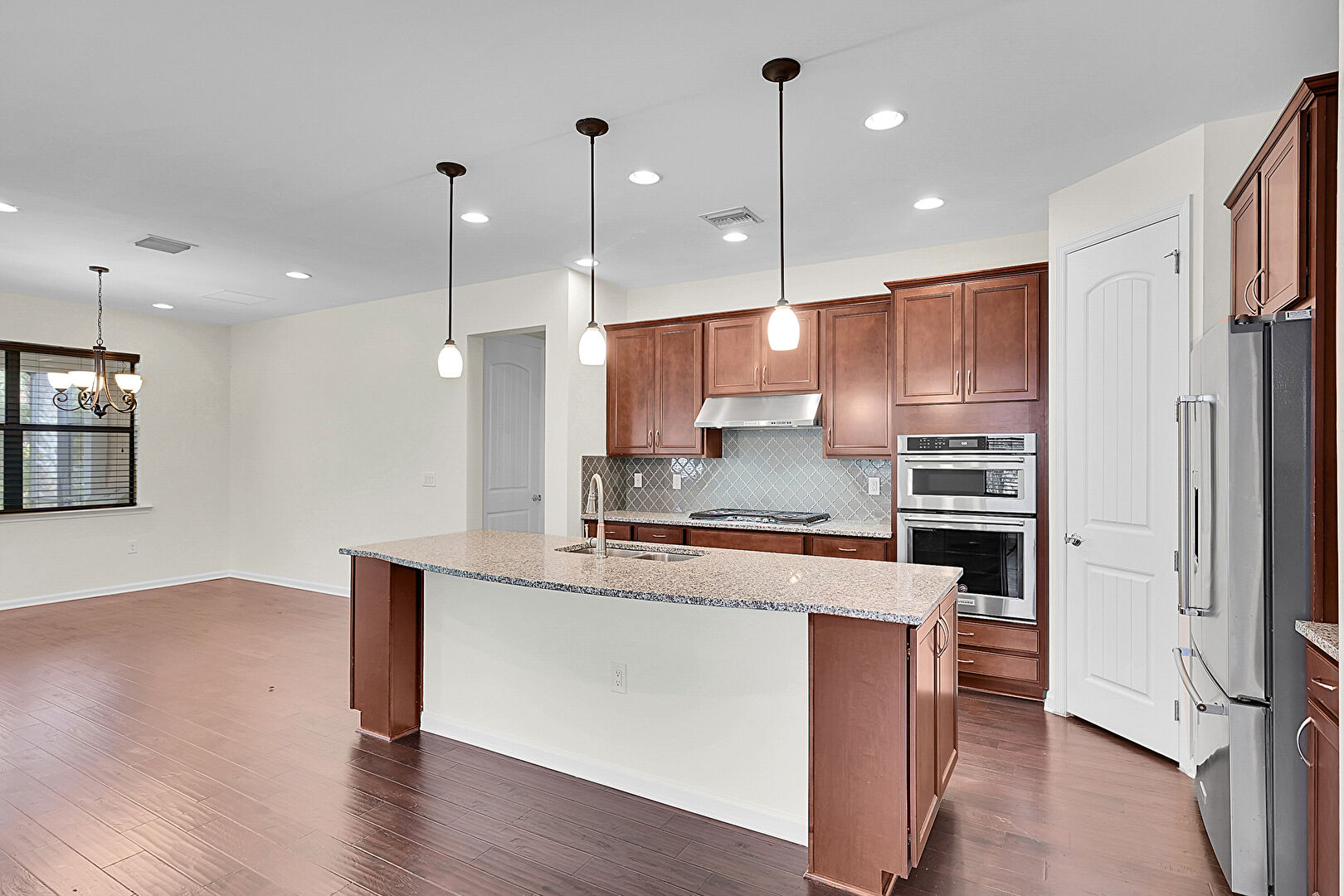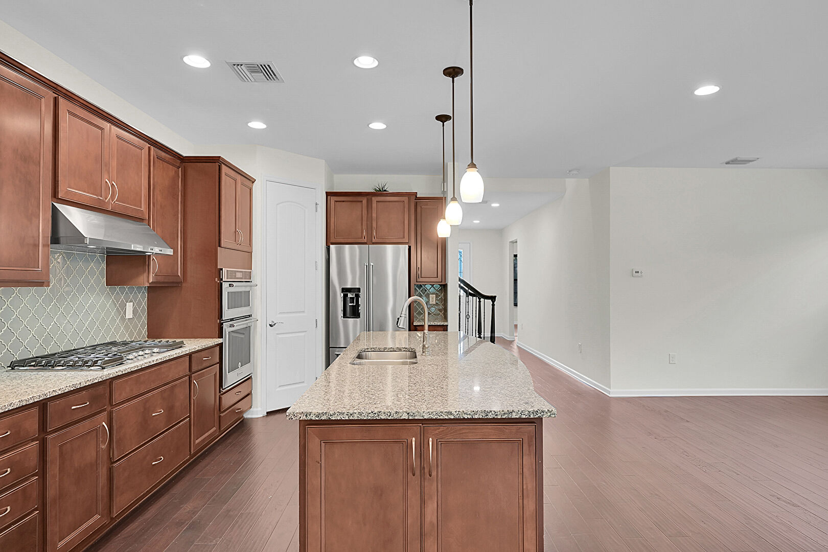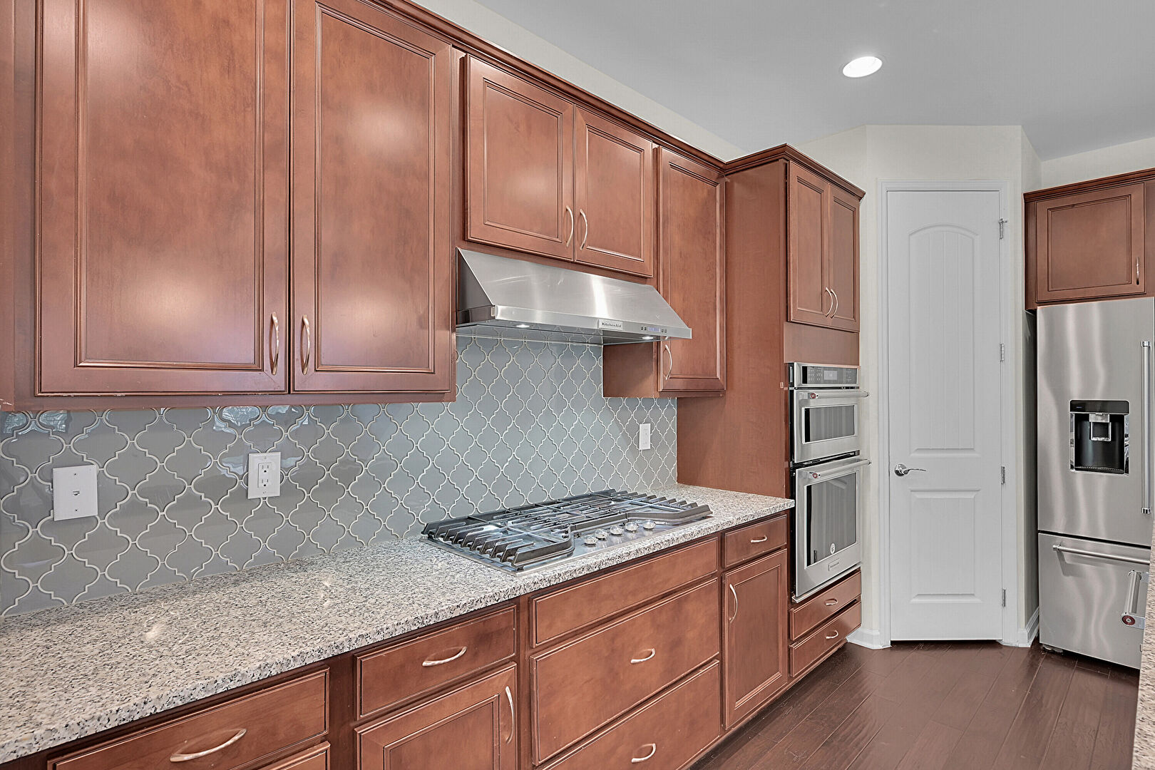 Baseboards Wall, Ceiling Fan, Crown Molding Cabinets, Double Oven, Drywall, Kitchen Bar, Kitchen Island, L Shaped Kitchen, Medium Brown Cabinets, Natural Light, Notable Chandelier, Opens To Living Area, Pendant Lighting, Recessed Lighting, Shaker Cabinets, Stone Countertops, Vent, Wood Finish Floor, Kitchen Bar, Pendant Lighting, Recessed Lighting, Shaker Cabinets
