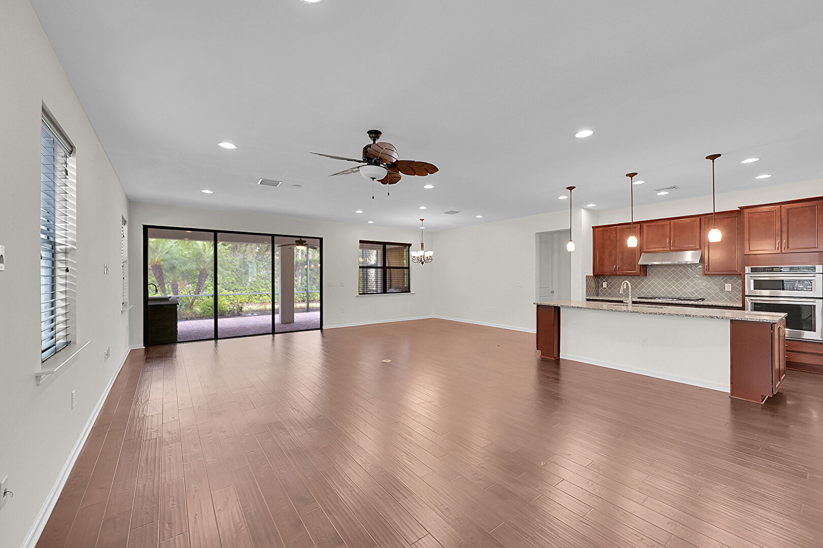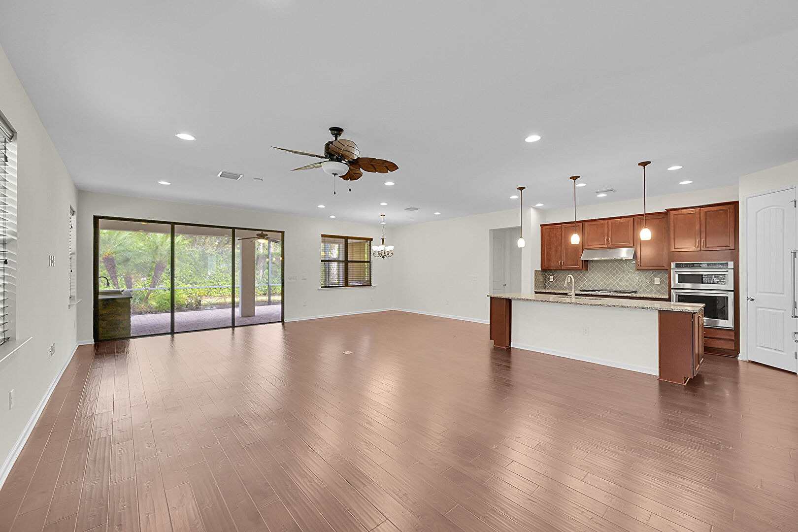 Baseboards Wall, Ceiling Fan, Double Oven, Drywall, L Shaped Kitchen, Natural Light, Notable Chandelier, Recessed Lighting, Stairs, Vent, Wood Finish Floor, Baseboards Wall, Drywall, Wood Finish Floor