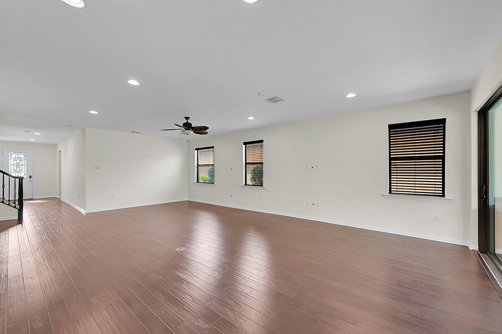 Baseboards Wall, Ceiling Fan, Drywall, Natural Light, Recessed Lighting, Stairs, Vent, Wood Finish Floor, Carpet, Vent